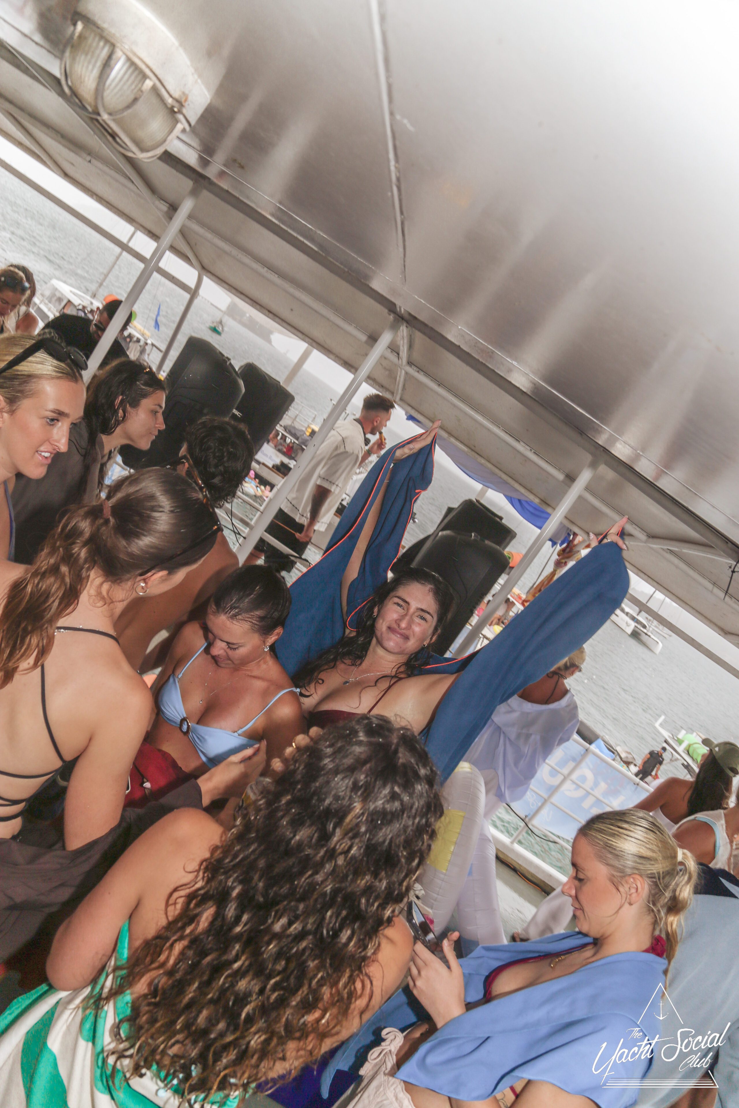 A group of women in swimsuits are dancing and socializing on a covered boat deck, with one woman in the center raising her arms and smiling. The atmosphere is lively, and water and boats are visible outside.