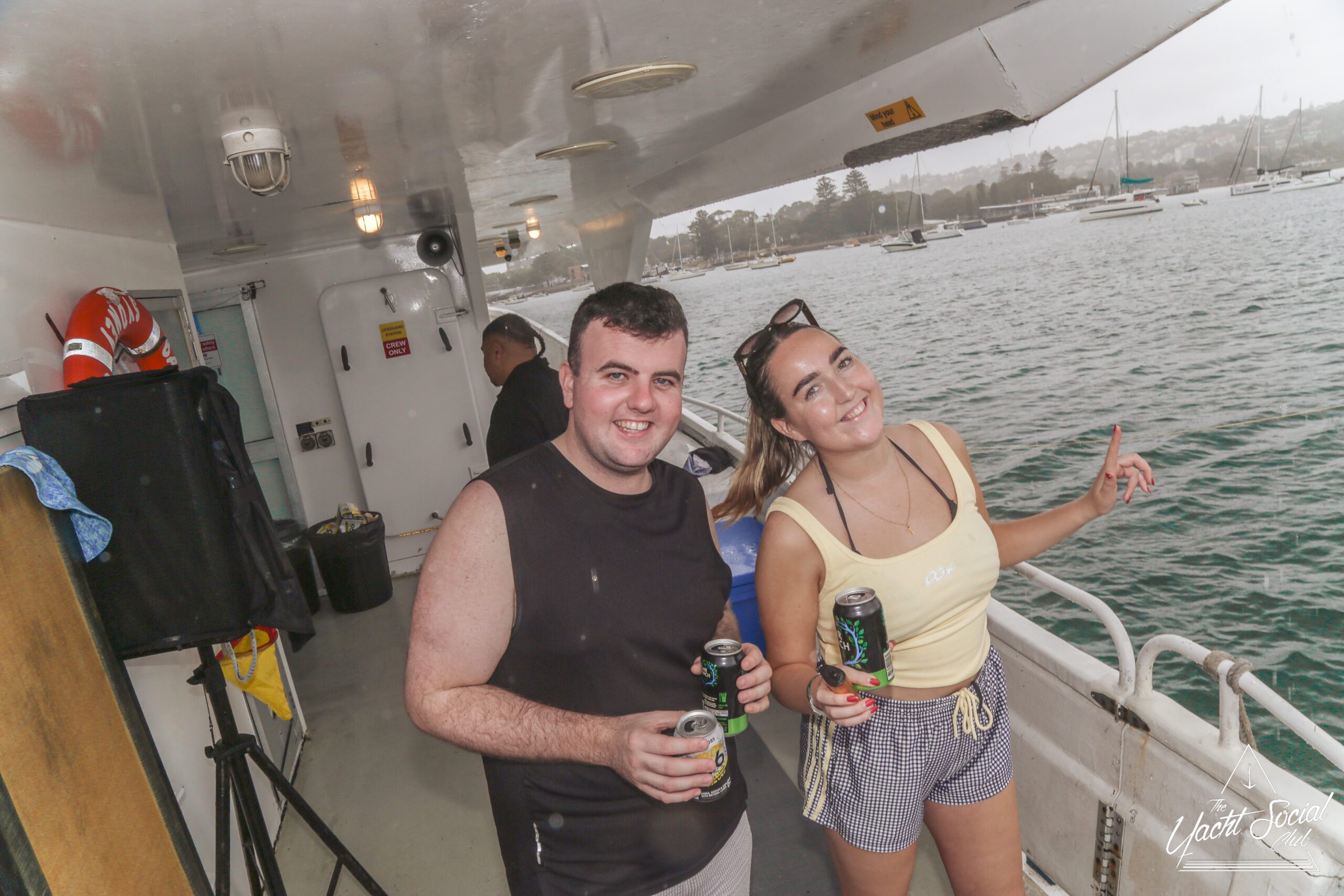 Two people smiling and holding drinks on a boat, with water and anchored boats in the background. The weather appears cloudy, and the boat deck has various equipment visible.