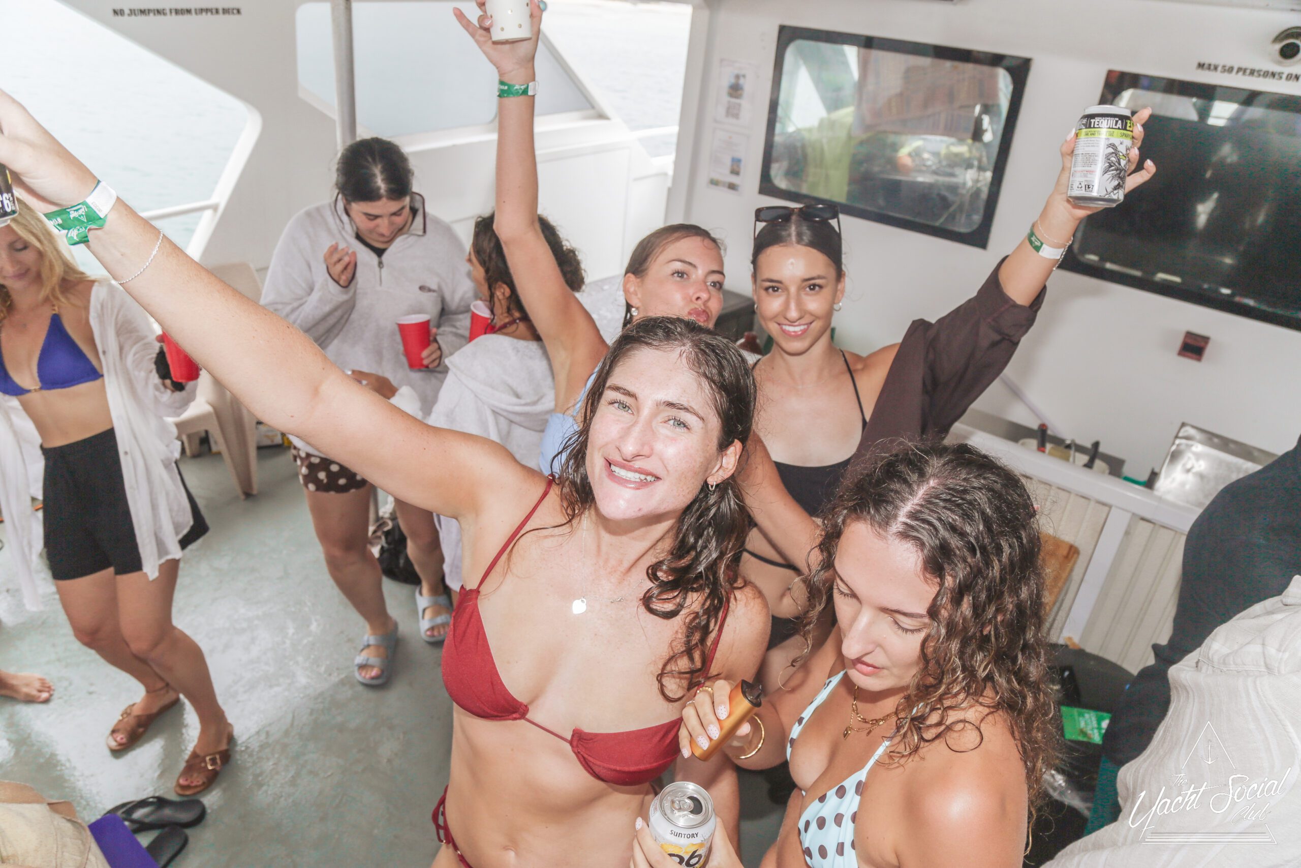 A group of young women in swimsuits and beachwear enjoy drinks and dance on a boat, smiling and raising their arms in celebration. The atmosphere is lively and festive.
