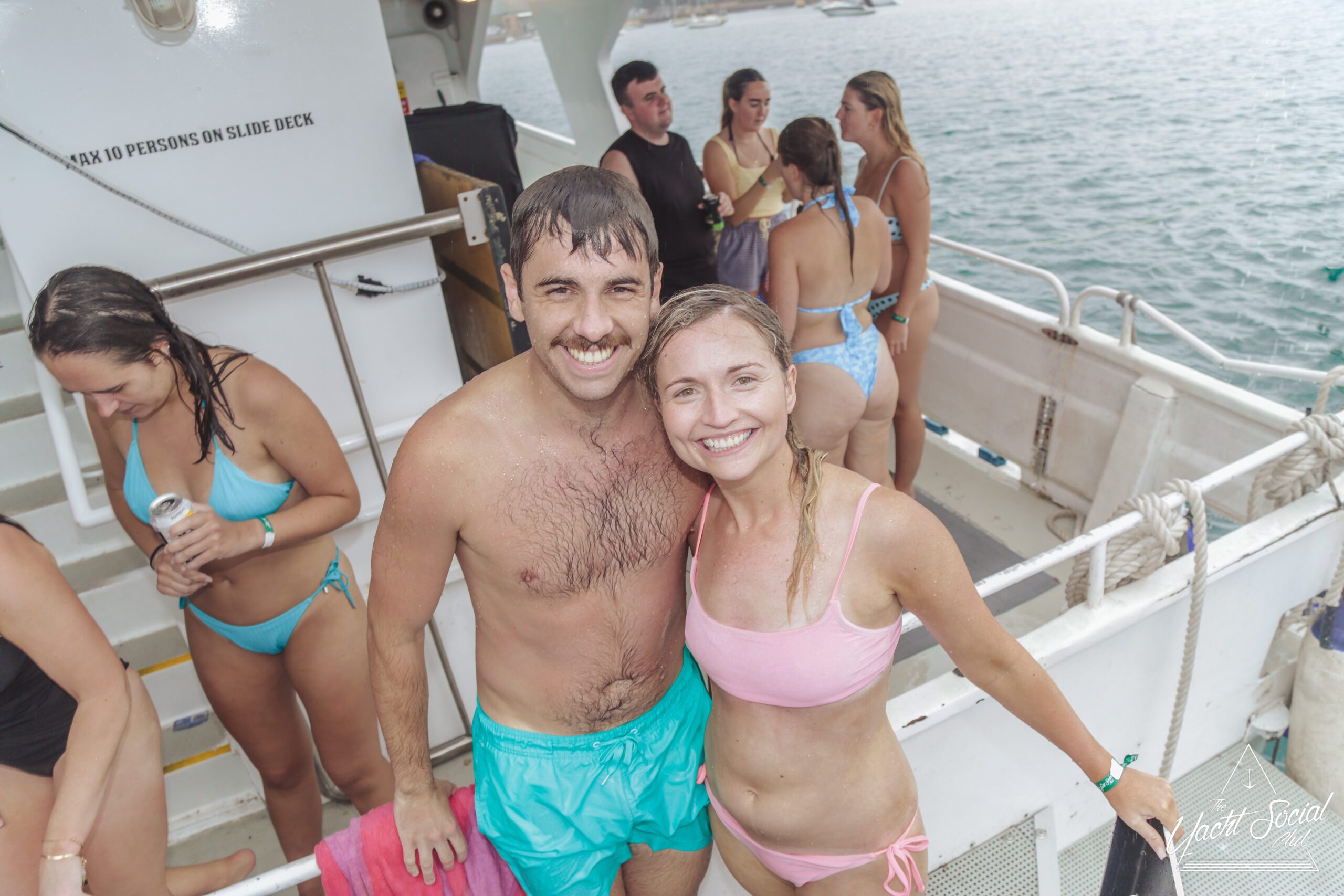 A smiling man and woman in swimsuits pose together on a boat deck with other people in swimwear in the background. The group appears to be enjoying a day on the water.