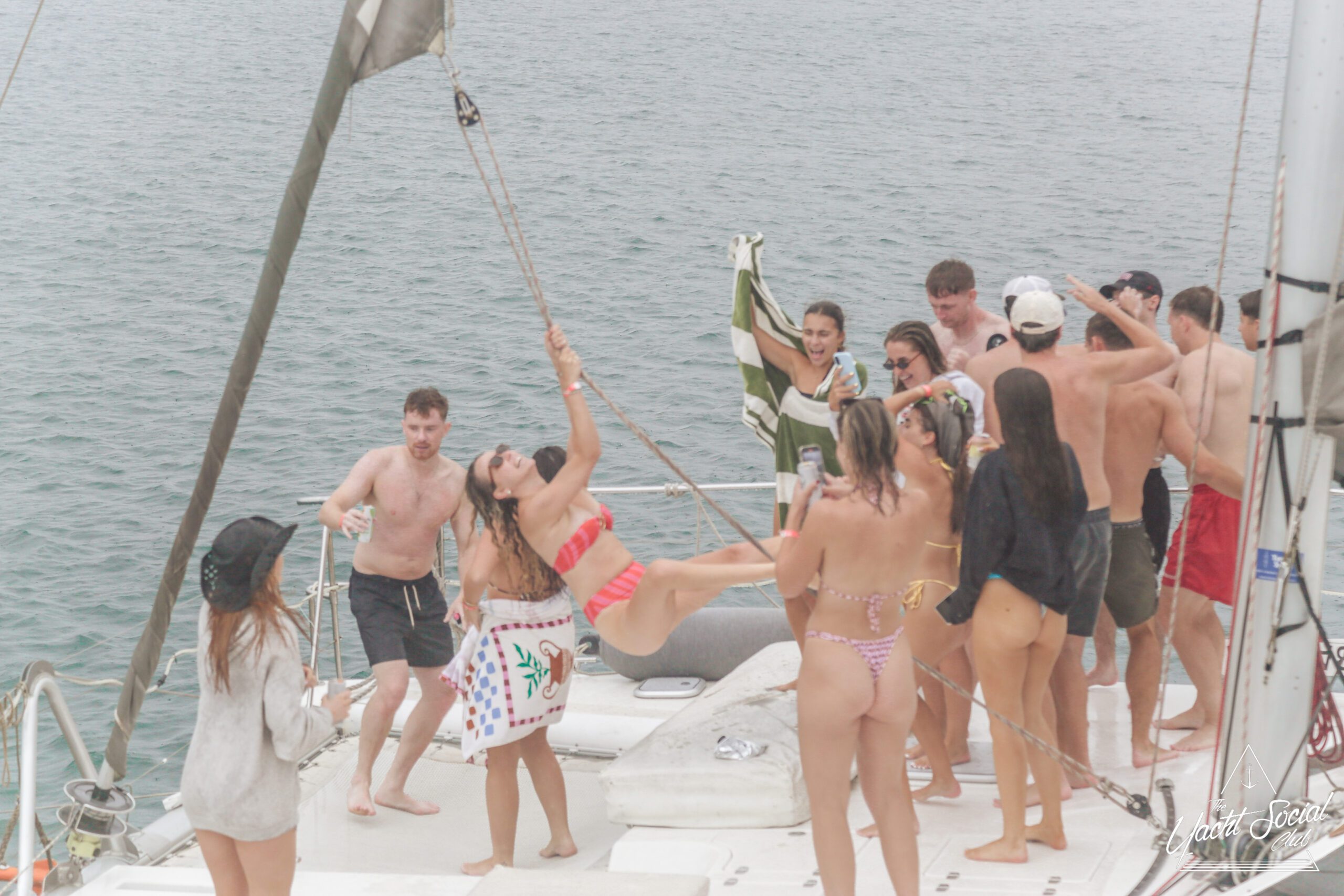A group of people in swimsuits and casual clothing dance, smile, and take photos on a covered boat deck during a lively party. Some hold drinks, and the atmosphere appears energetic and fun.