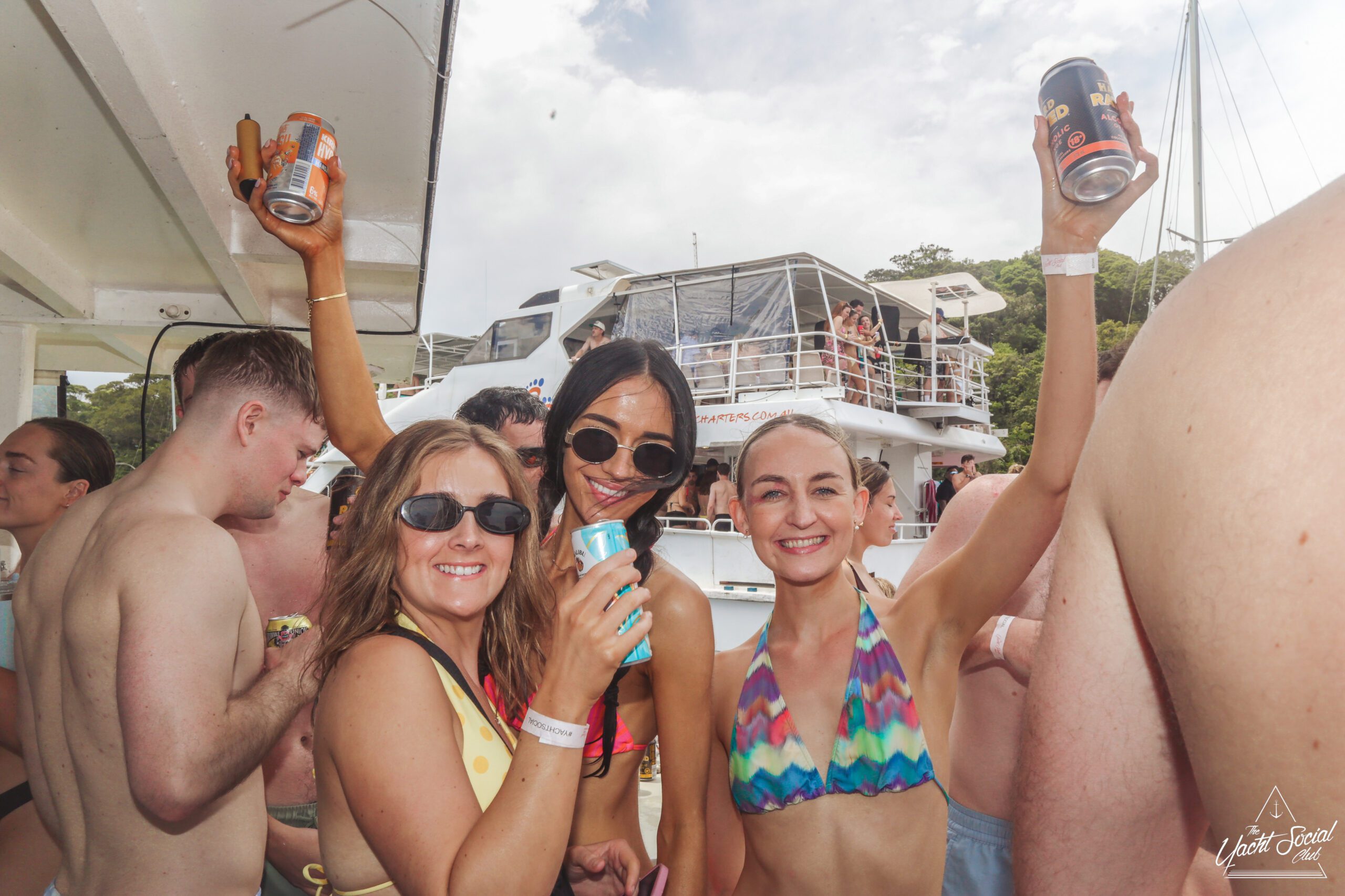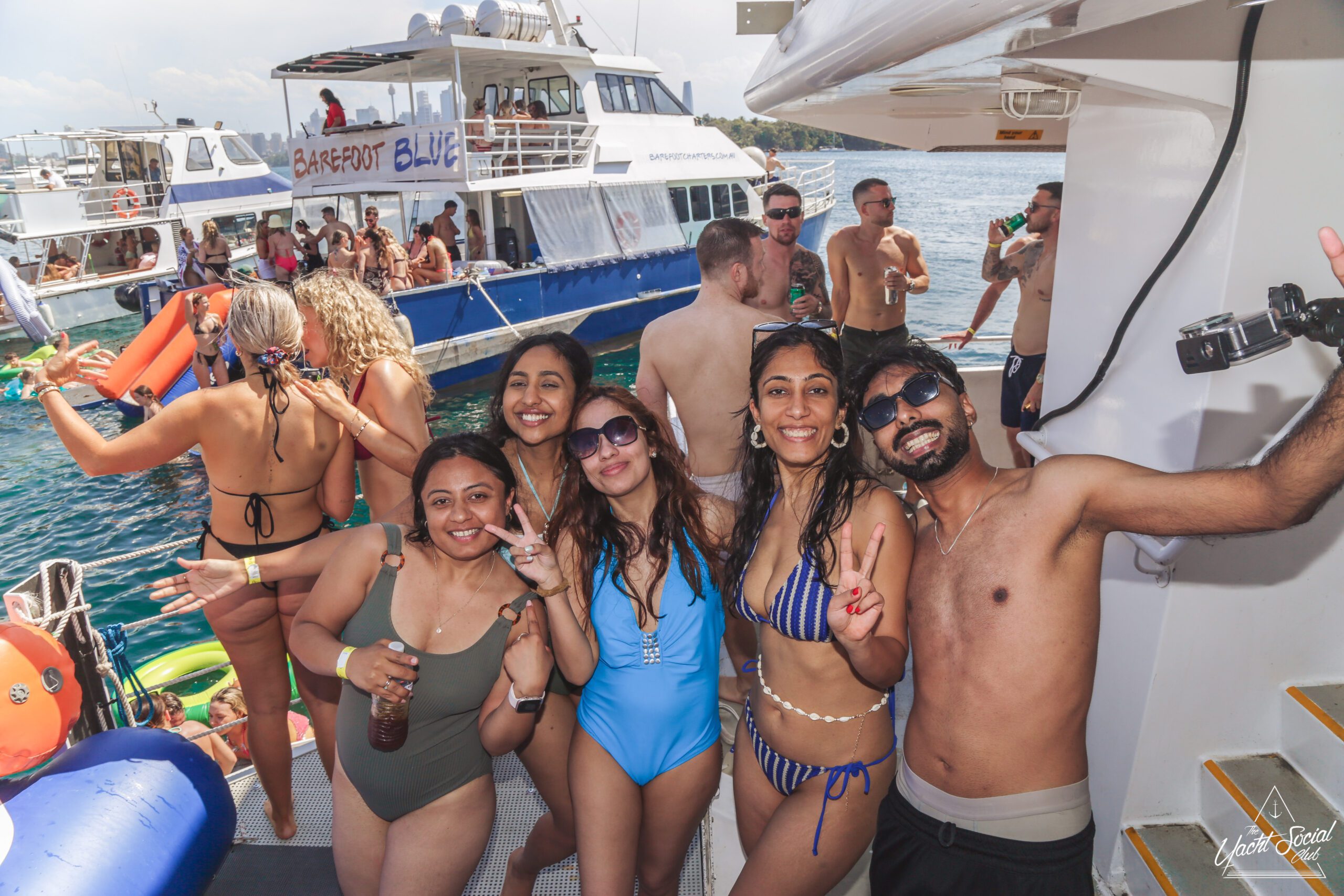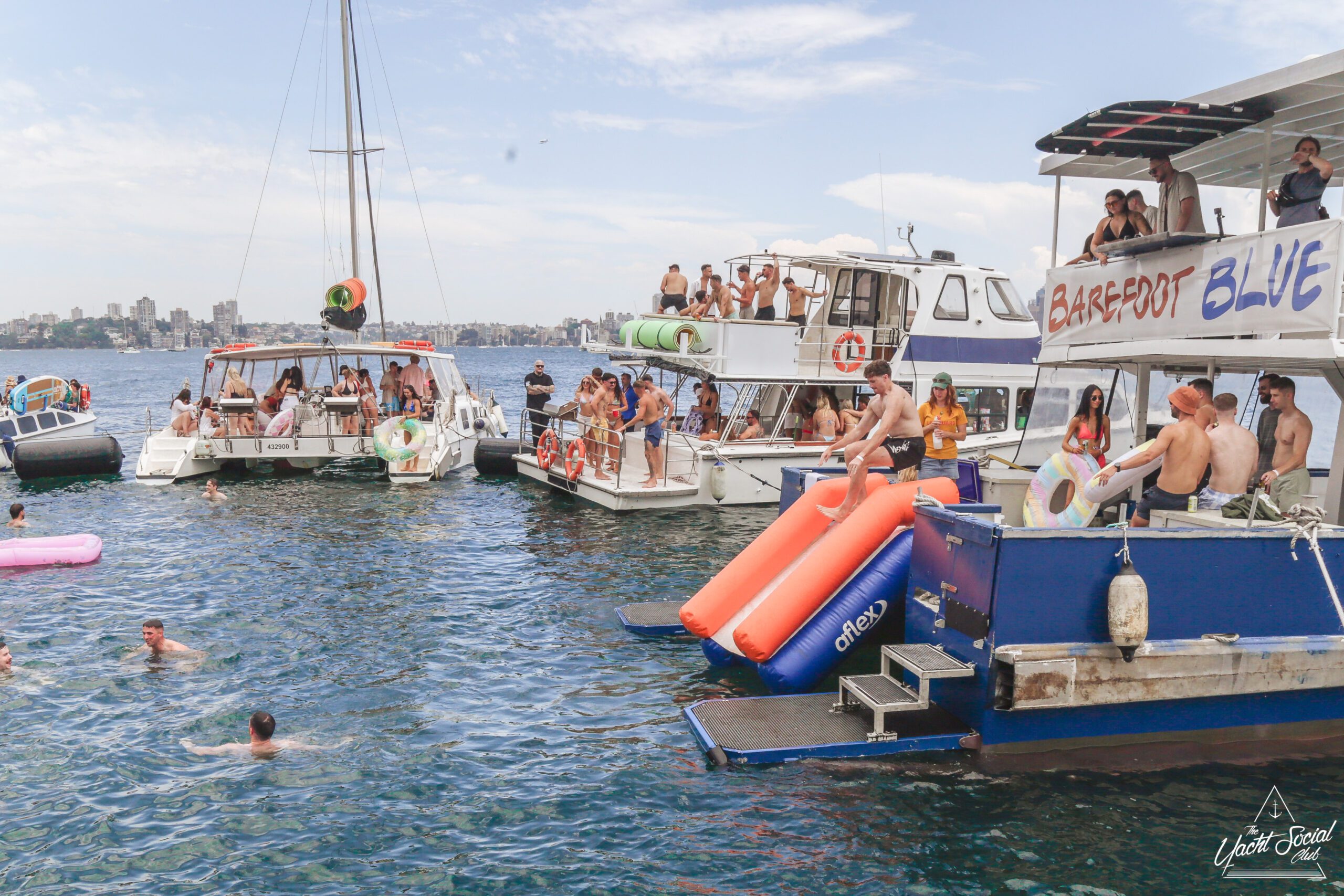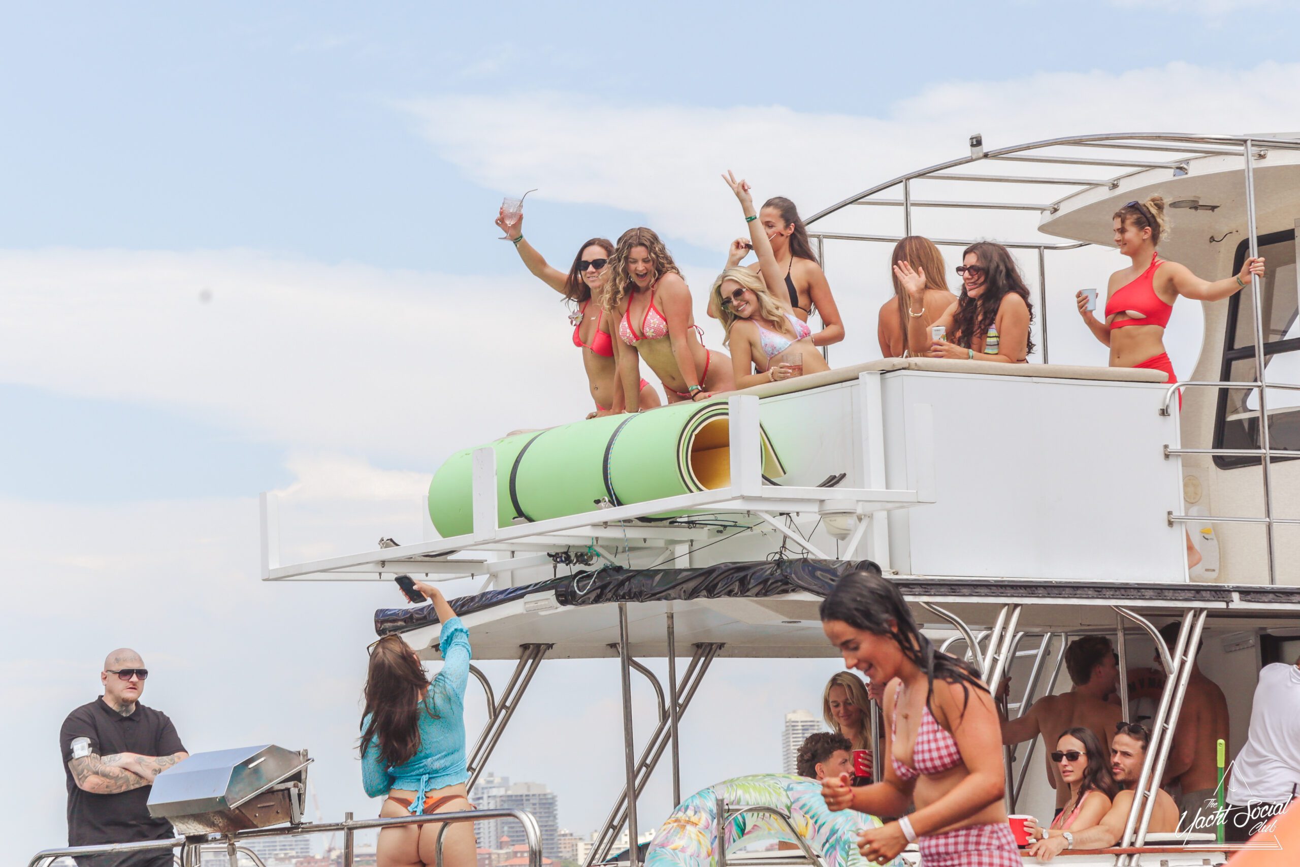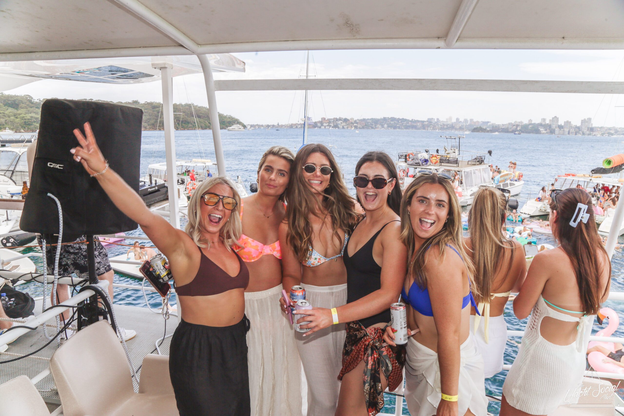 Three women in swimsuits smile and wave on a sunny boat deck, holding drinks. Behind them, people party and swim among several boats in the blue water, with a city skyline visible in the distance.