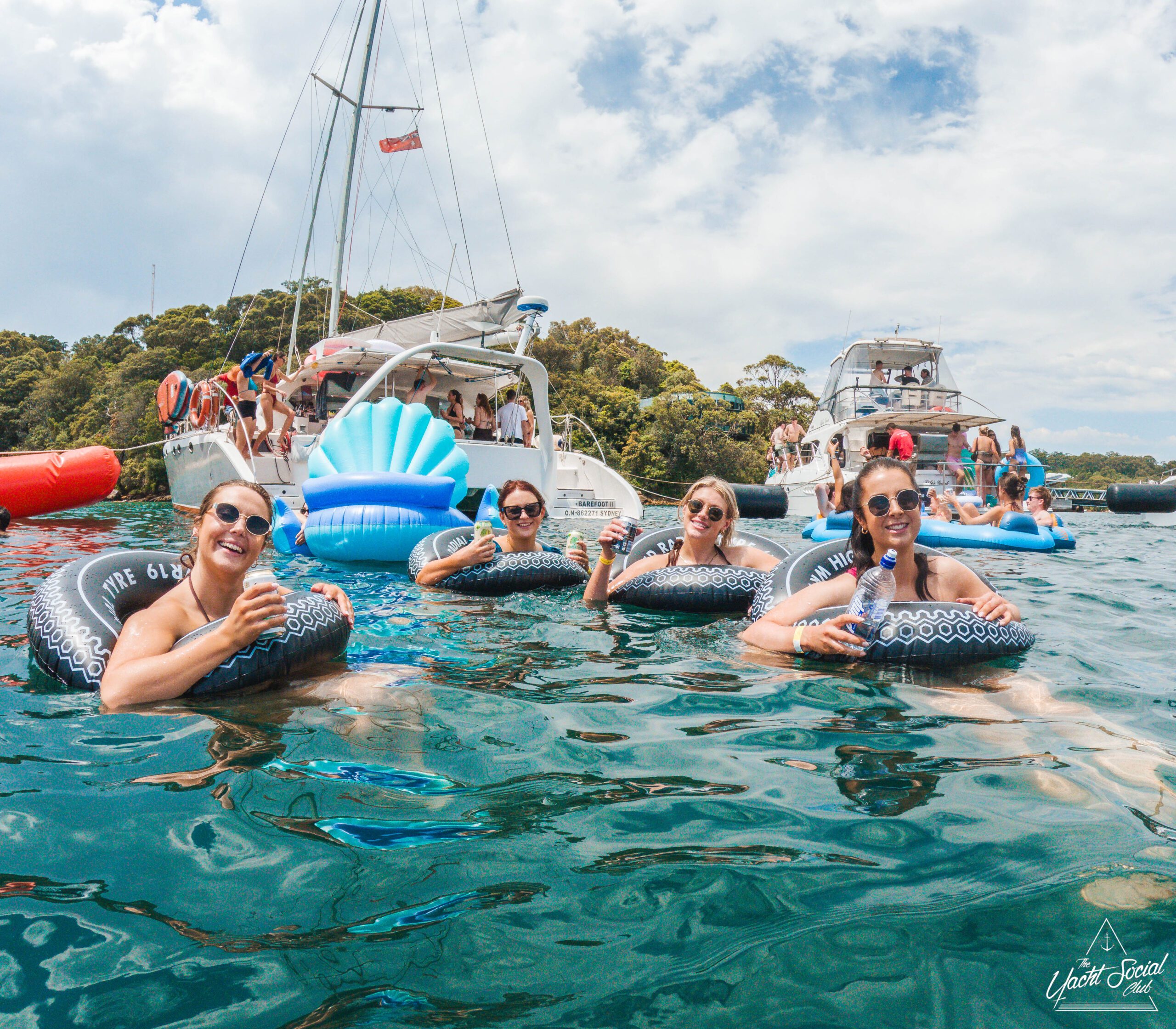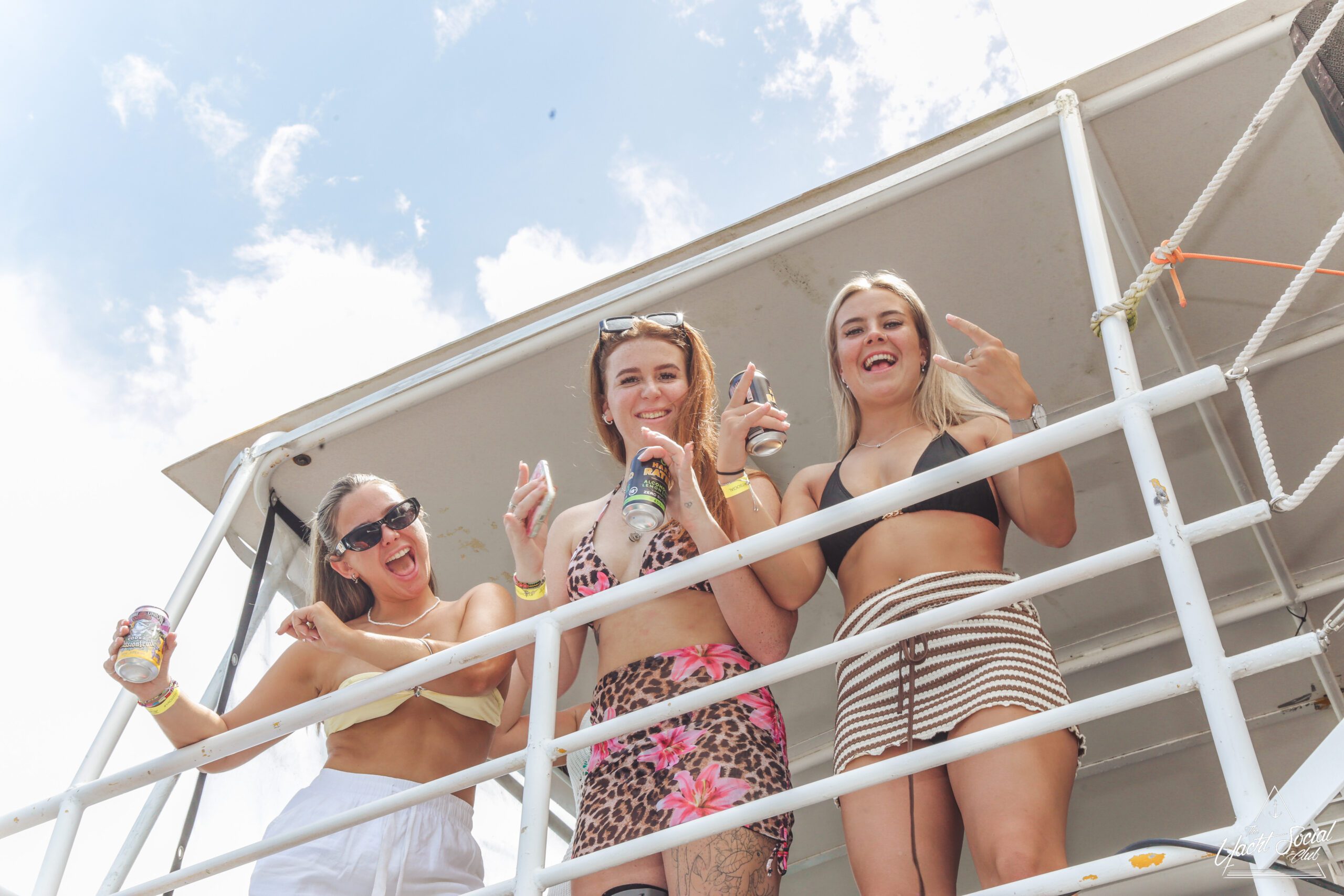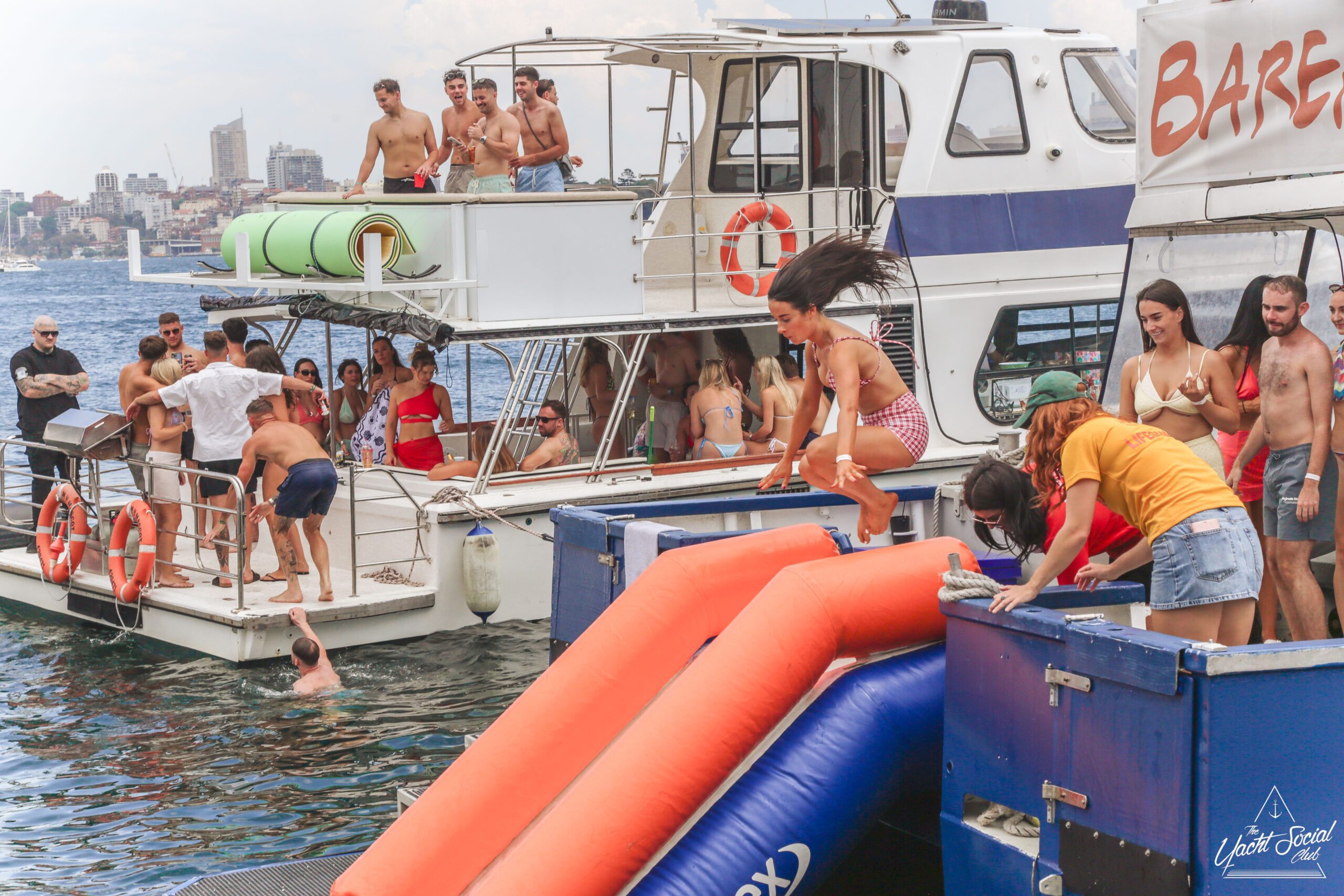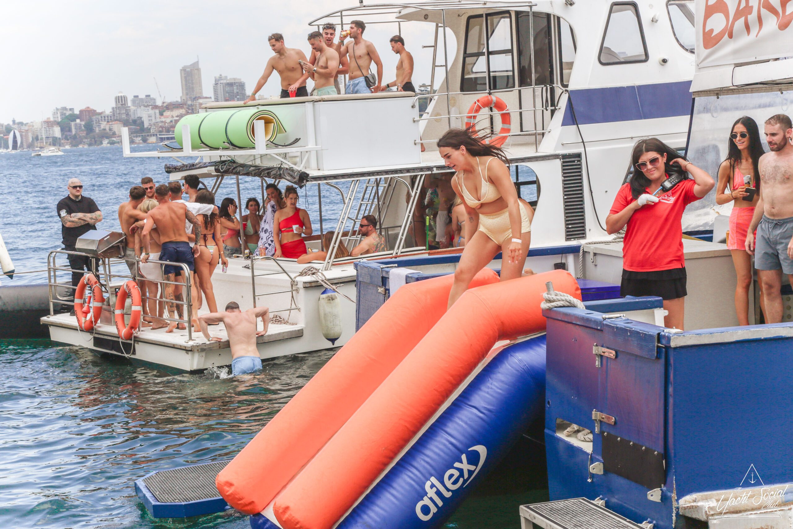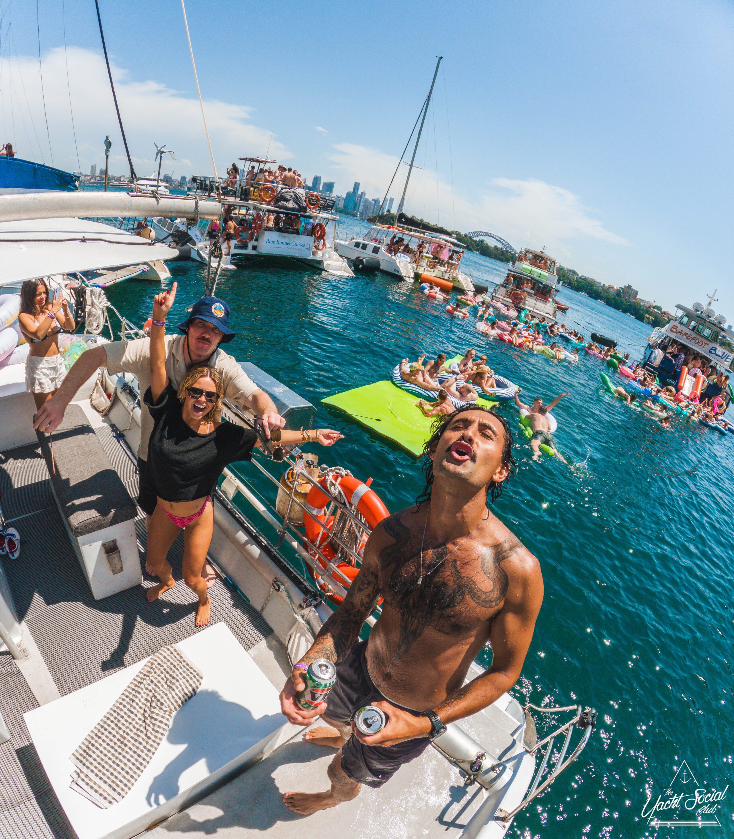 Three women in swimsuits smile and wave on a sunny boat deck, holding drinks. Behind them, people party and swim among several boats in the blue water, with a city skyline visible in the distance.