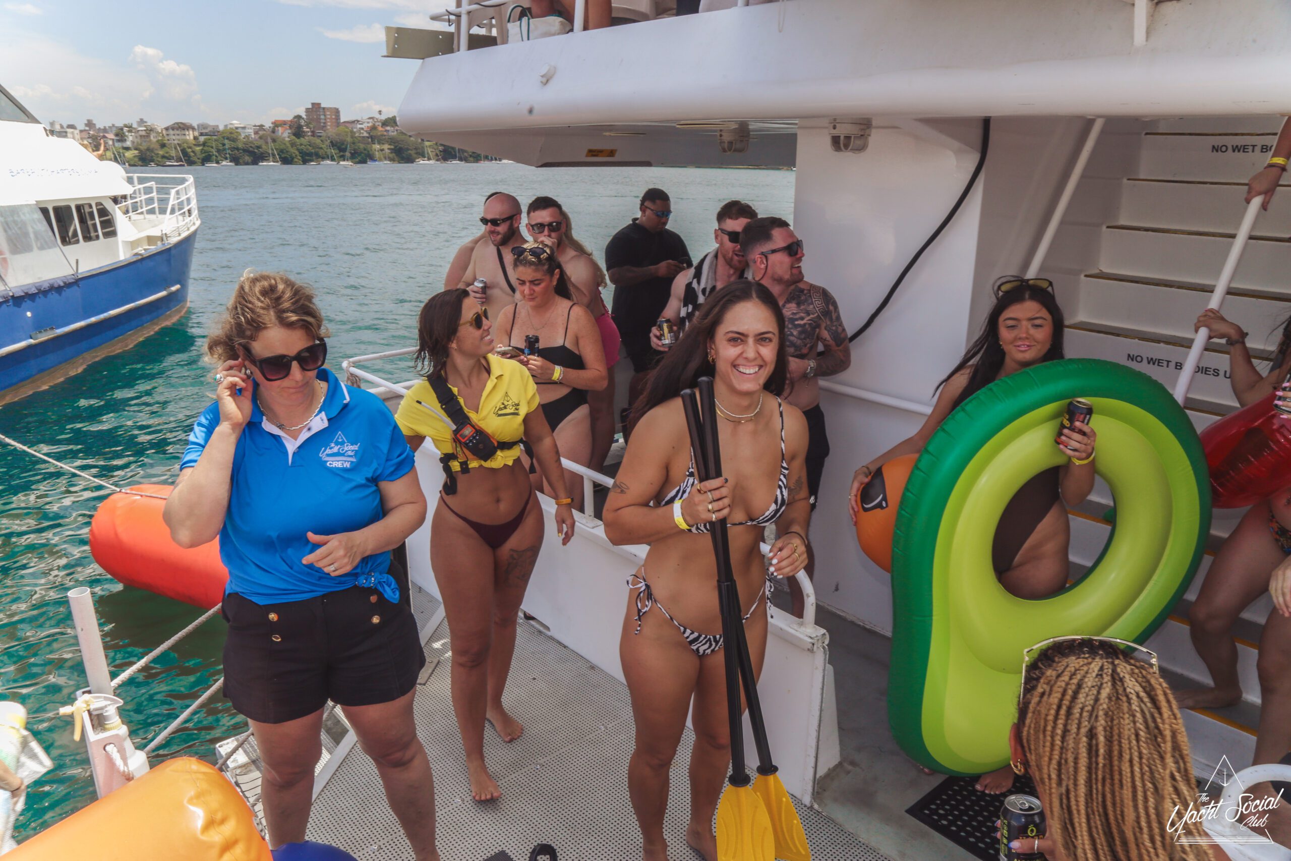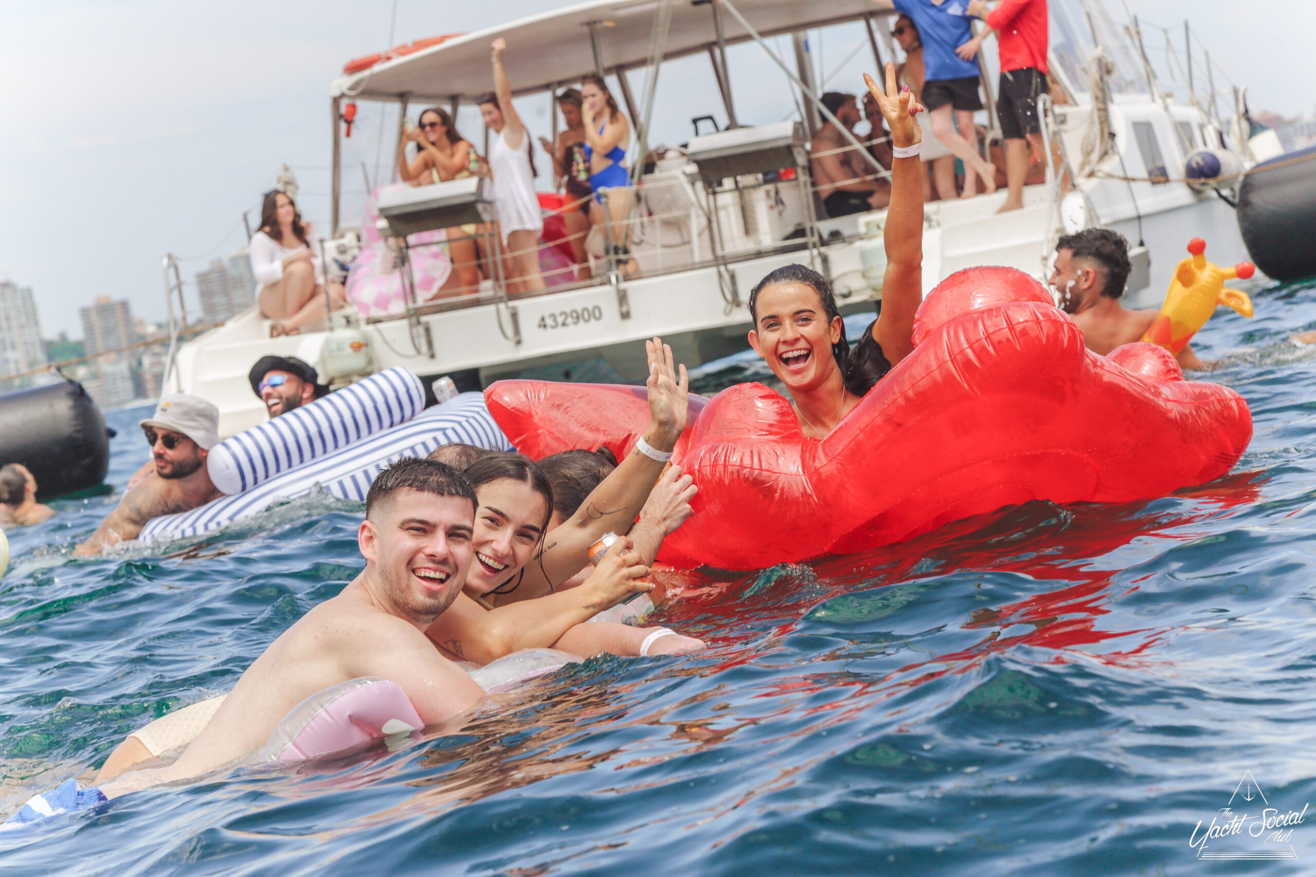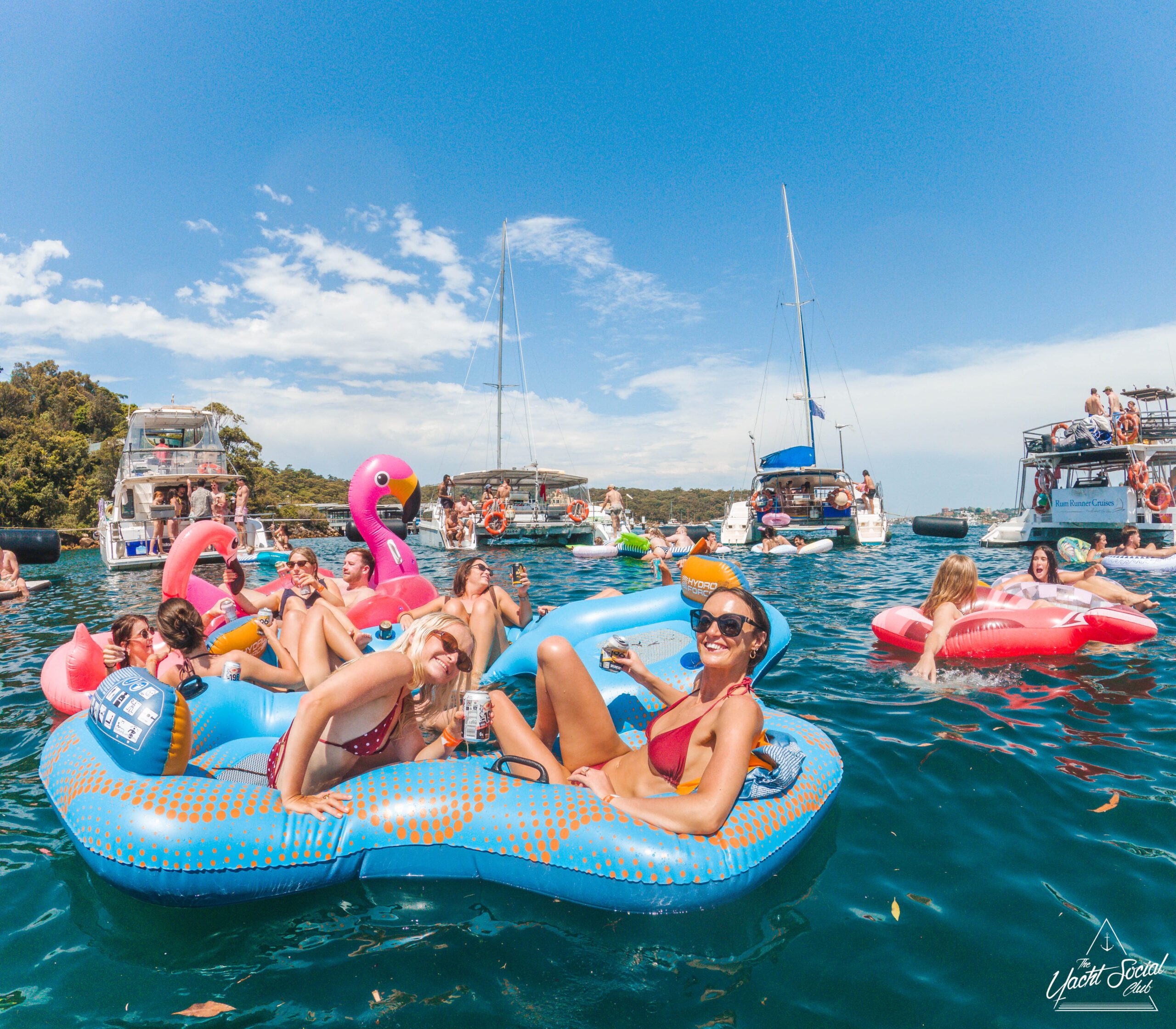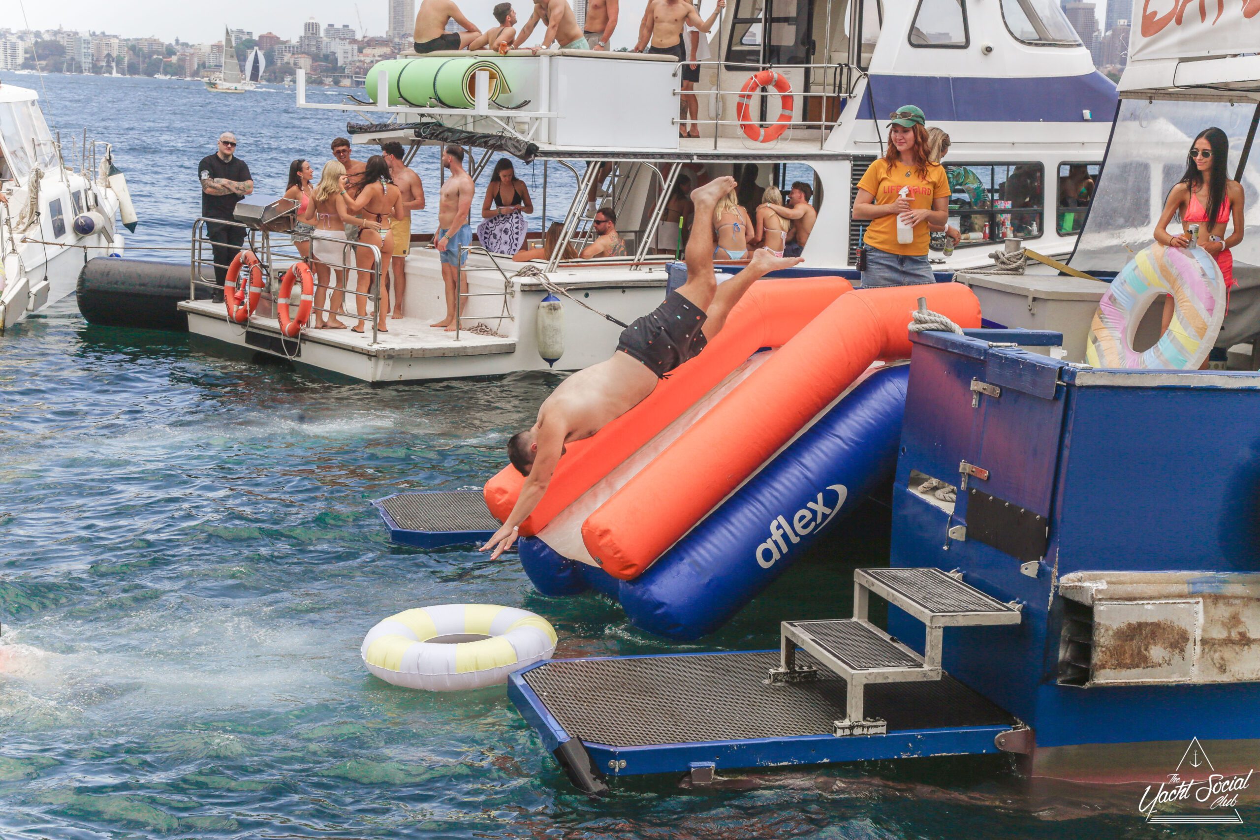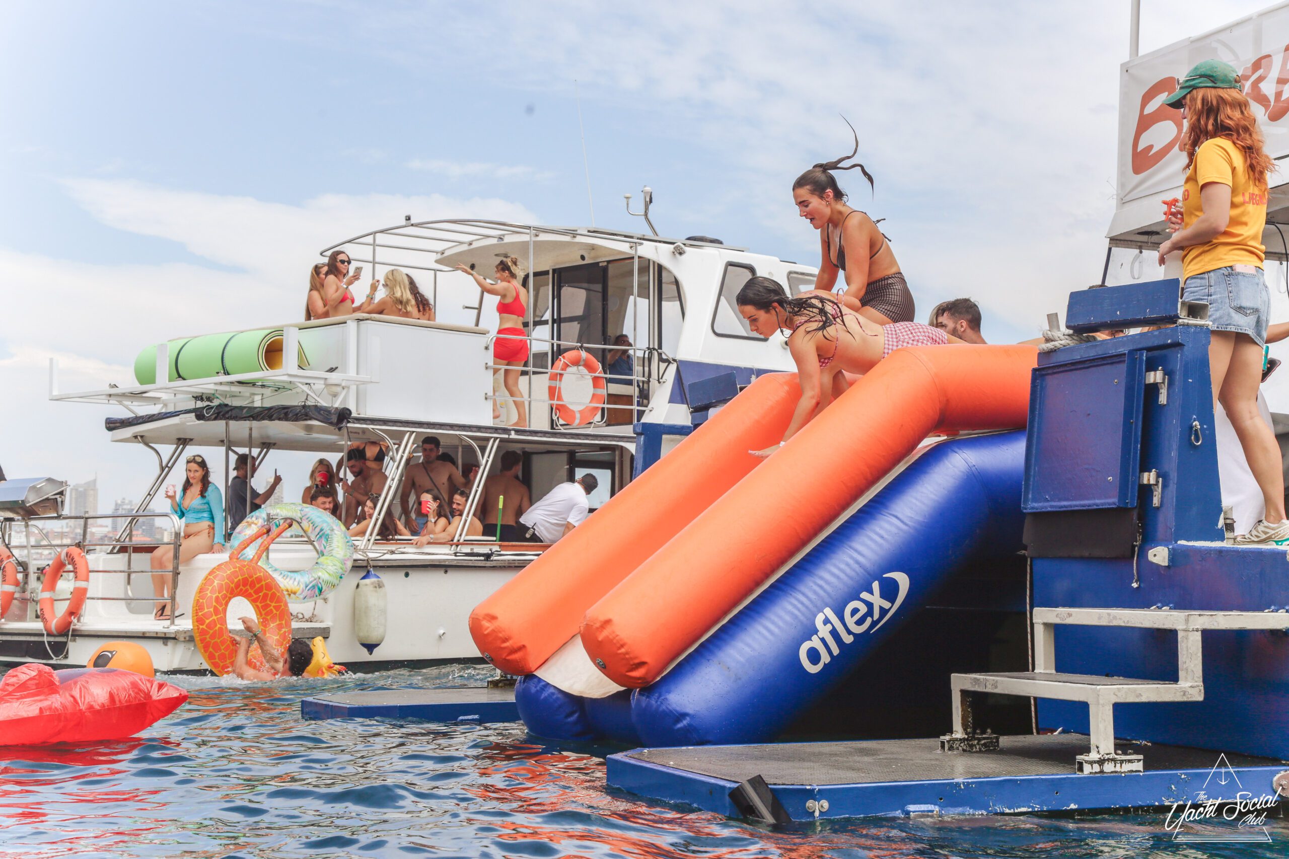 Three women in swimsuits smile and wave on a sunny boat deck, holding drinks. Behind them, people party and swim among several boats in the blue water, with a city skyline visible in the distance.
