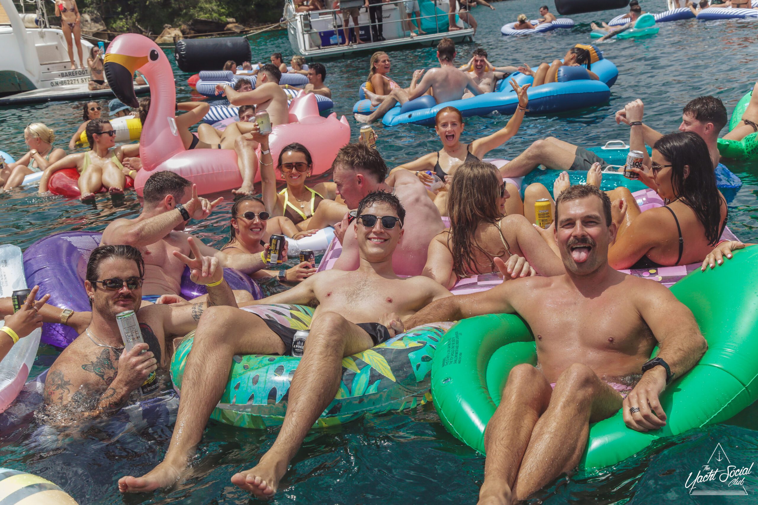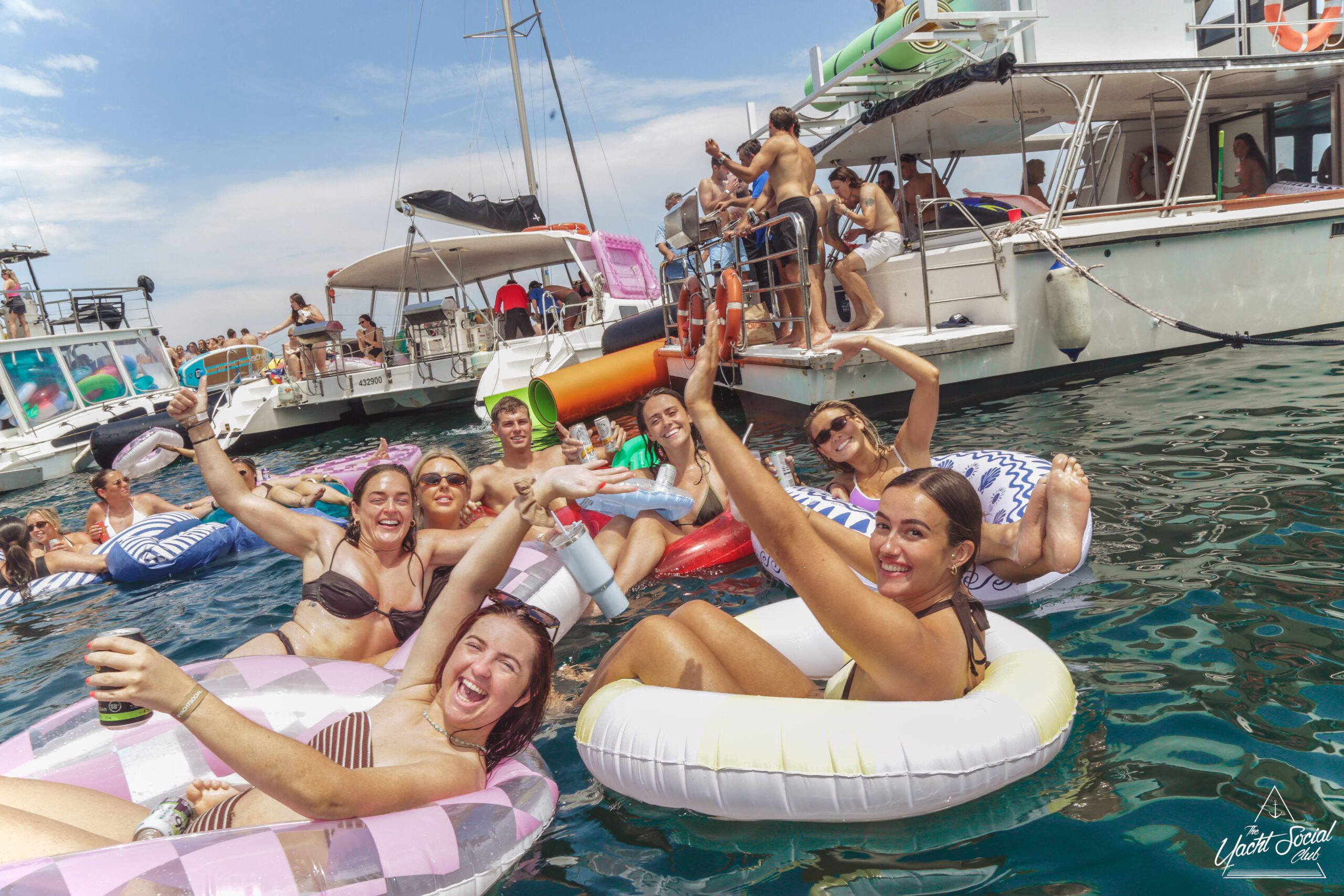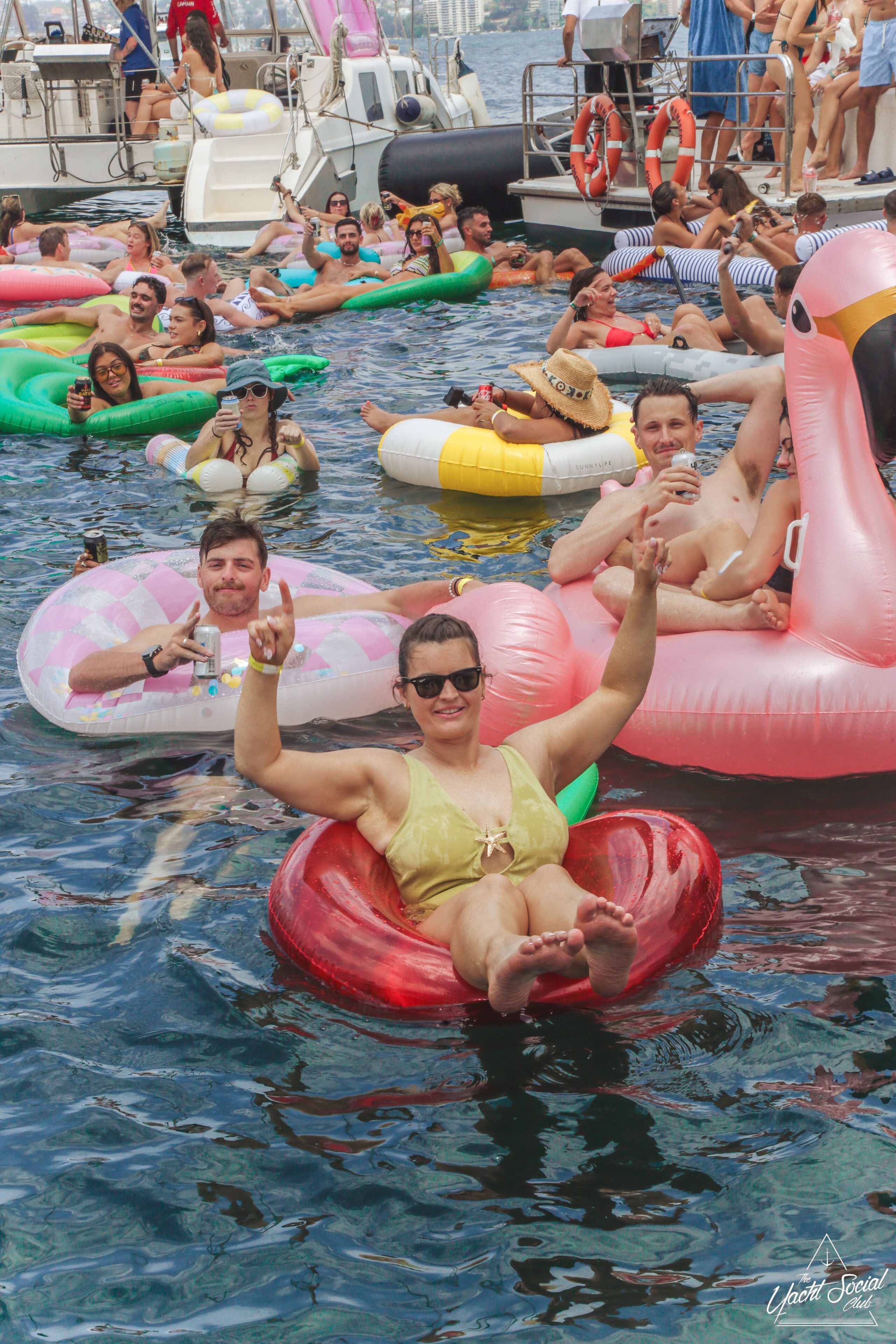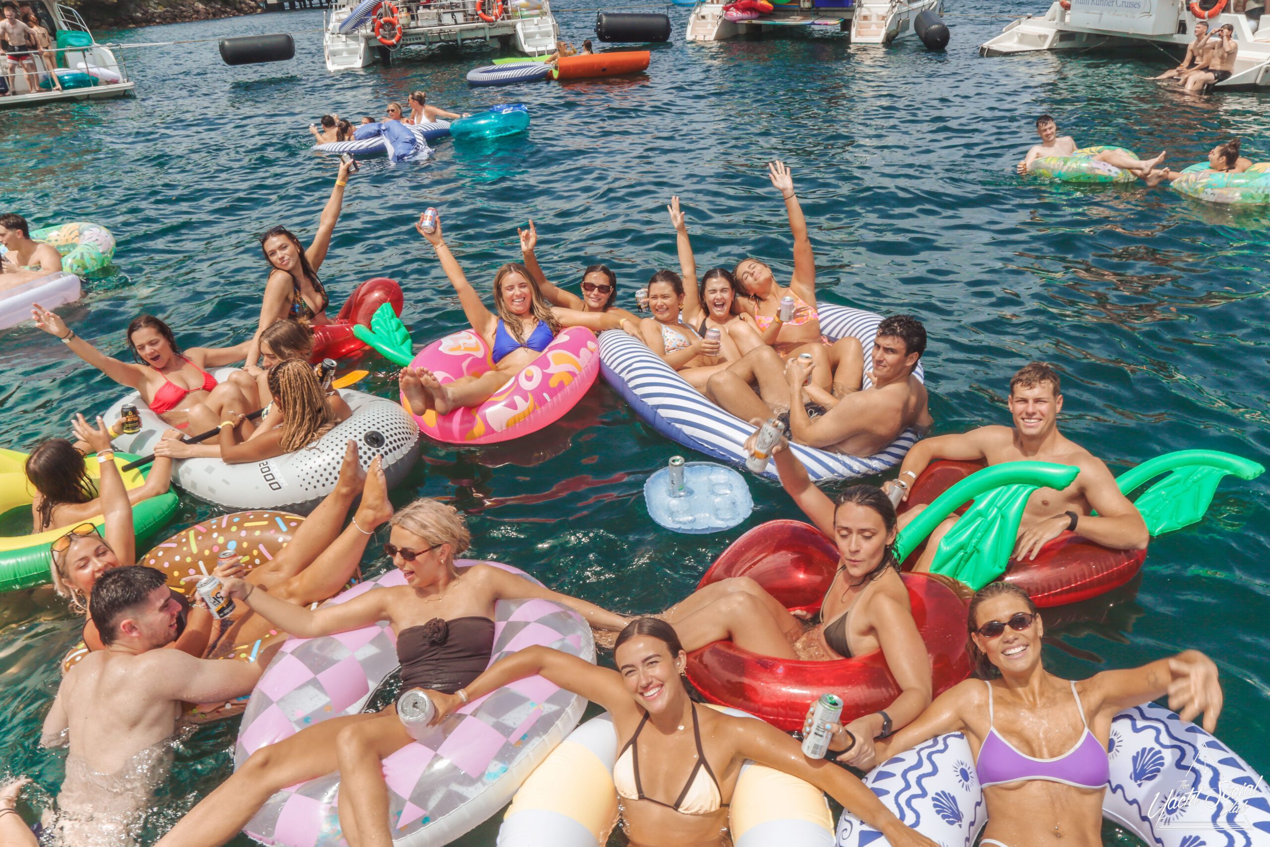 A group of smiling young adults relax on inflatable floats in the water near yachts, holding drinks and making peace signs, with more people socializing on the boats under a sunny sky.
