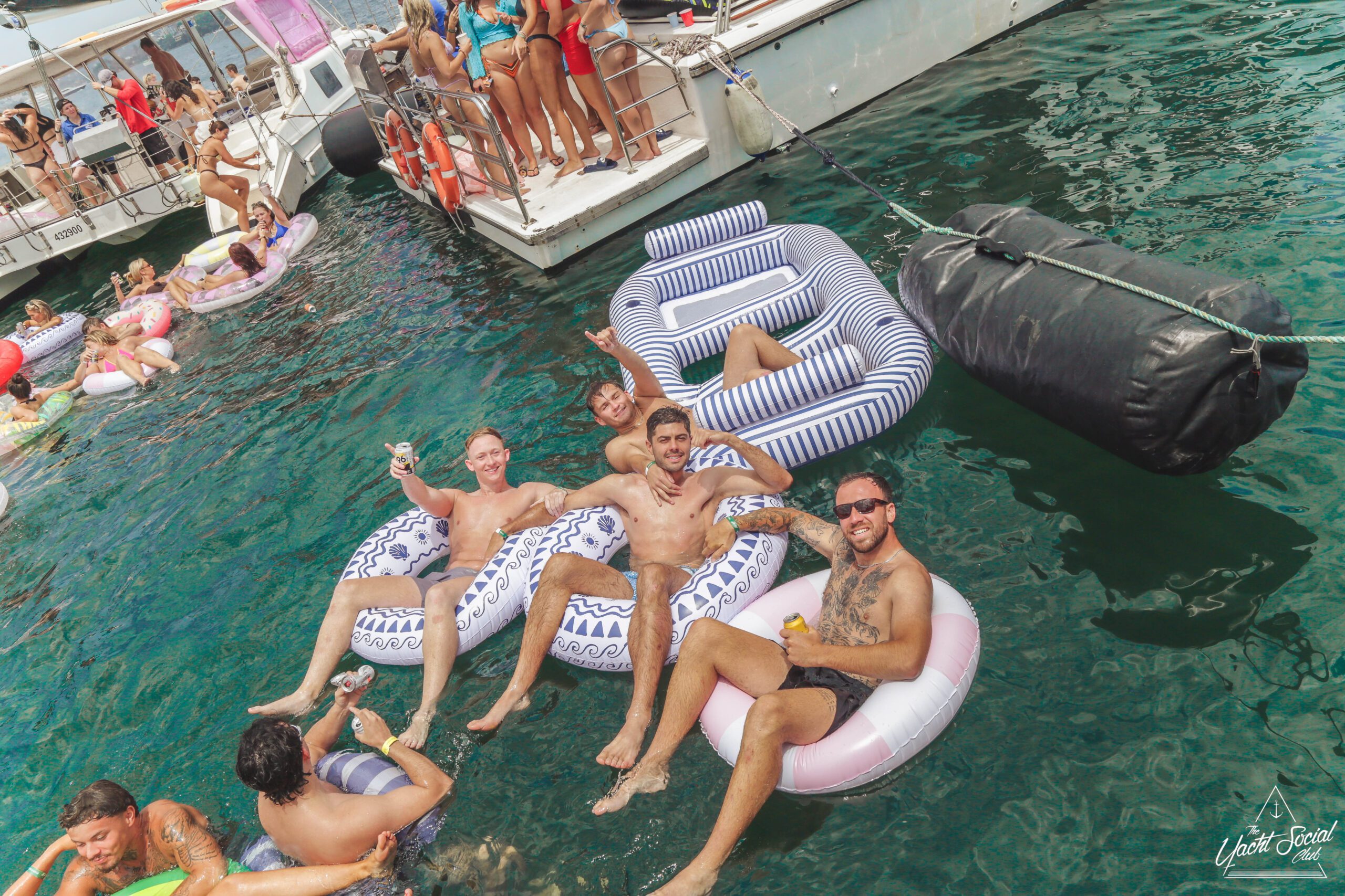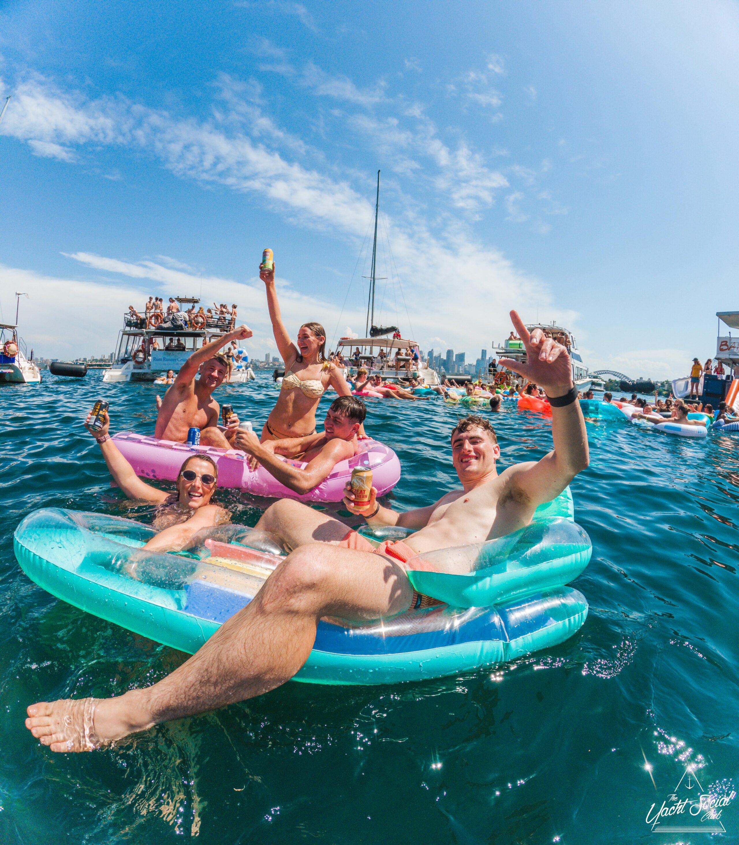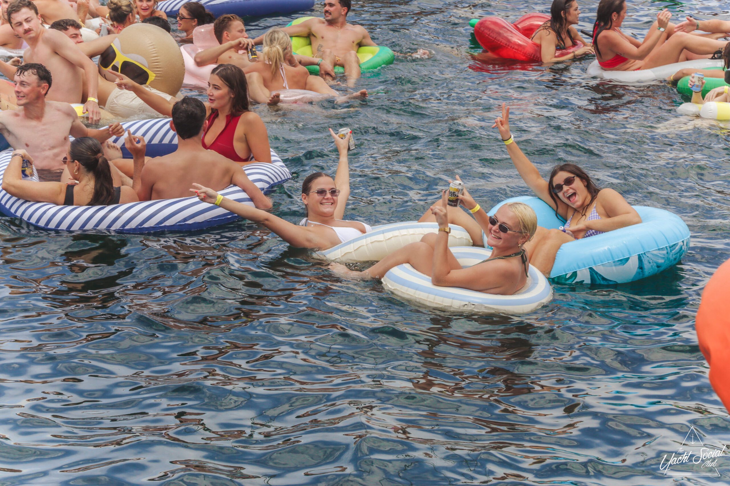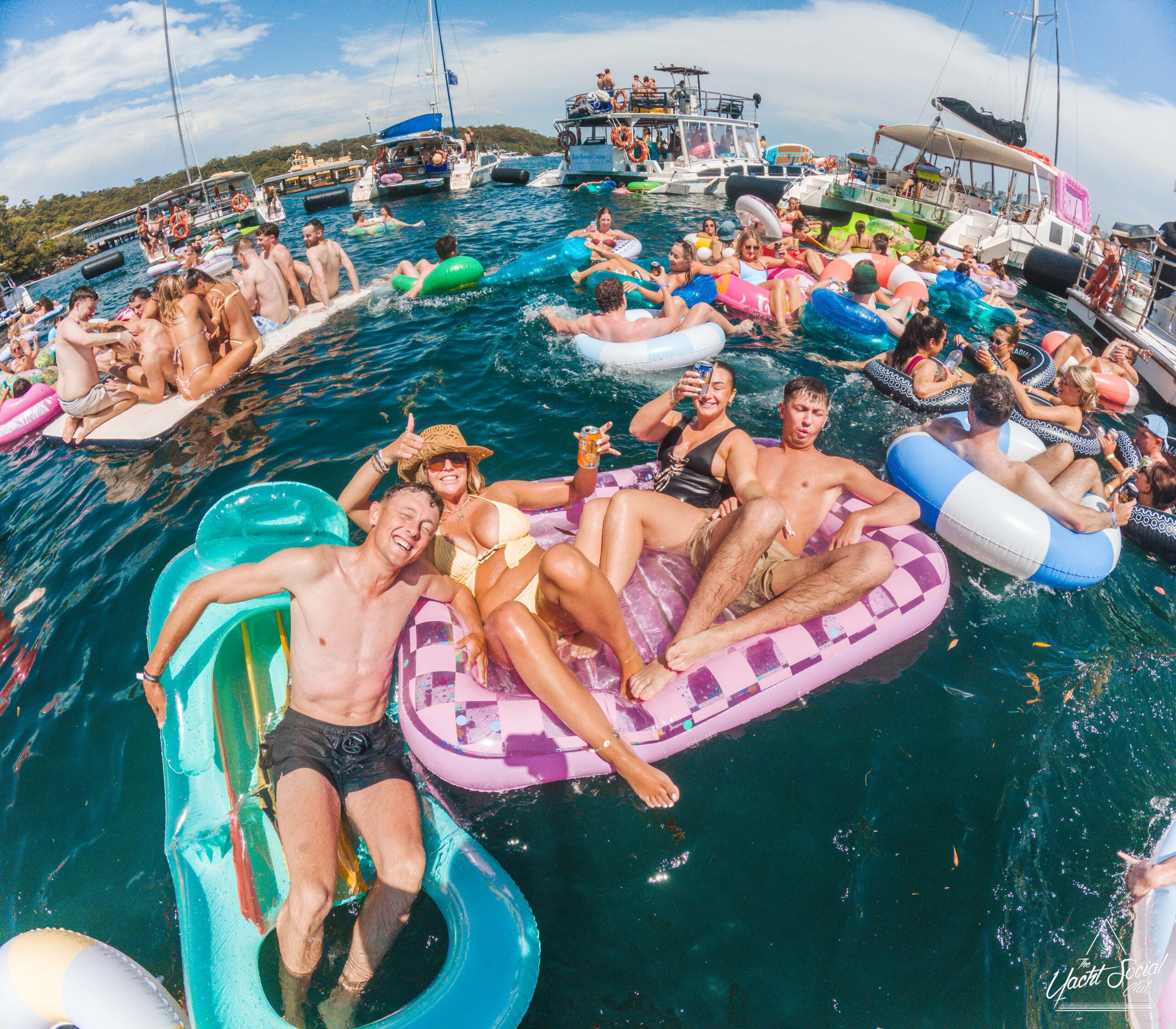 A group of smiling young adults relax on inflatable floats in the water near yachts, holding drinks and making peace signs, with more people socializing on the boats under a sunny sky.