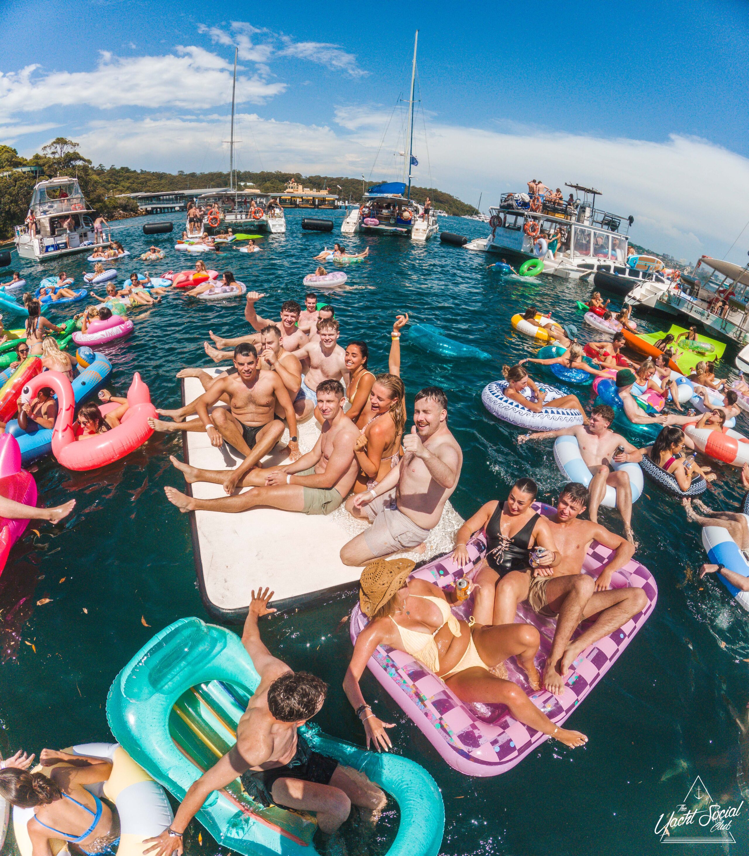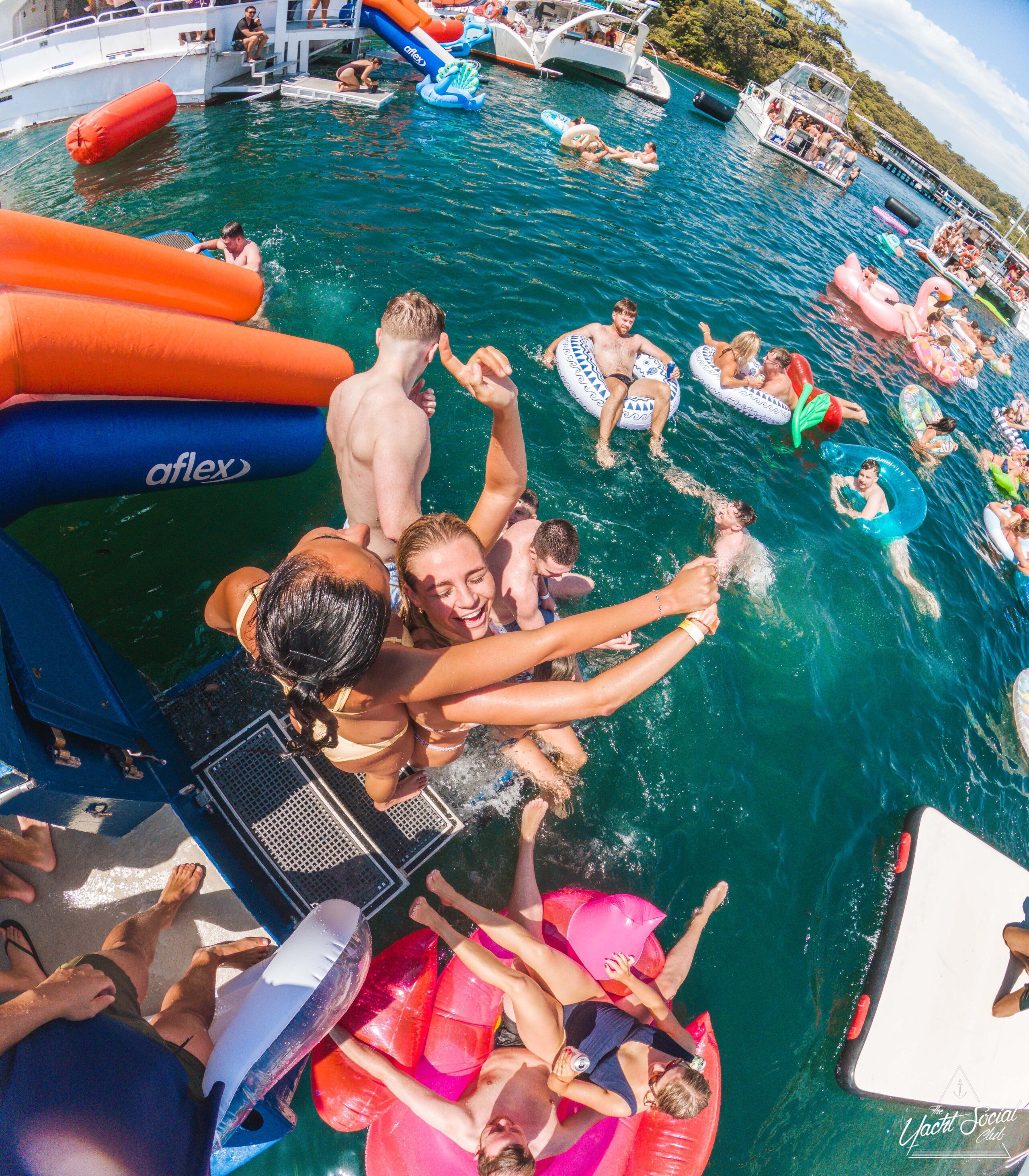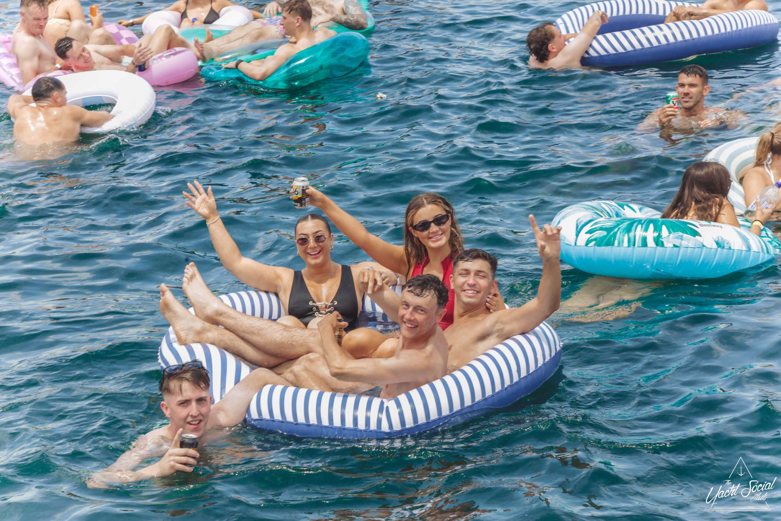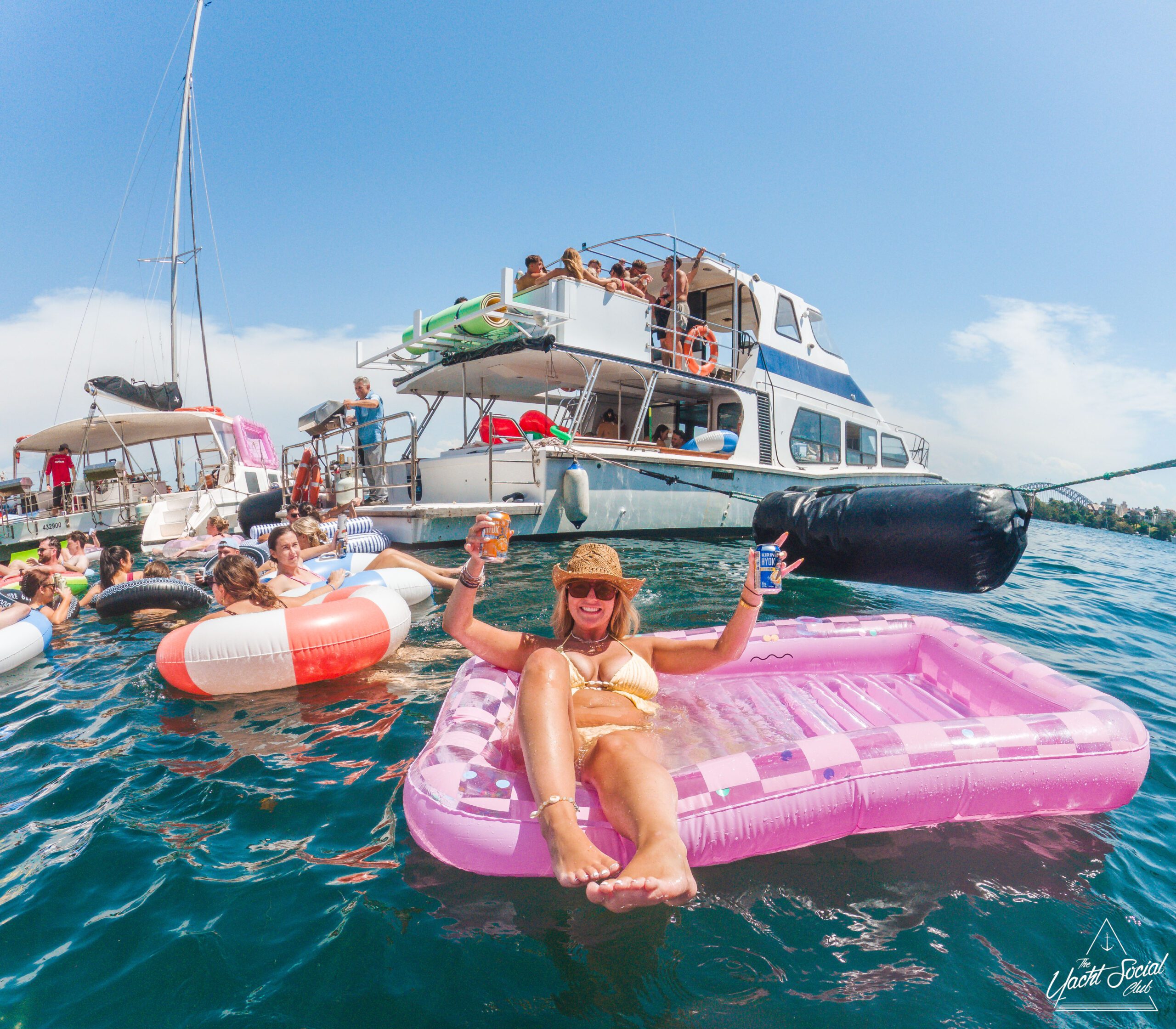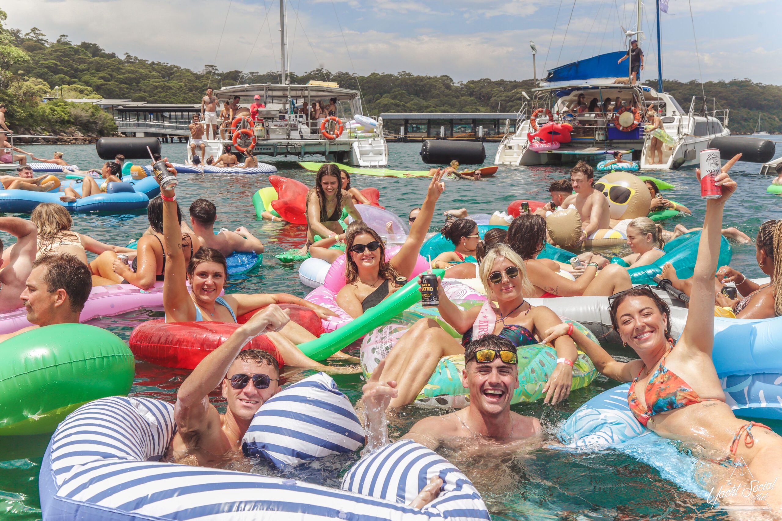 A group of smiling young adults relax on inflatable floats in the water near yachts, holding drinks and making peace signs, with more people socializing on the boats under a sunny sky.