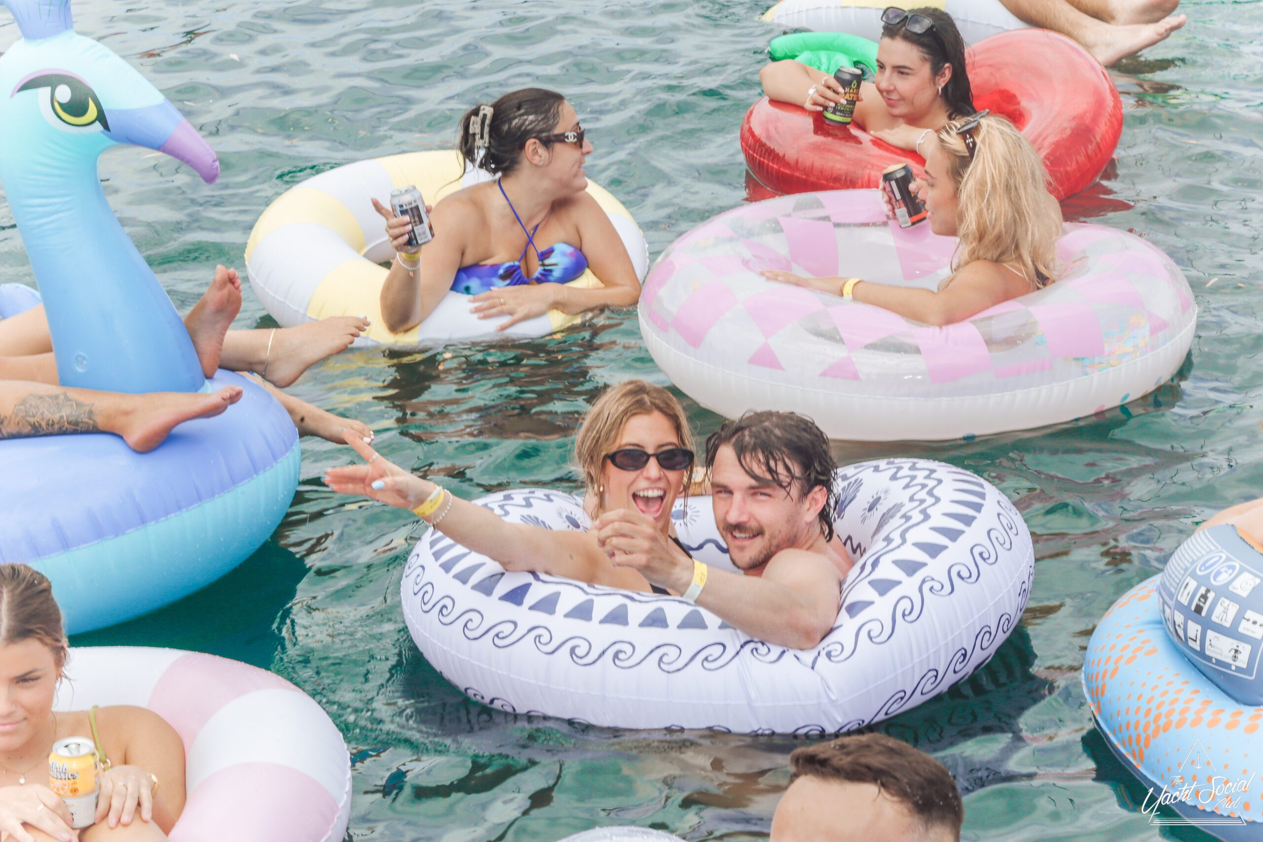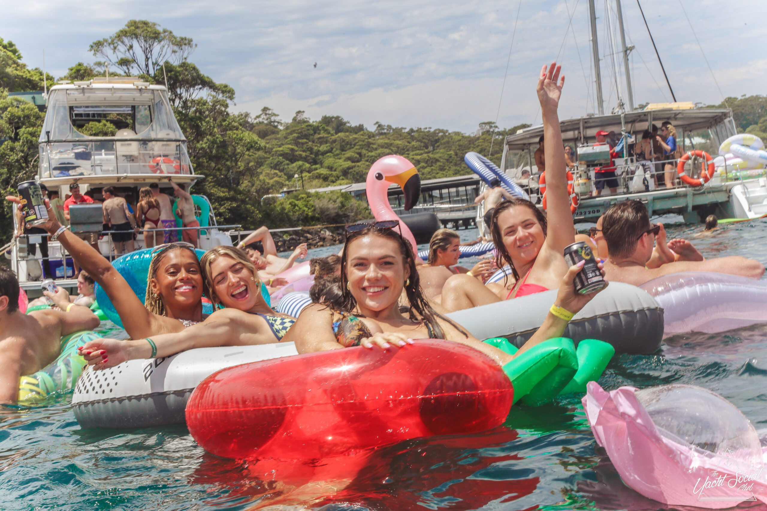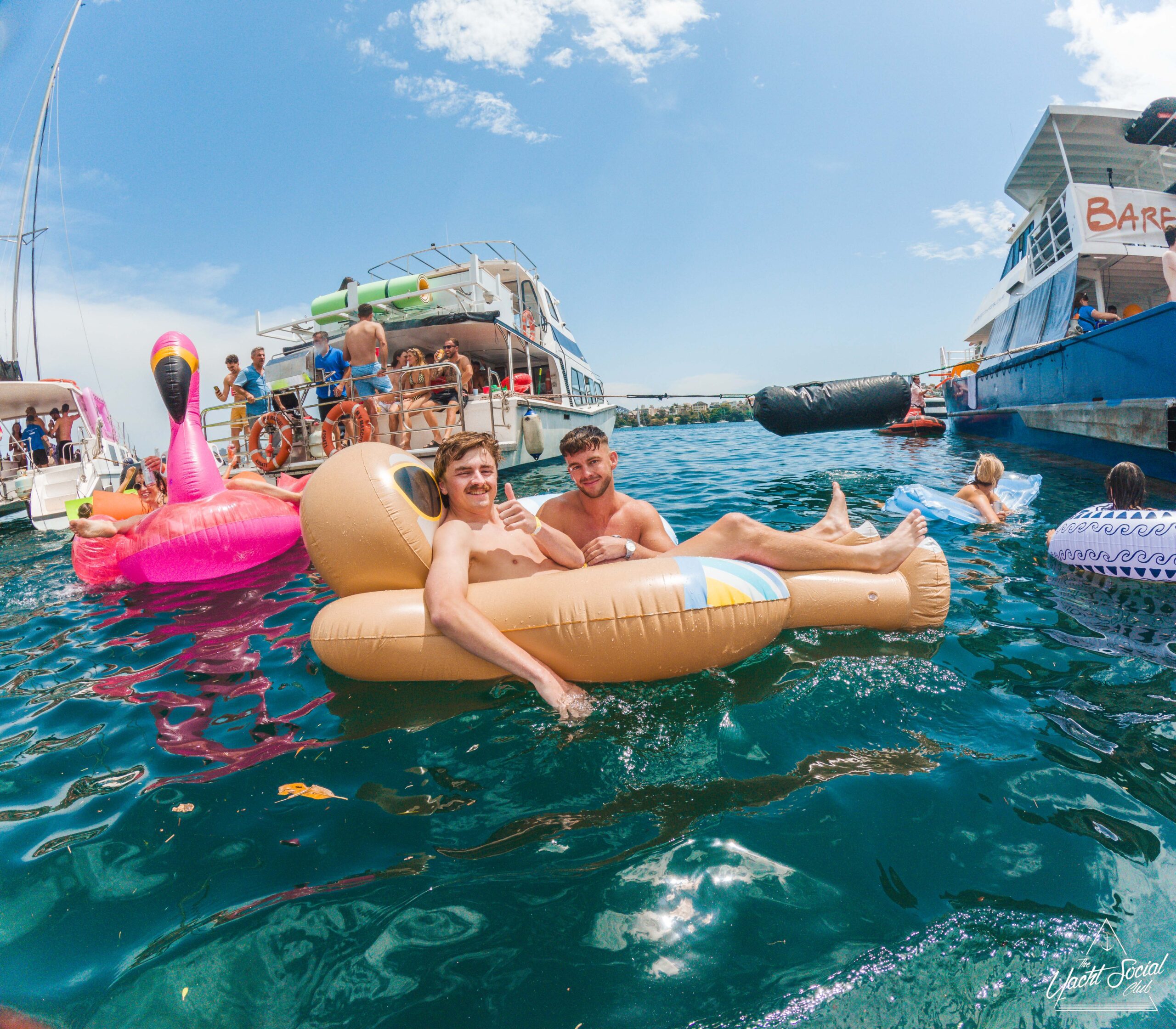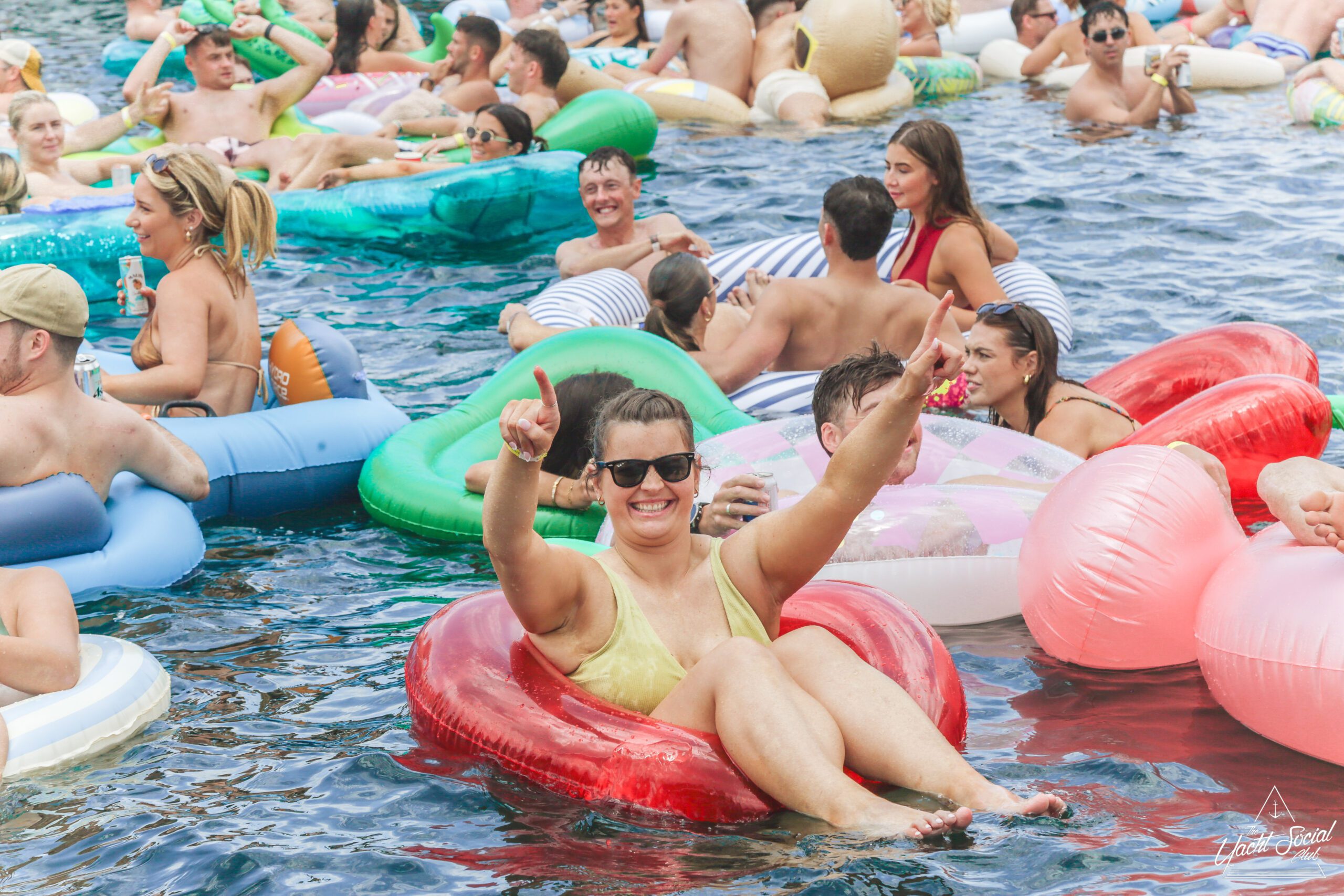 A group of smiling young adults relax on inflatable floats in the water near yachts, holding drinks and making peace signs, with more people socializing on the boats under a sunny sky.
