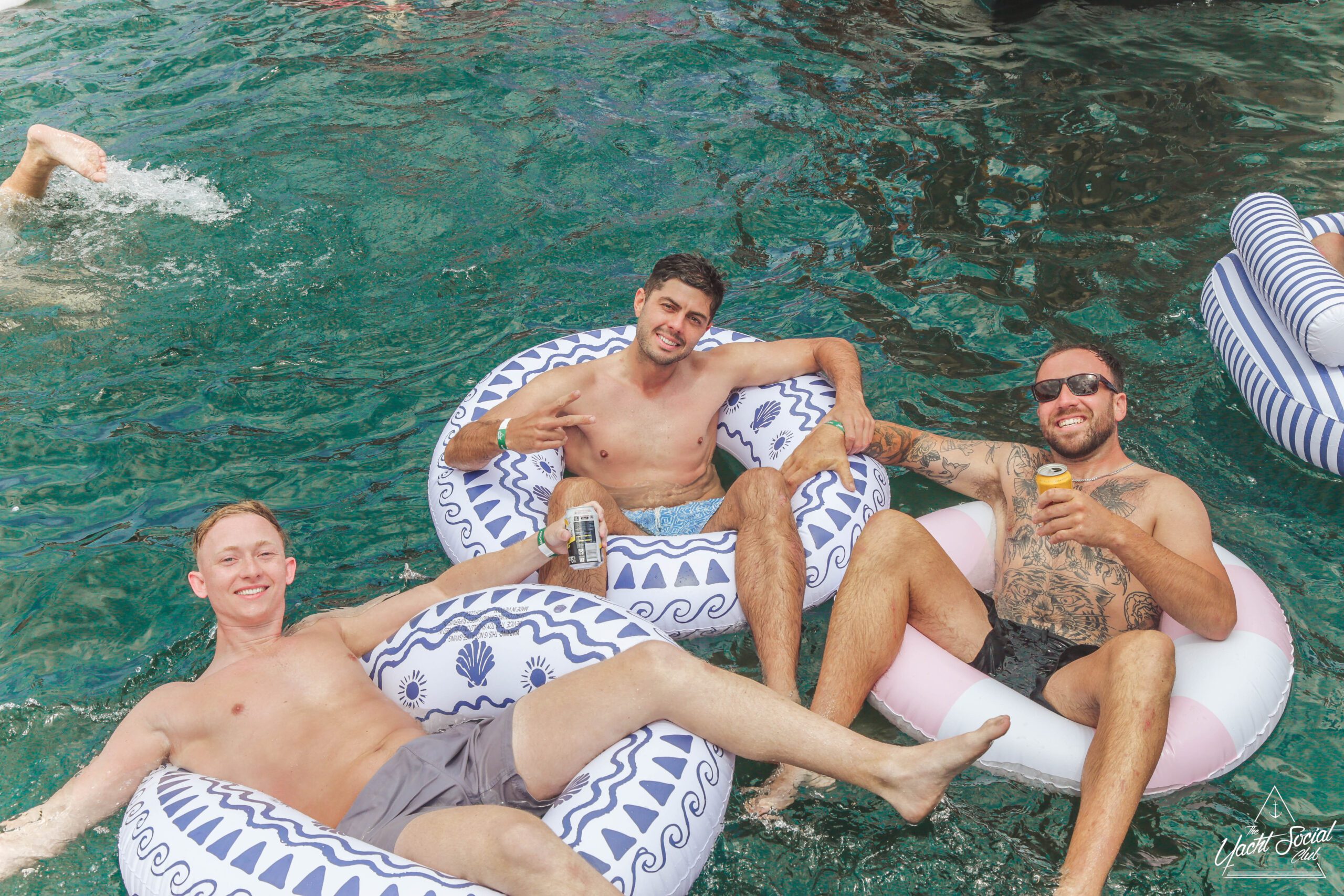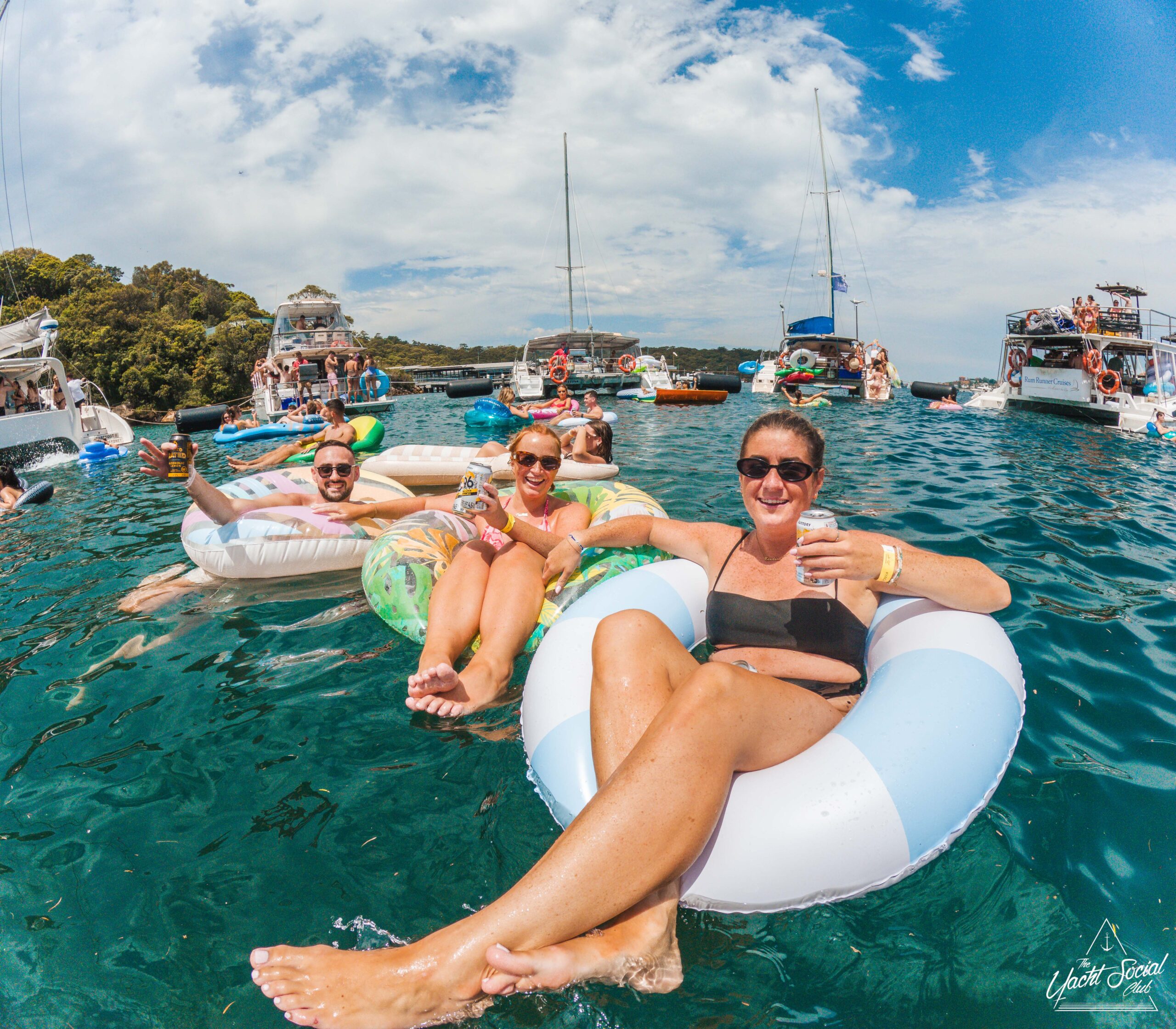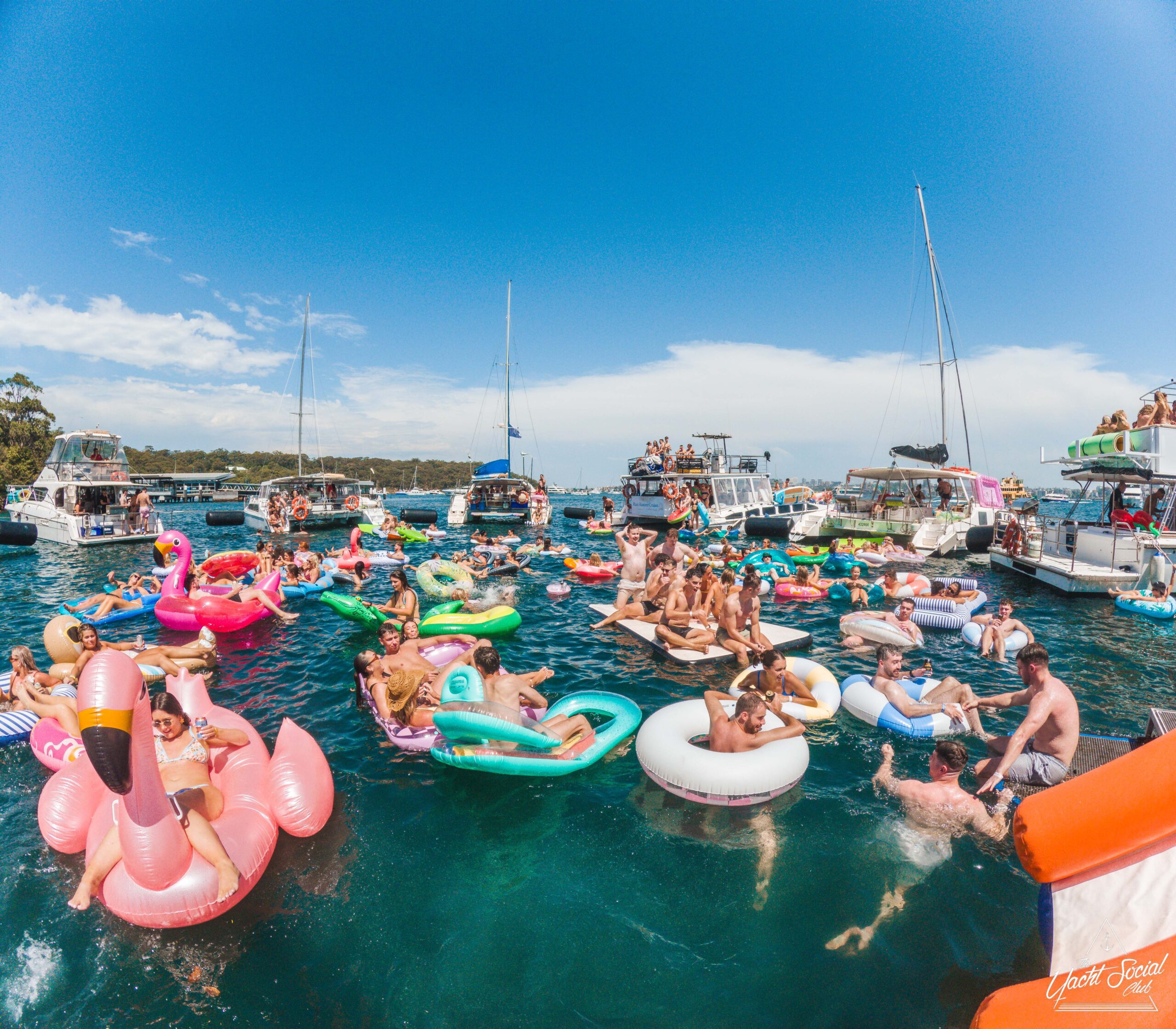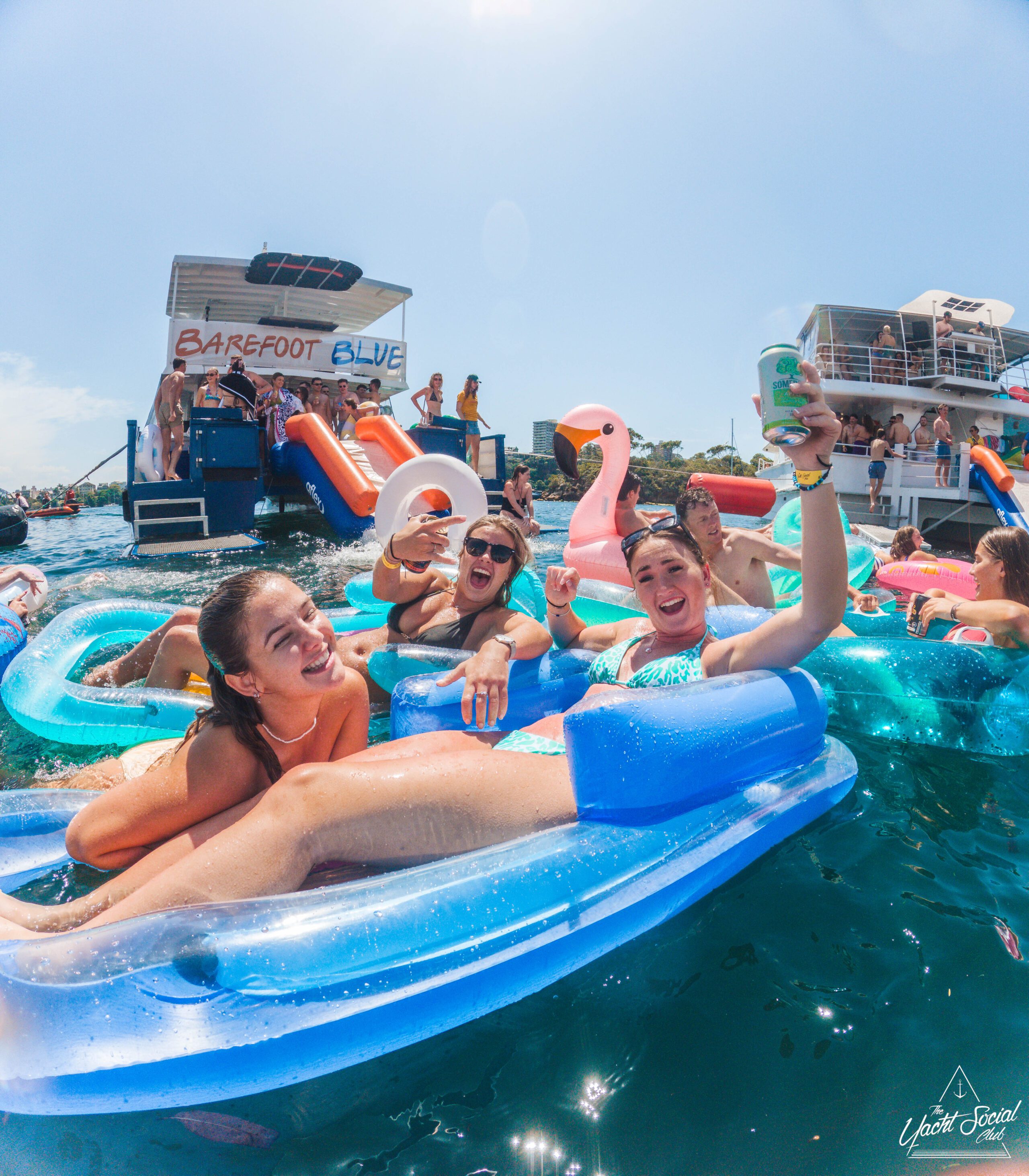 A group of smiling young adults relax on inflatable floats in the water near yachts, holding drinks and making peace signs, with more people socializing on the boats under a sunny sky.