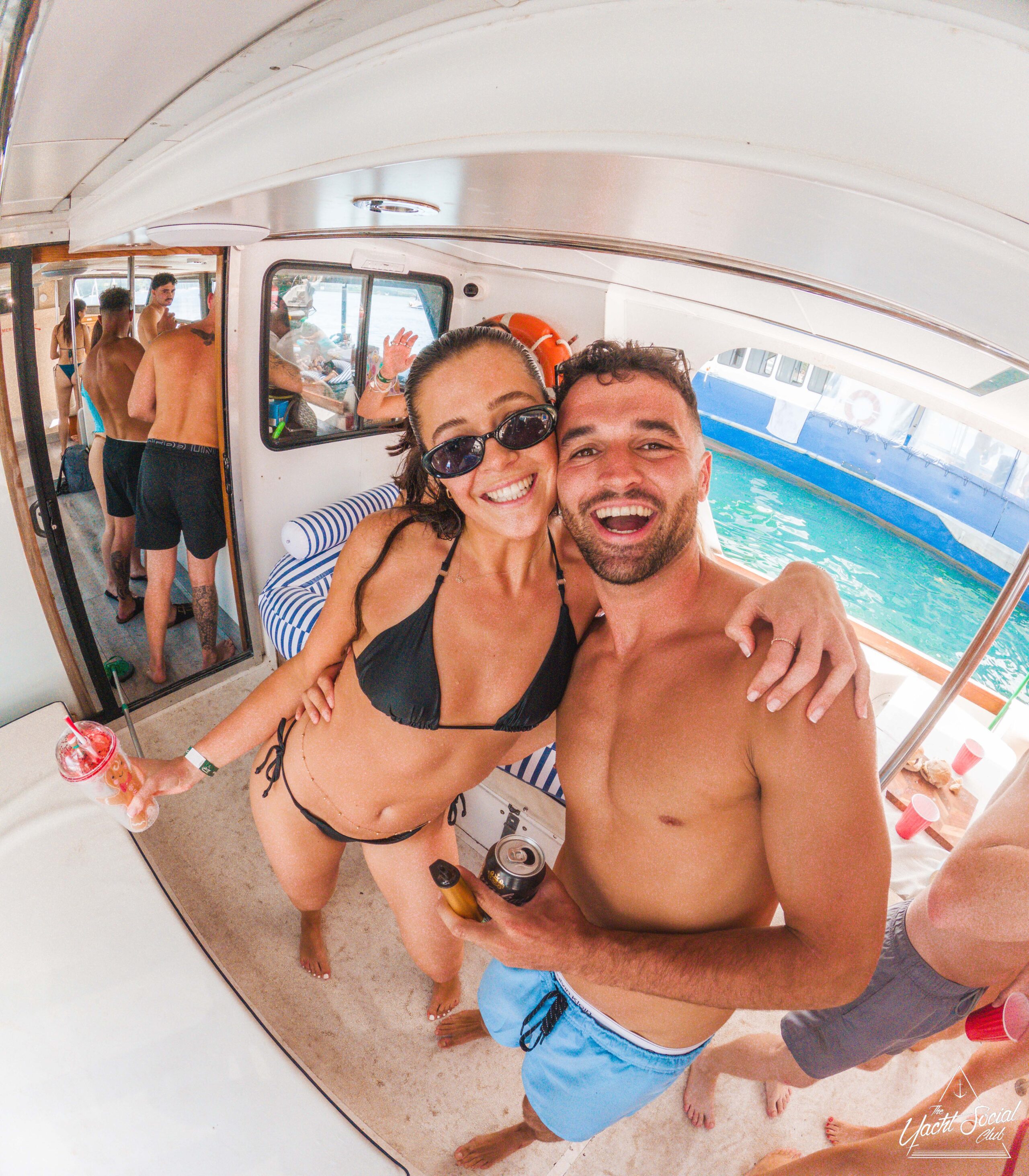 A smiling woman in a black bikini and sunglasses and a man in swim trunks pose for a selfie on a boat. Other people are in the background, and turquoise water is visible outside. Both are holding drinks and appear happy.
