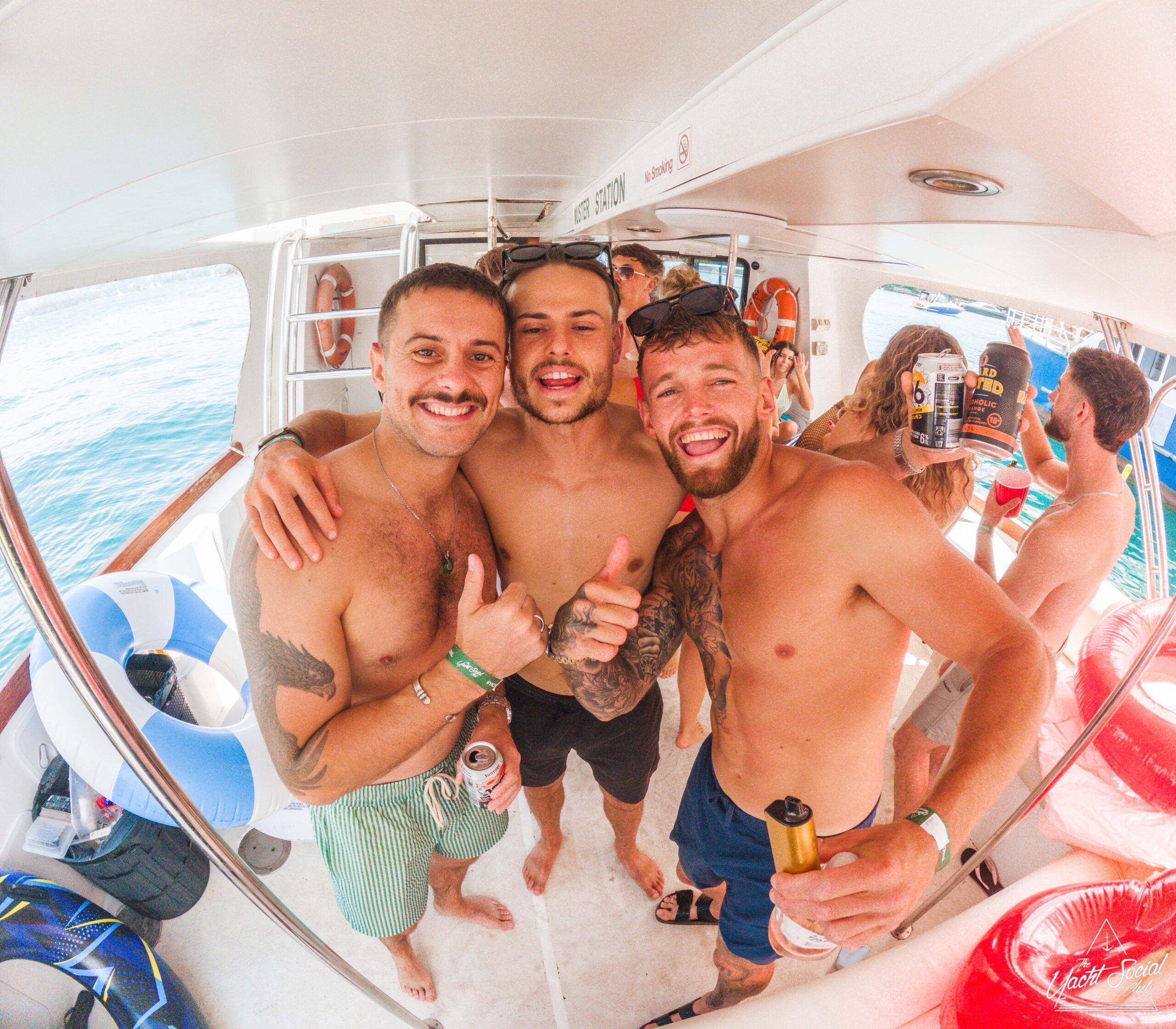Three shirtless men smiling with their arms around each other, giving thumbs up and holding drinks on a boat with other people in the background, enjoying a sunny day on the water.