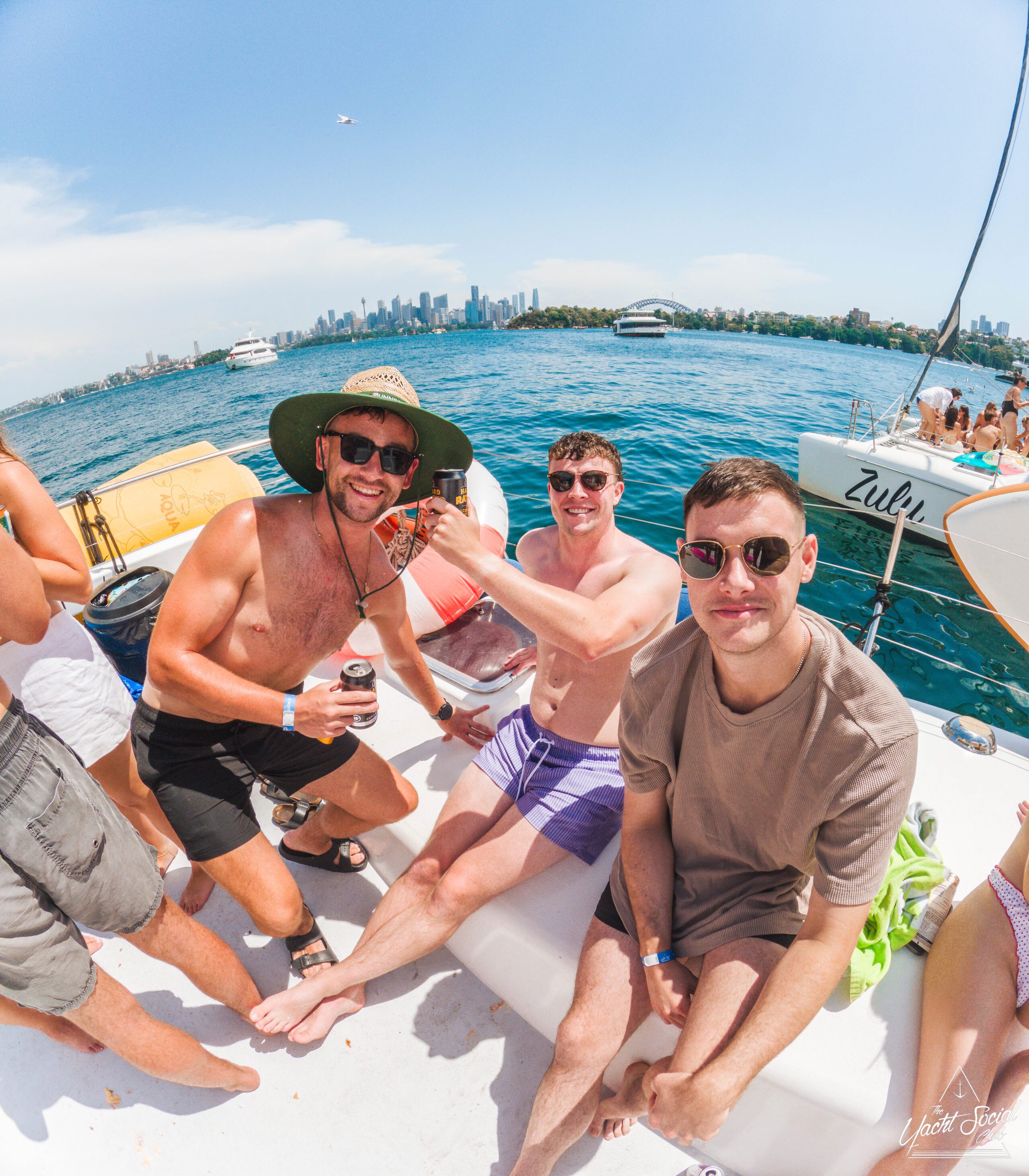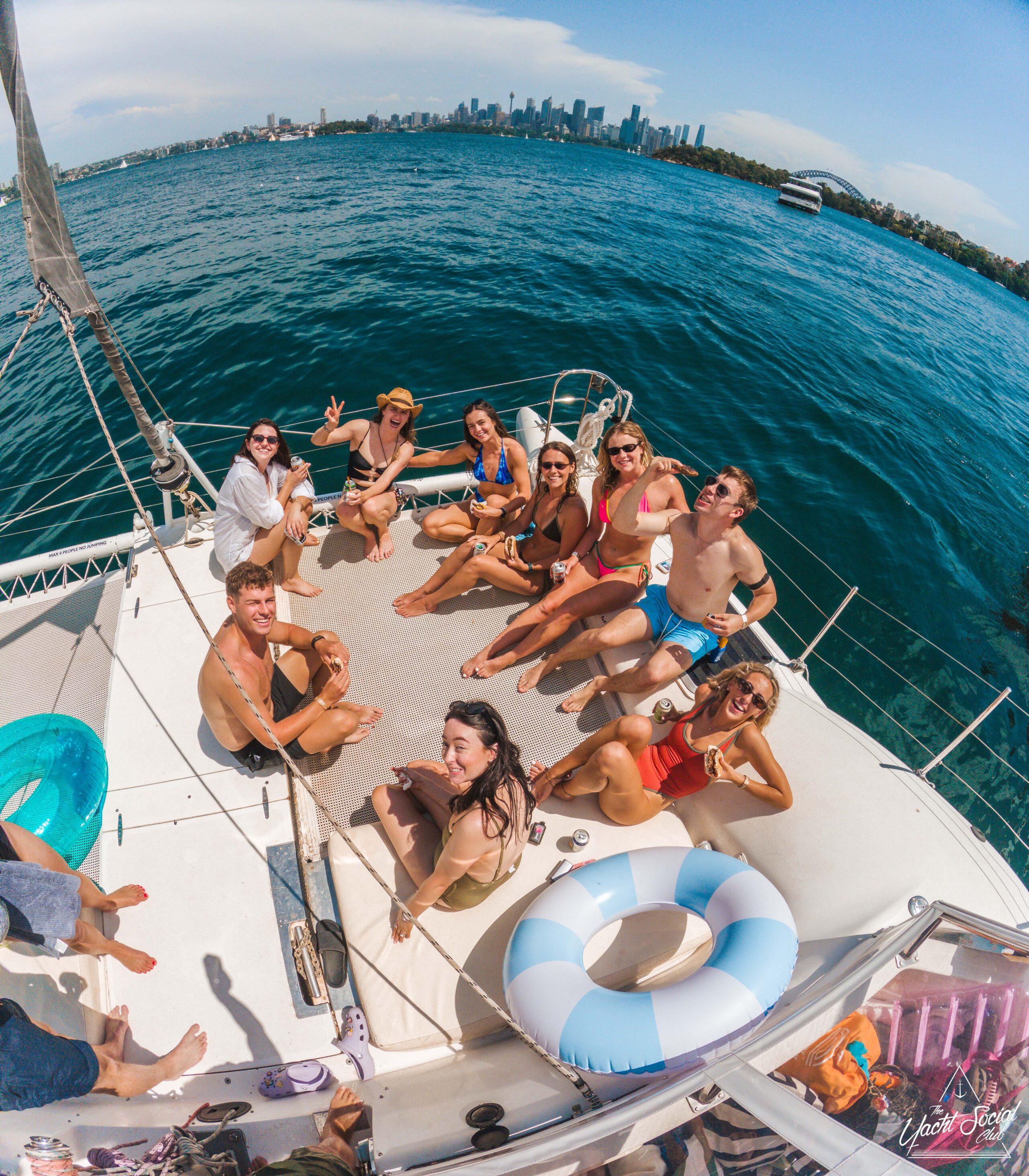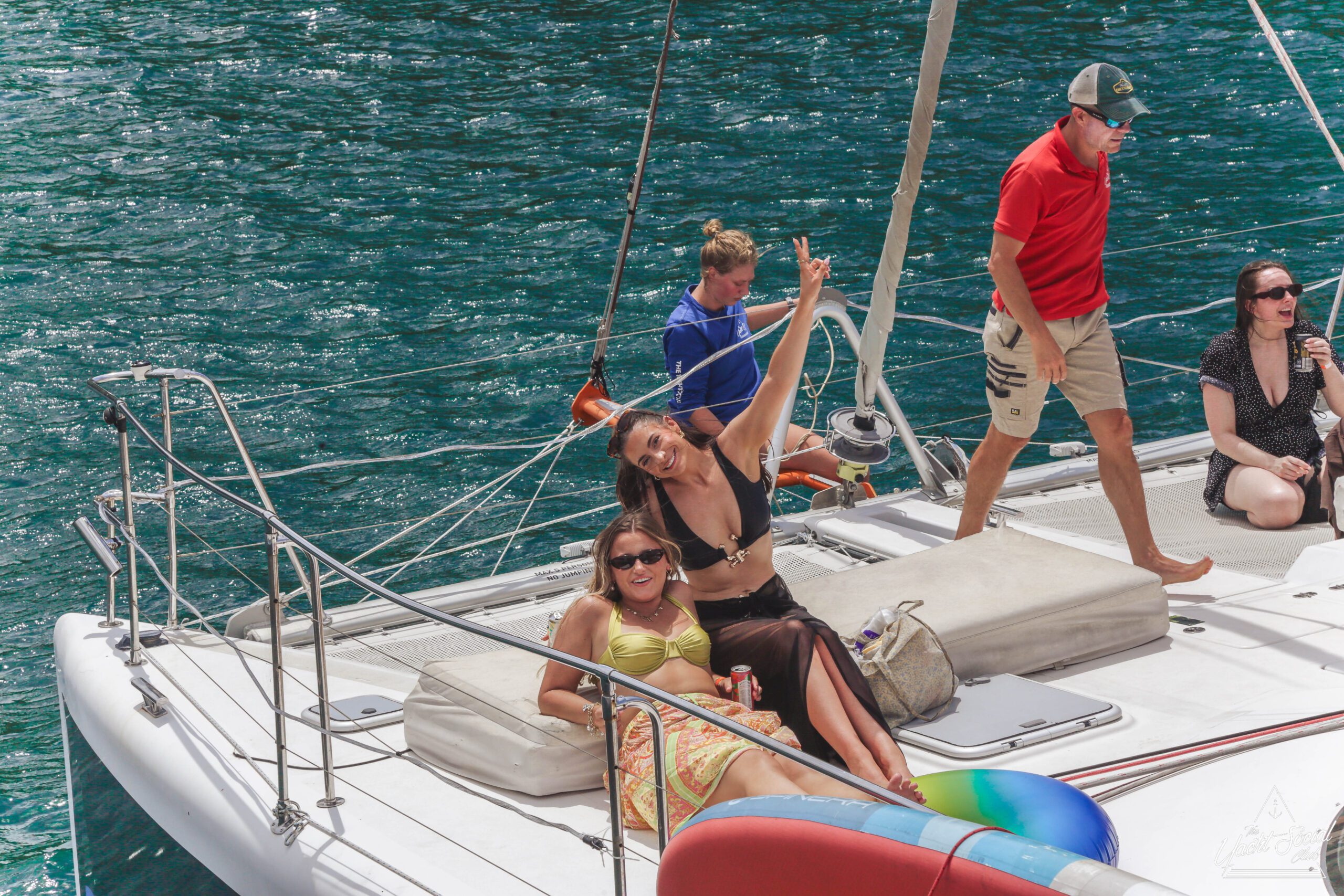 A group of smiling young adults relaxes on the deck of a catamaran, enjoying drinks and sunny weather. Other boats and clear blue water are visible in the background.