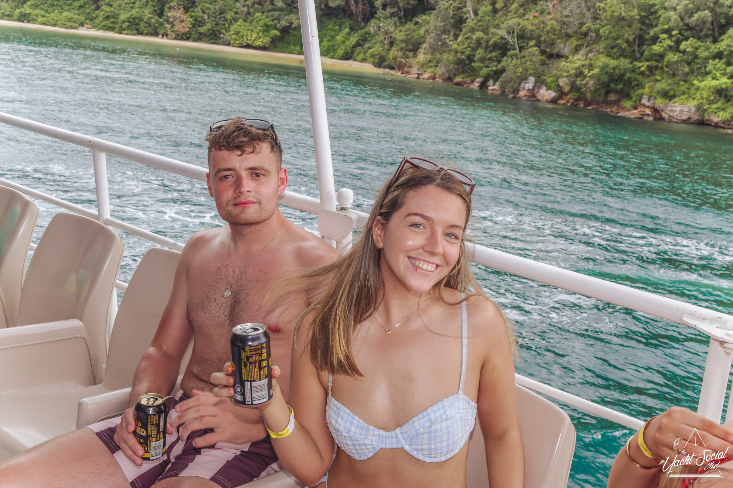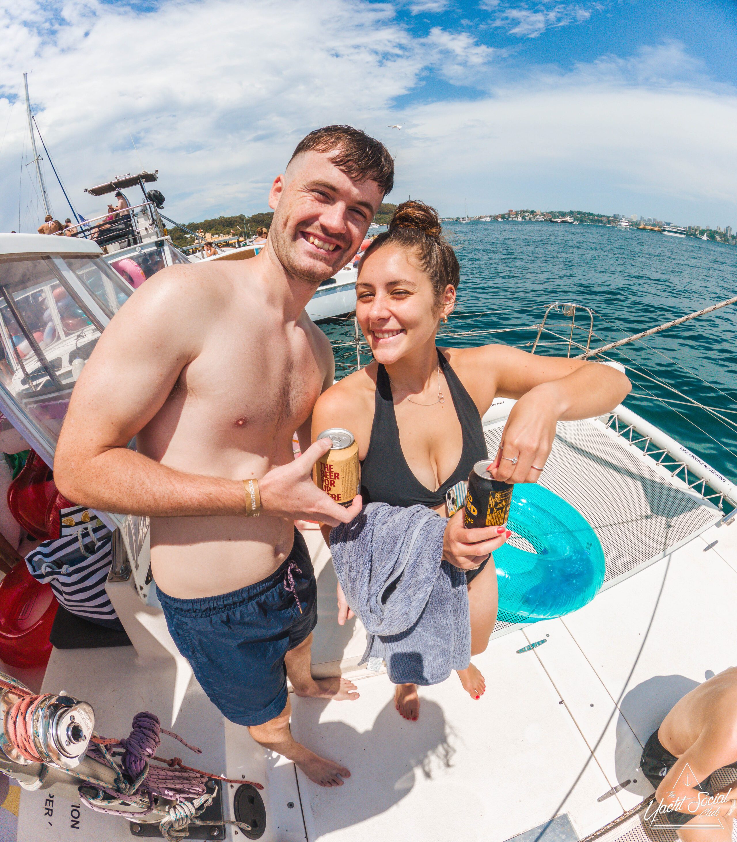 A smiling man and woman in swimsuits hold canned drinks on a boat, with blue water and a clear sky in the background. The woman has a towel around her waist, and other people and boat equipment are visible nearby.