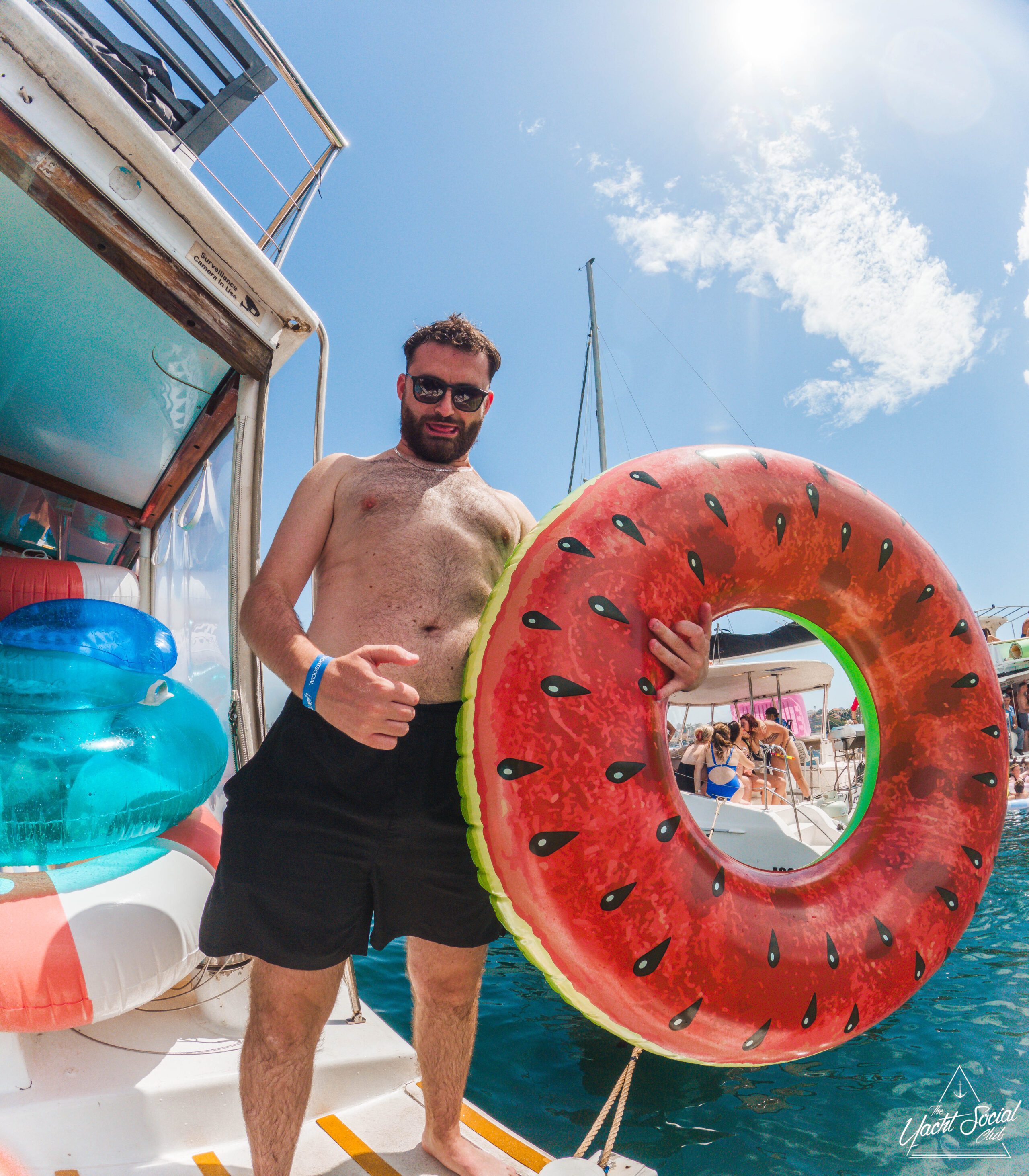 A man in swim trunks stands on a boat holding a large, round watermelon-shaped inflatable. He is smiling, wearing sunglasses, and there are people and other colorful inflatables in the background on a sunny day.