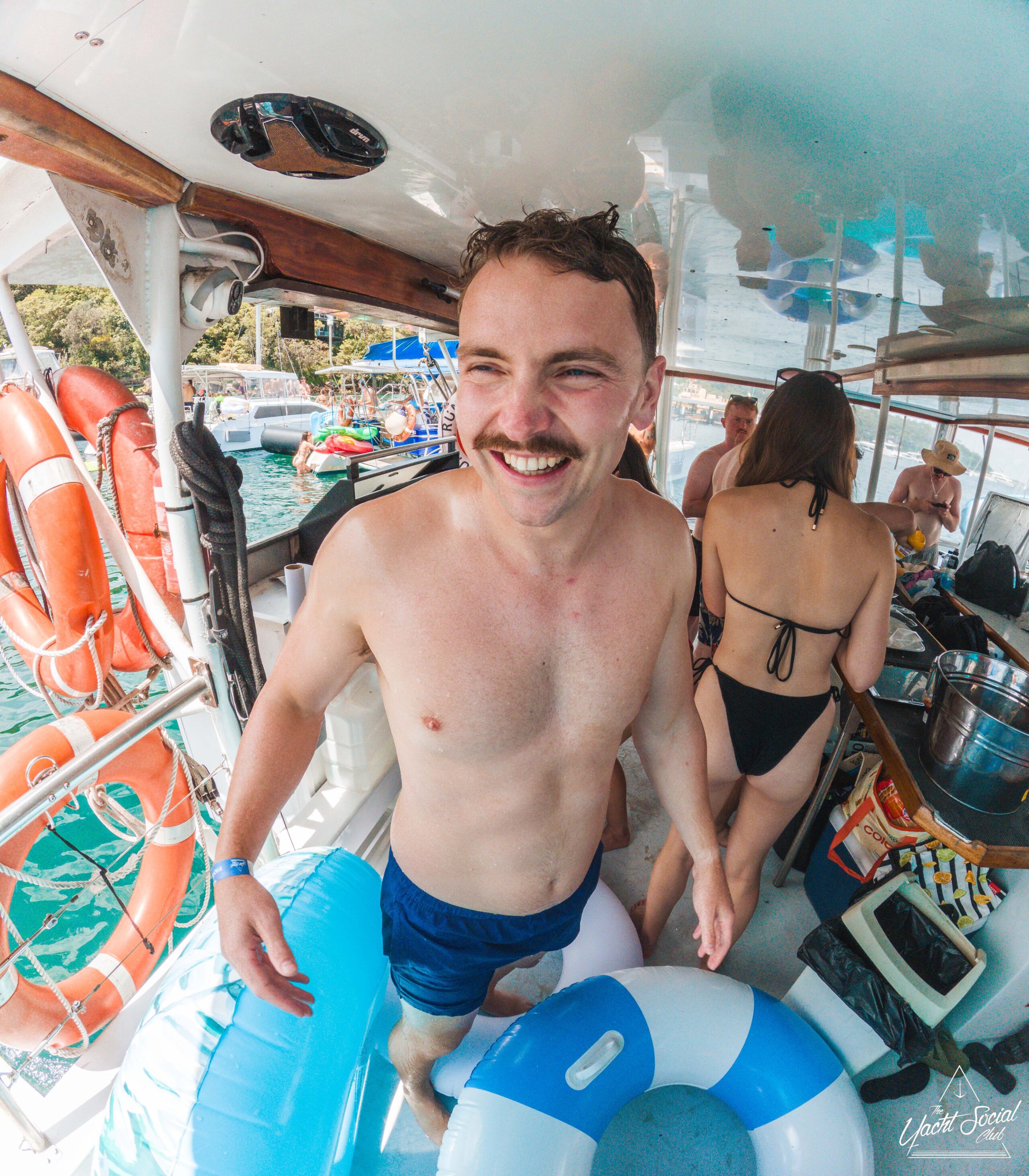 A smiling man in swim trunks and a mustache stands on a boat holding a blue and white inner tube, surrounded by other people in swimwear. The boat is docked on clear blue water with trees visible in the background.