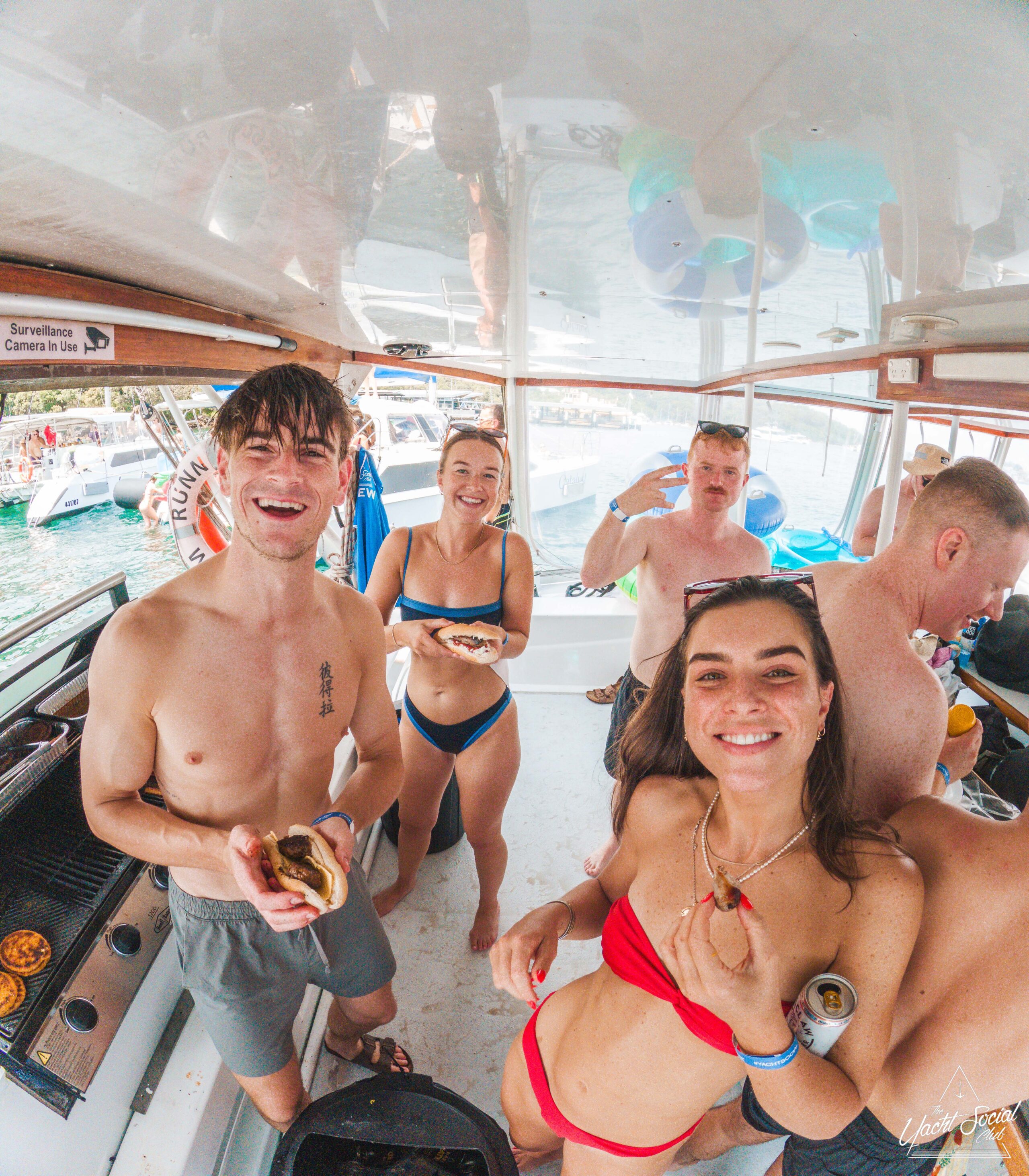 Five young adults in swimwear smile and eat food on a boat. The group appears to be enjoying a party with other boats and people visible on the water outside. The scene is lively and casual.
