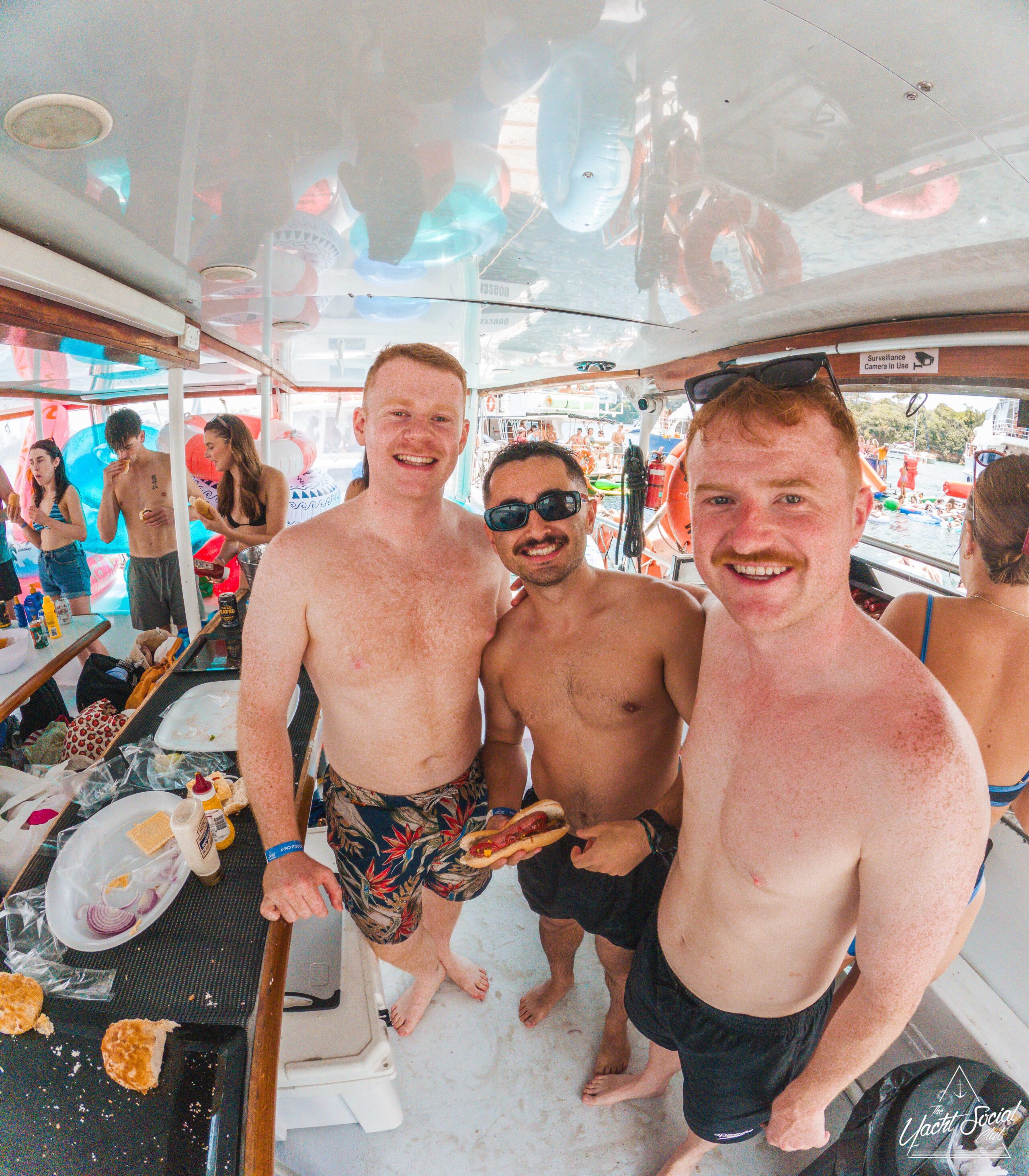Three smiling men in swim trunks stand on a boat, one holding a sandwich. Other people and food are visible in the background, indicating a lively gathering or party on the water.