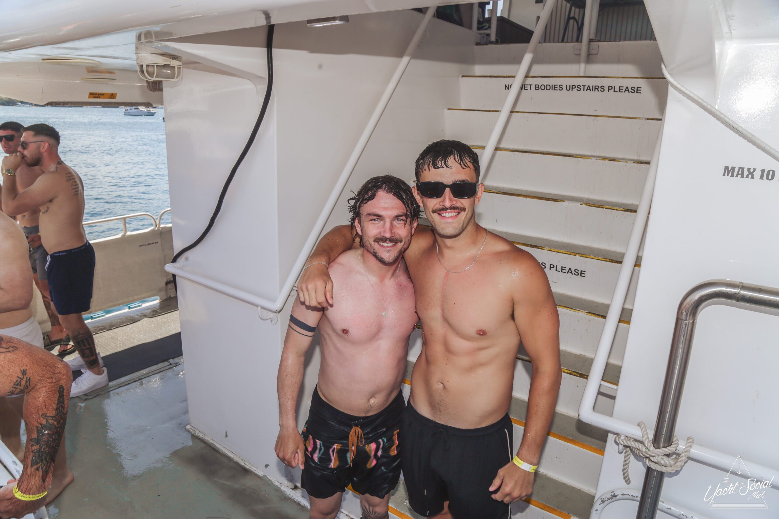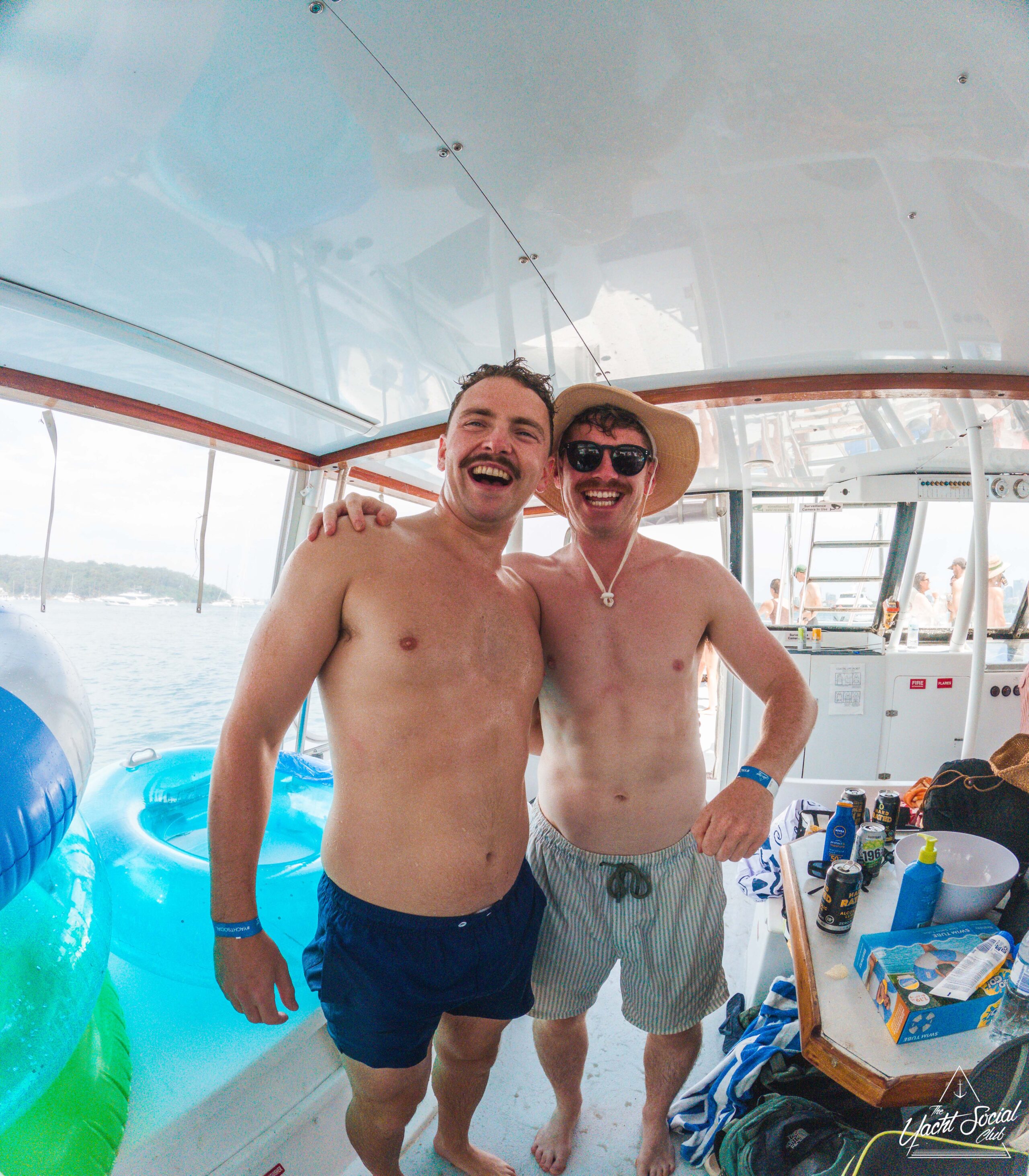 Two smiling men in swim trunks stand arm-in-arm on a boat, wearing sunglasses and wristbands. Inflatable pool floats and snacks are visible, with a sunny waterfront and other people in the background.