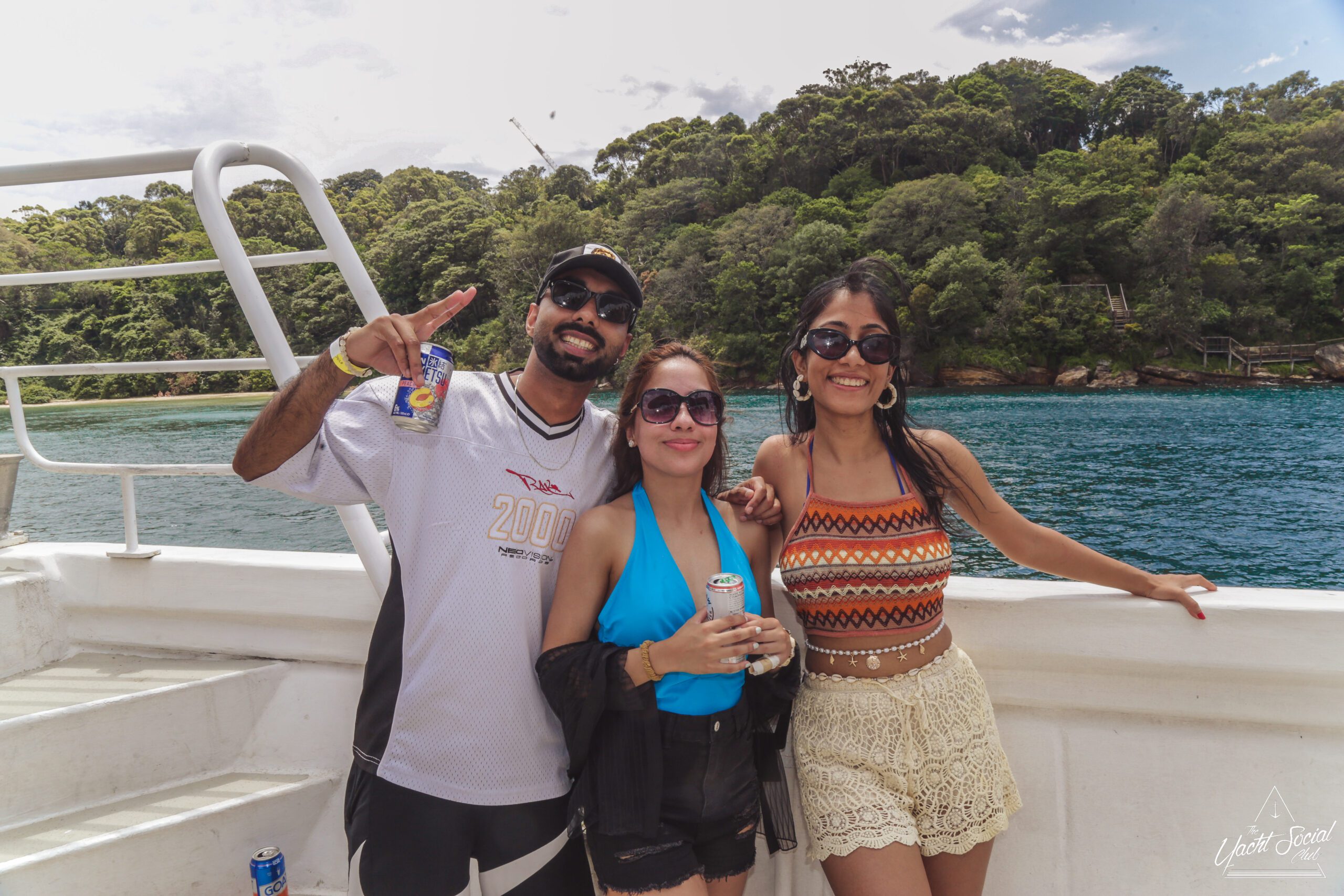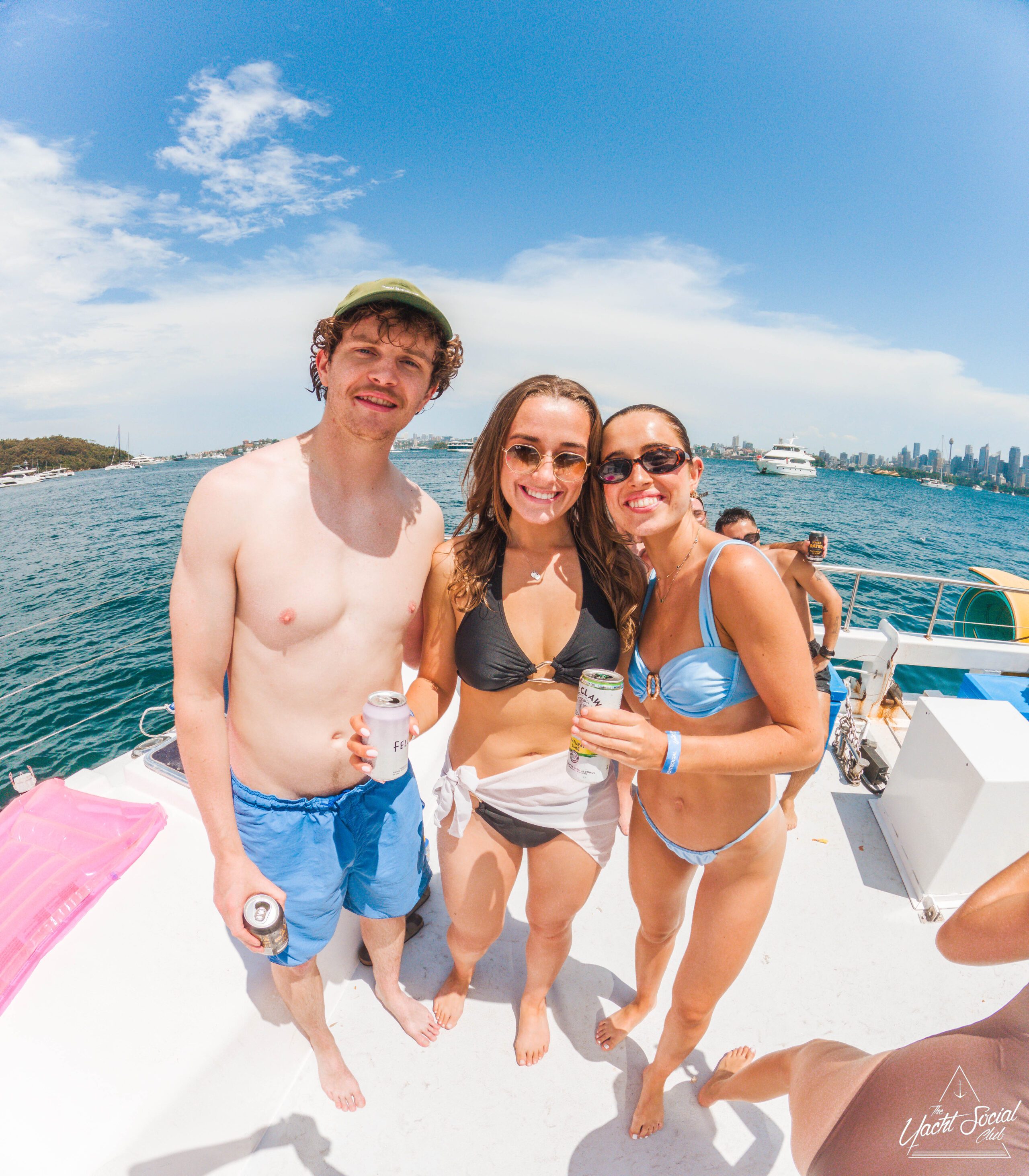 Three people in swimsuits smiling and holding drinks on a boat, with blue water and city skyline in the background on a sunny day.