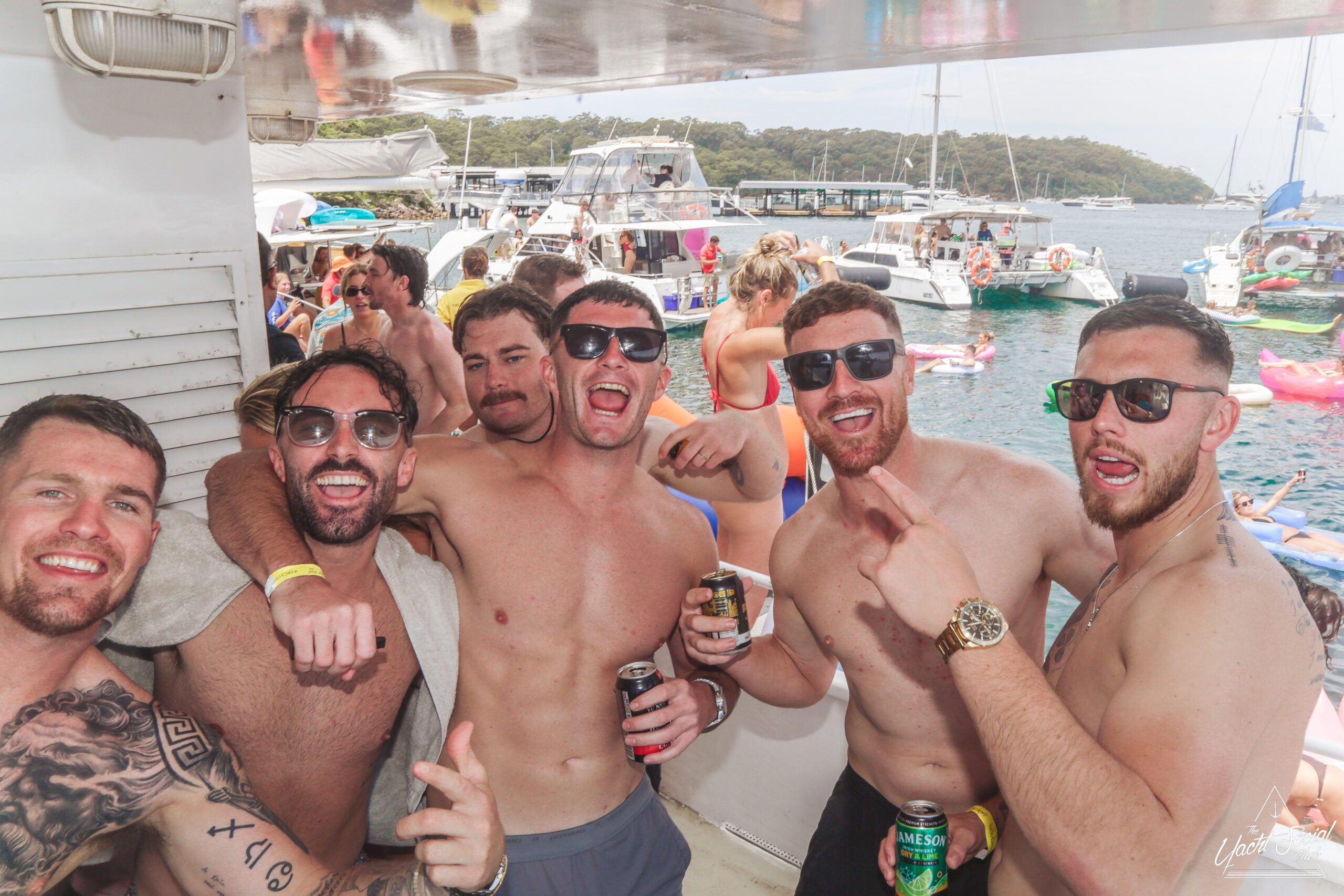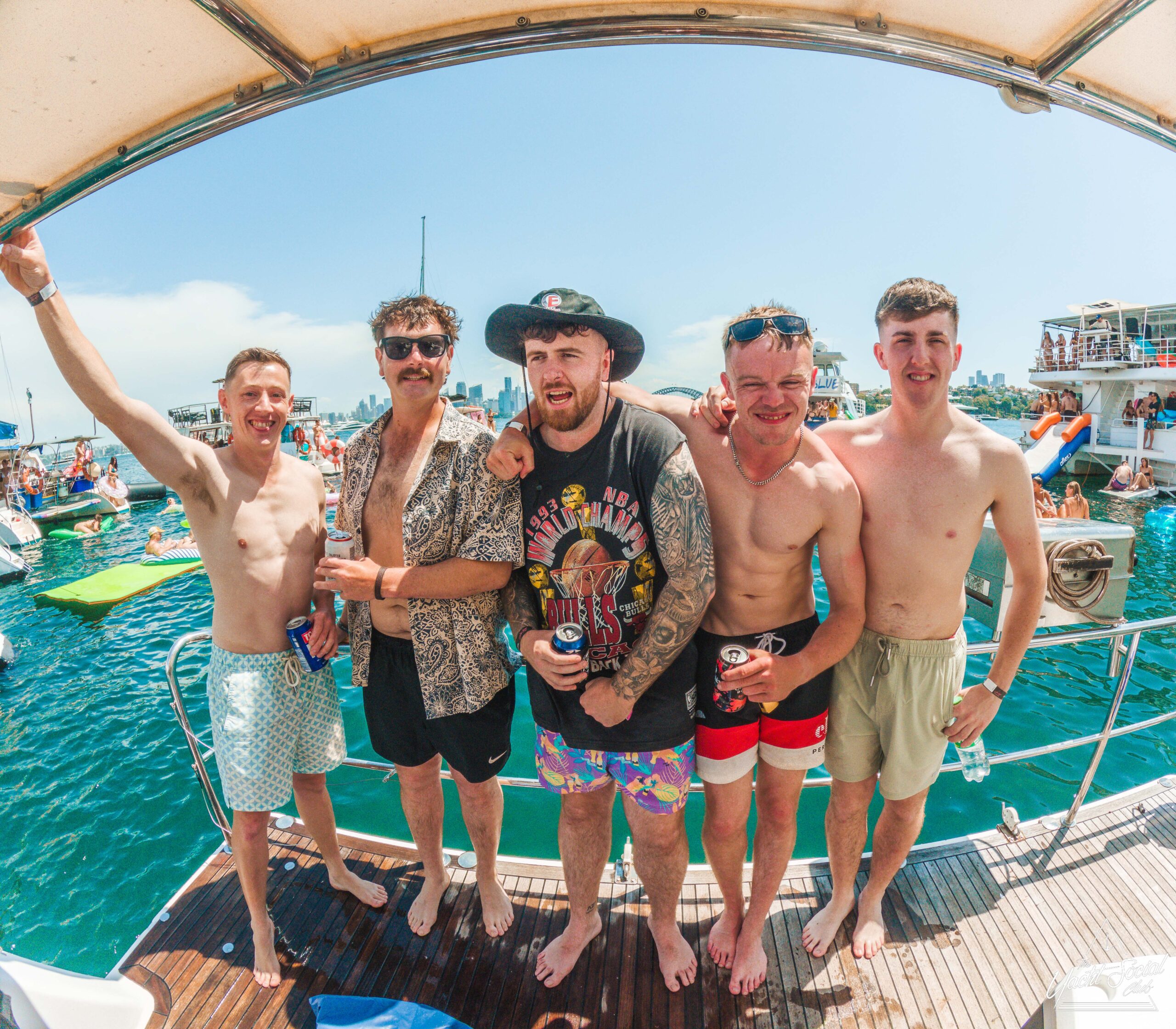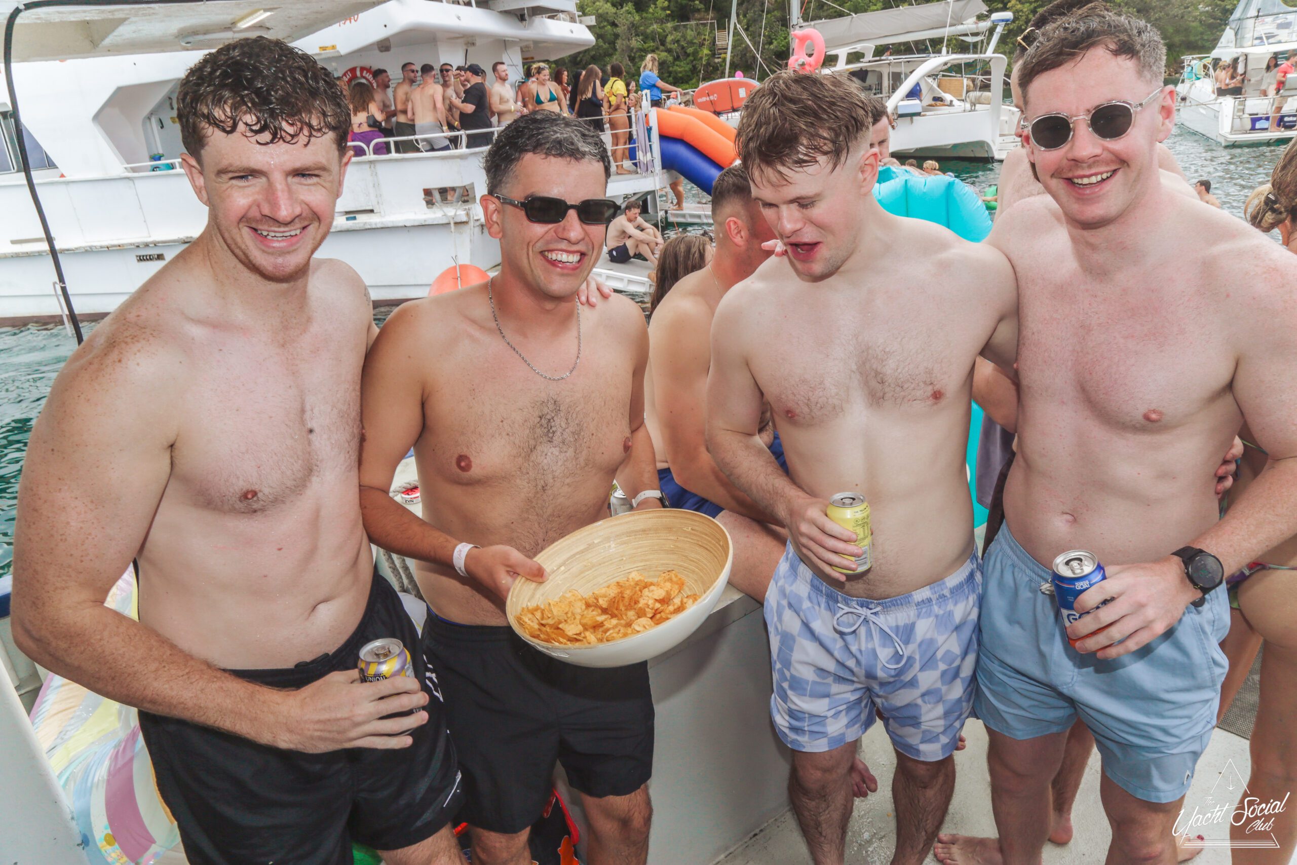 Five smiling men pose together on a boat, wearing swimsuits and holding drinks, with a lively party scene and other boats in the background on a sunny day by the water.