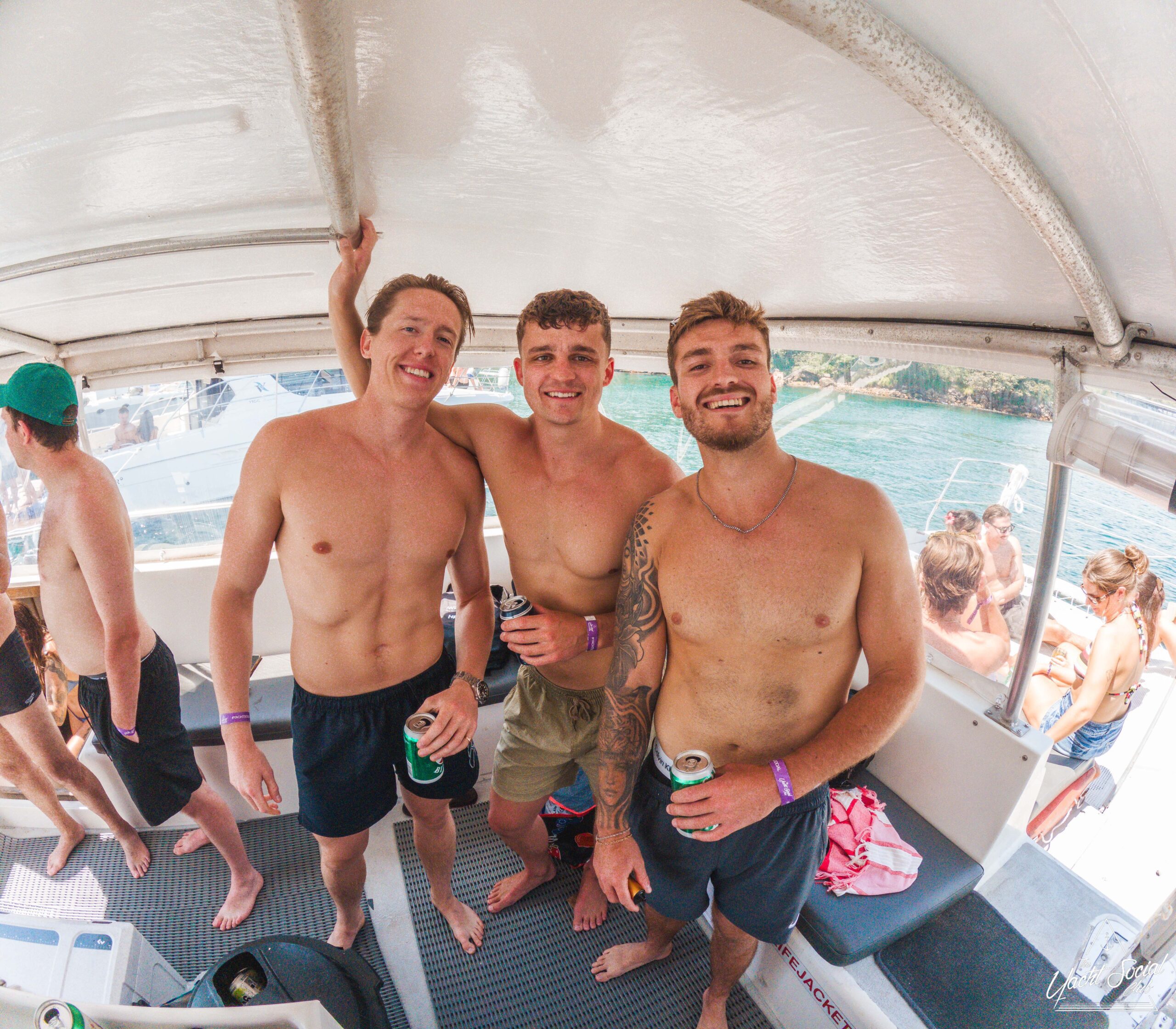 Three smiling men in swim trunks stand close together on a boat, each holding a drink. Other people are relaxing and socializing in the background, enjoying a sunny day near the water.