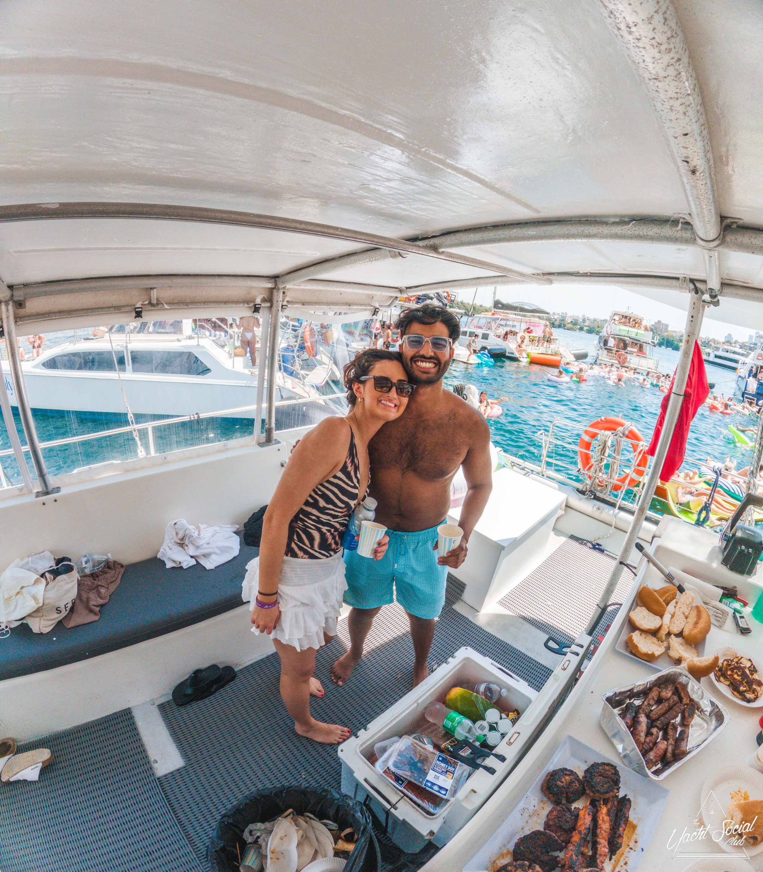 A smiling couple in swimsuits poses on a boat with food and drinks, surrounded by water and other boats in the background on a sunny day.