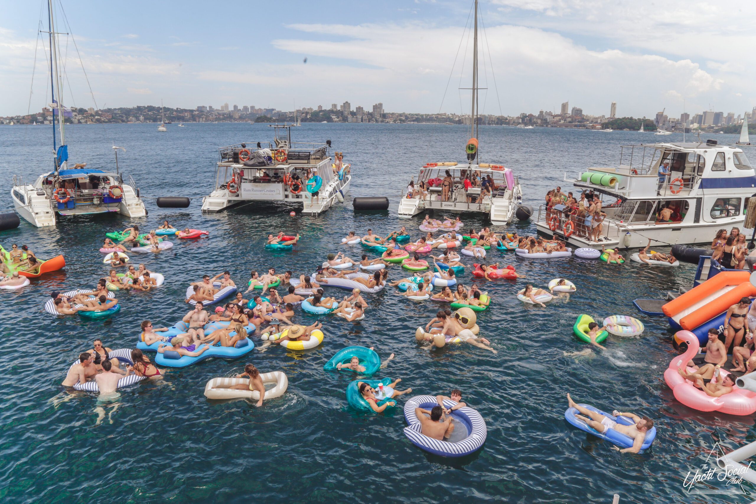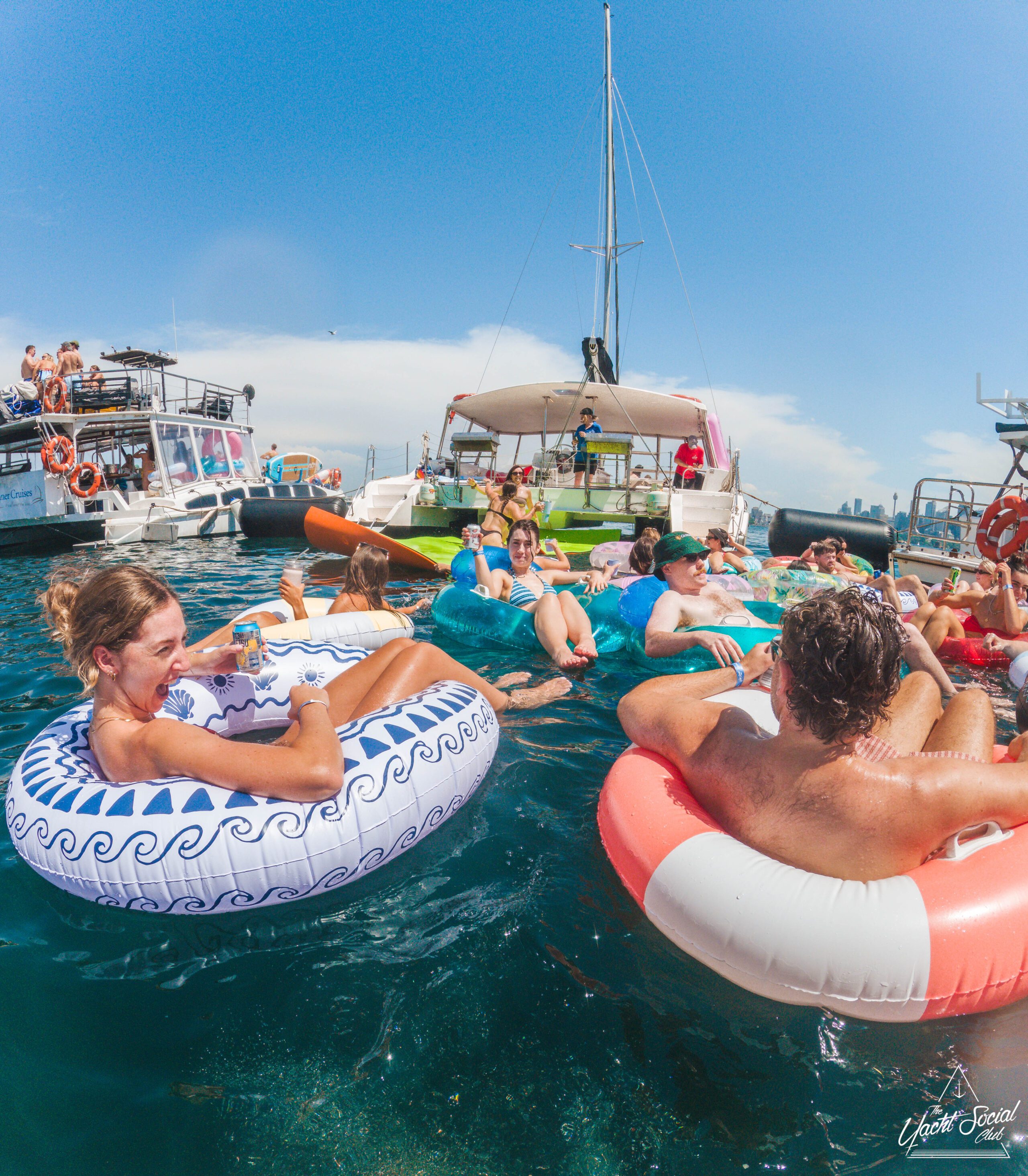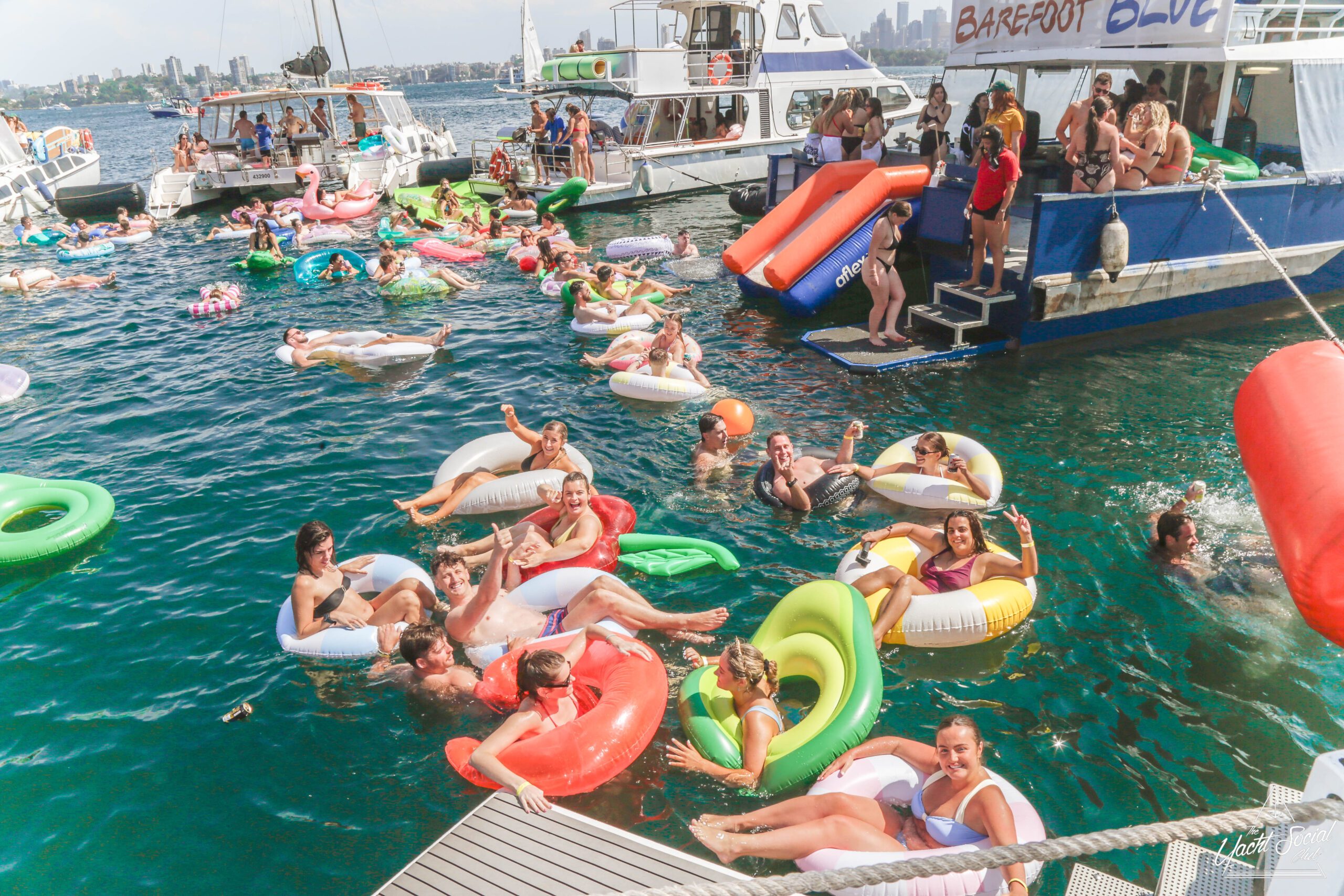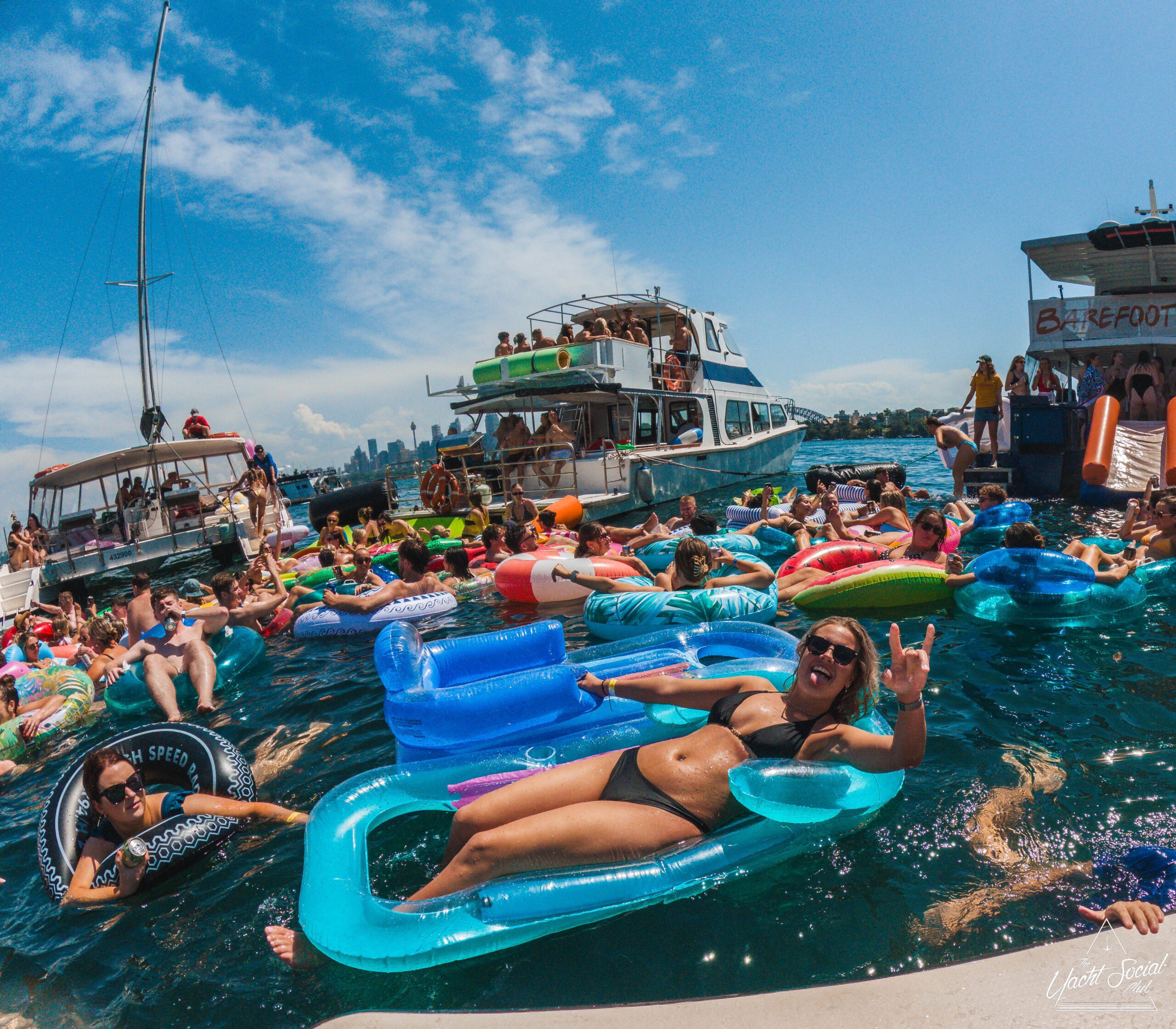 People relax on colorful inflatable tubes in the ocean near anchored boats under a sunny sky, enjoying drinks and socializing. The atmosphere is lively and festive, with clear blue water and city skyline in the background.