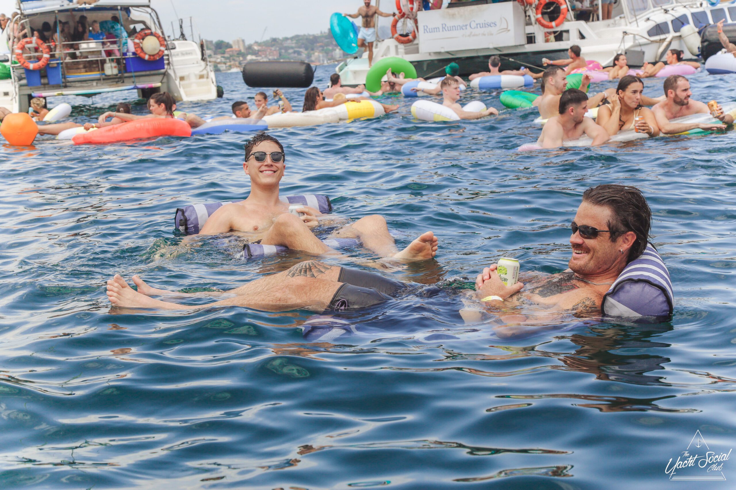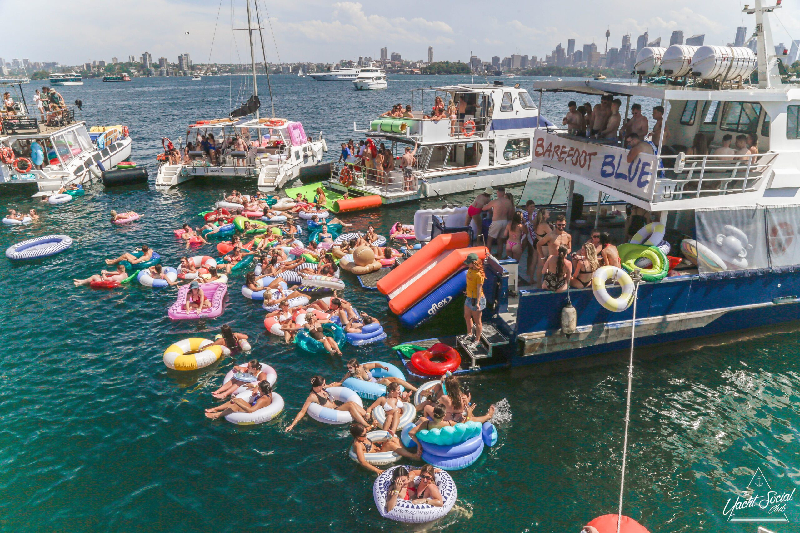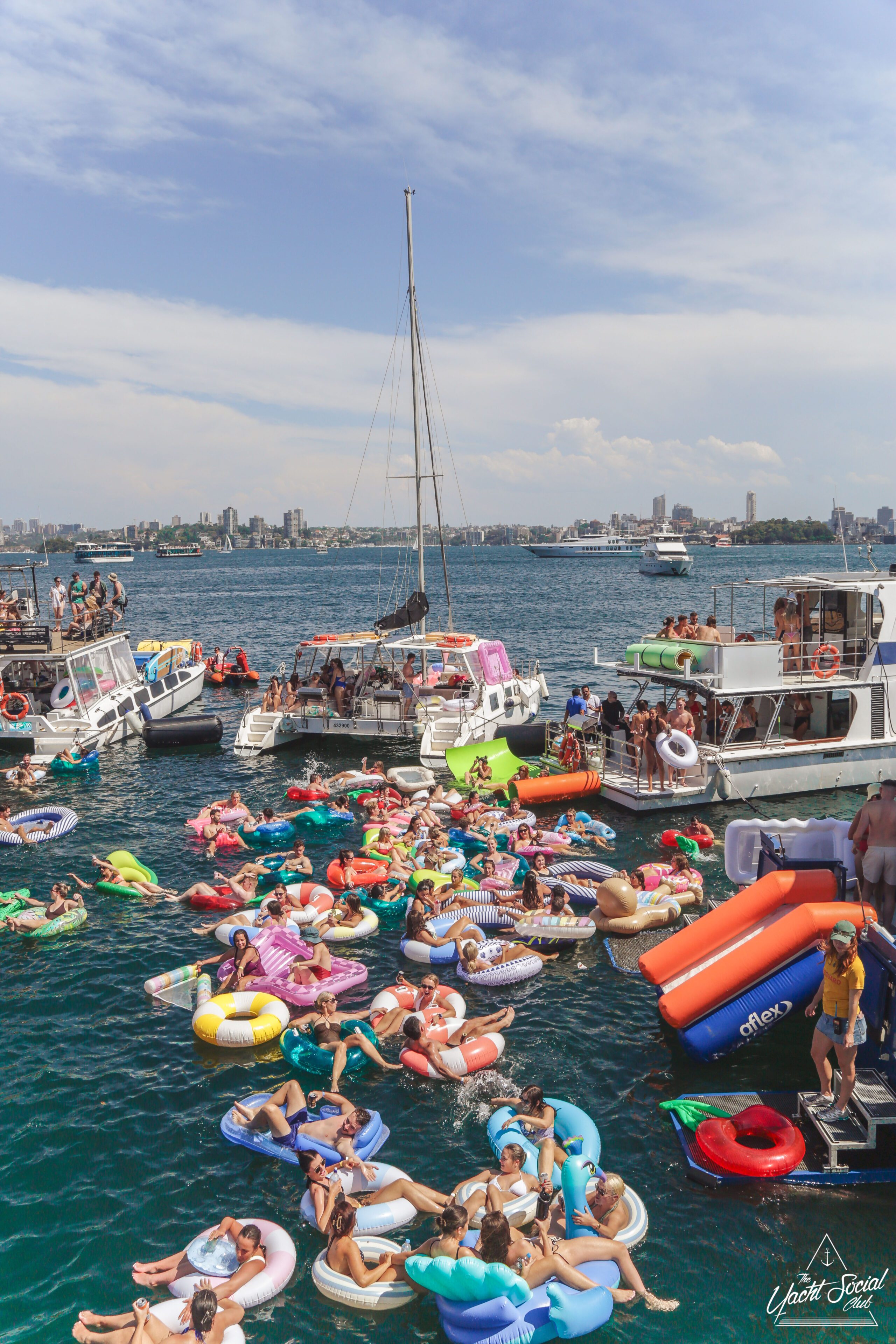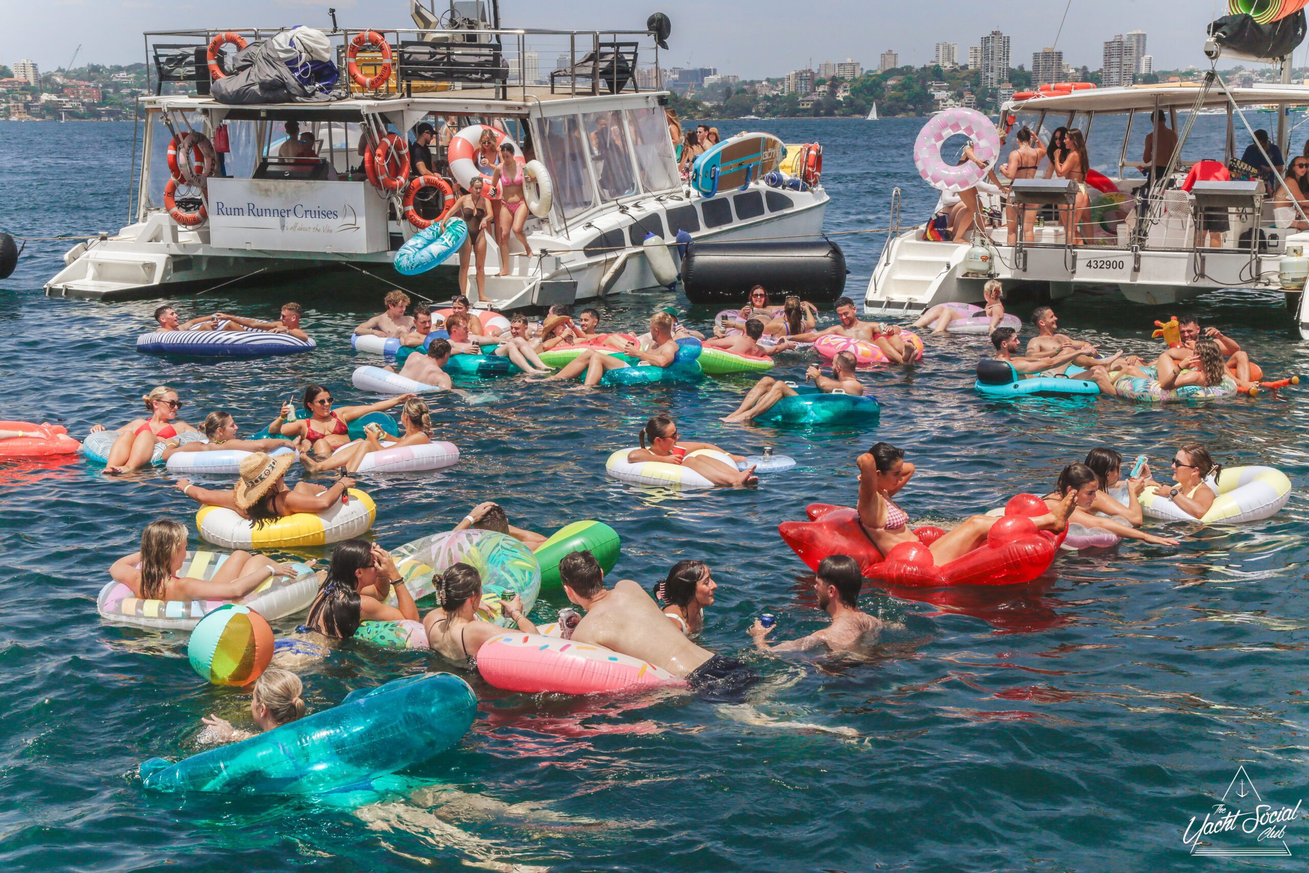 People relax on colorful inflatable tubes in the ocean near anchored boats under a sunny sky, enjoying drinks and socializing. The atmosphere is lively and festive, with clear blue water and city skyline in the background.