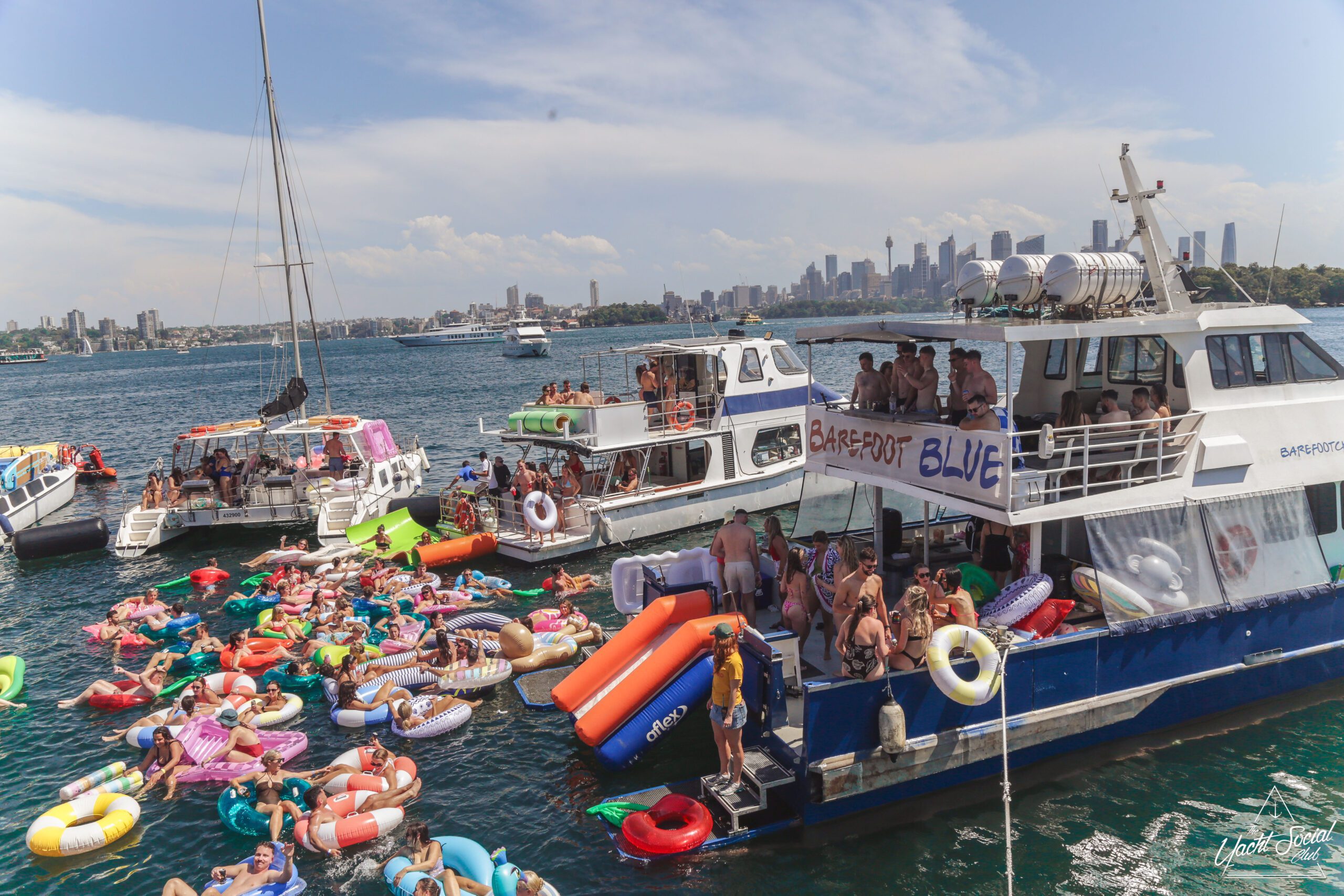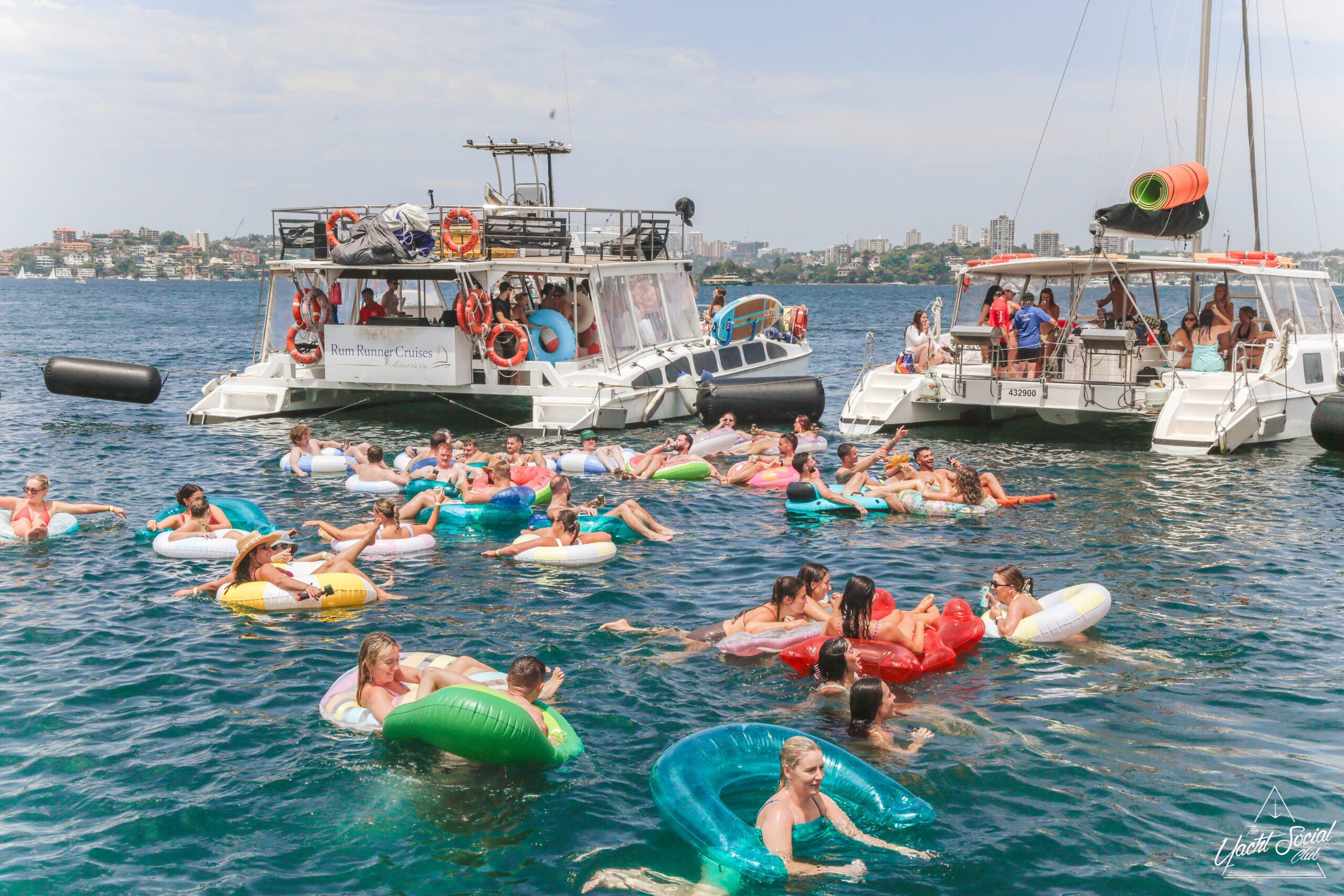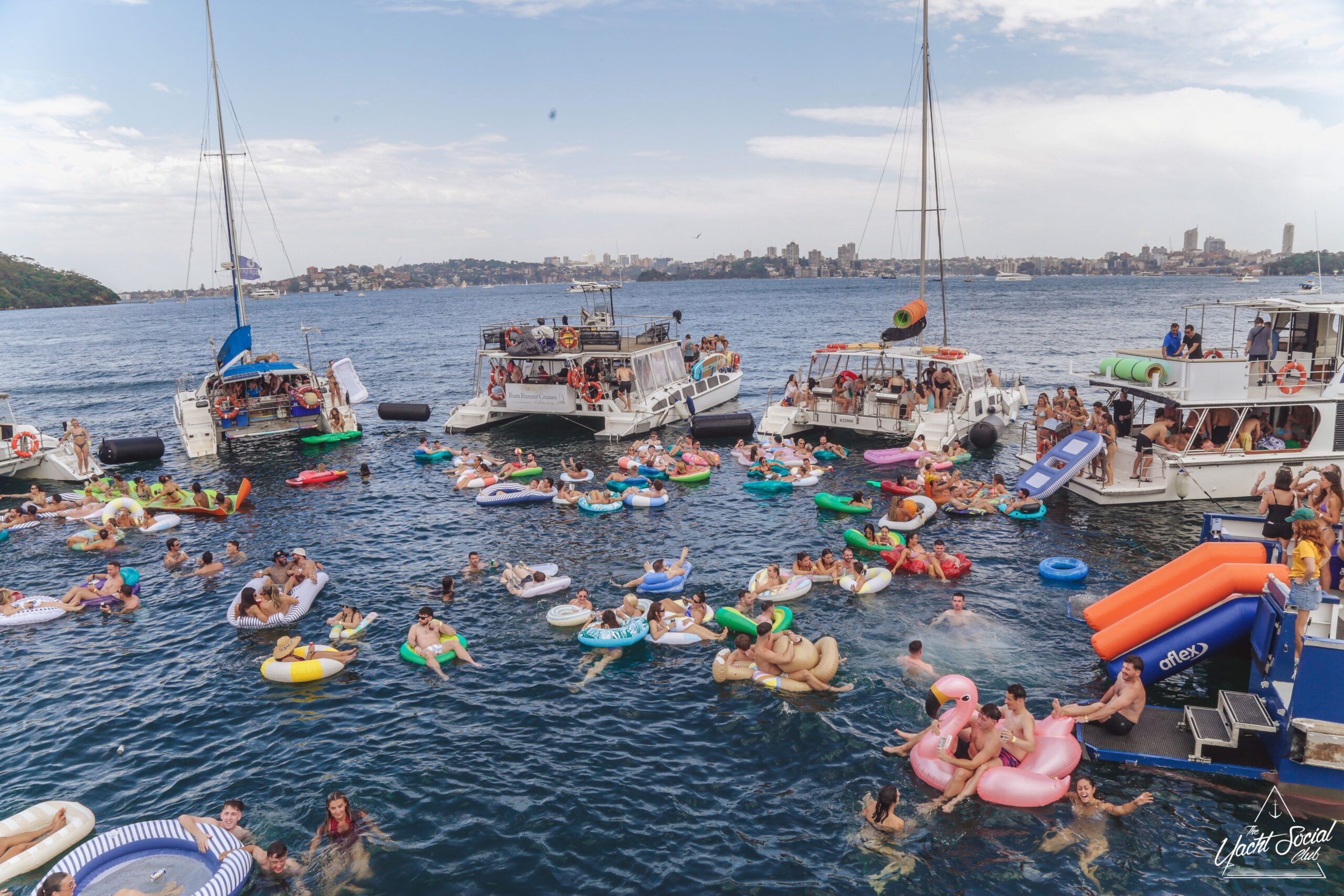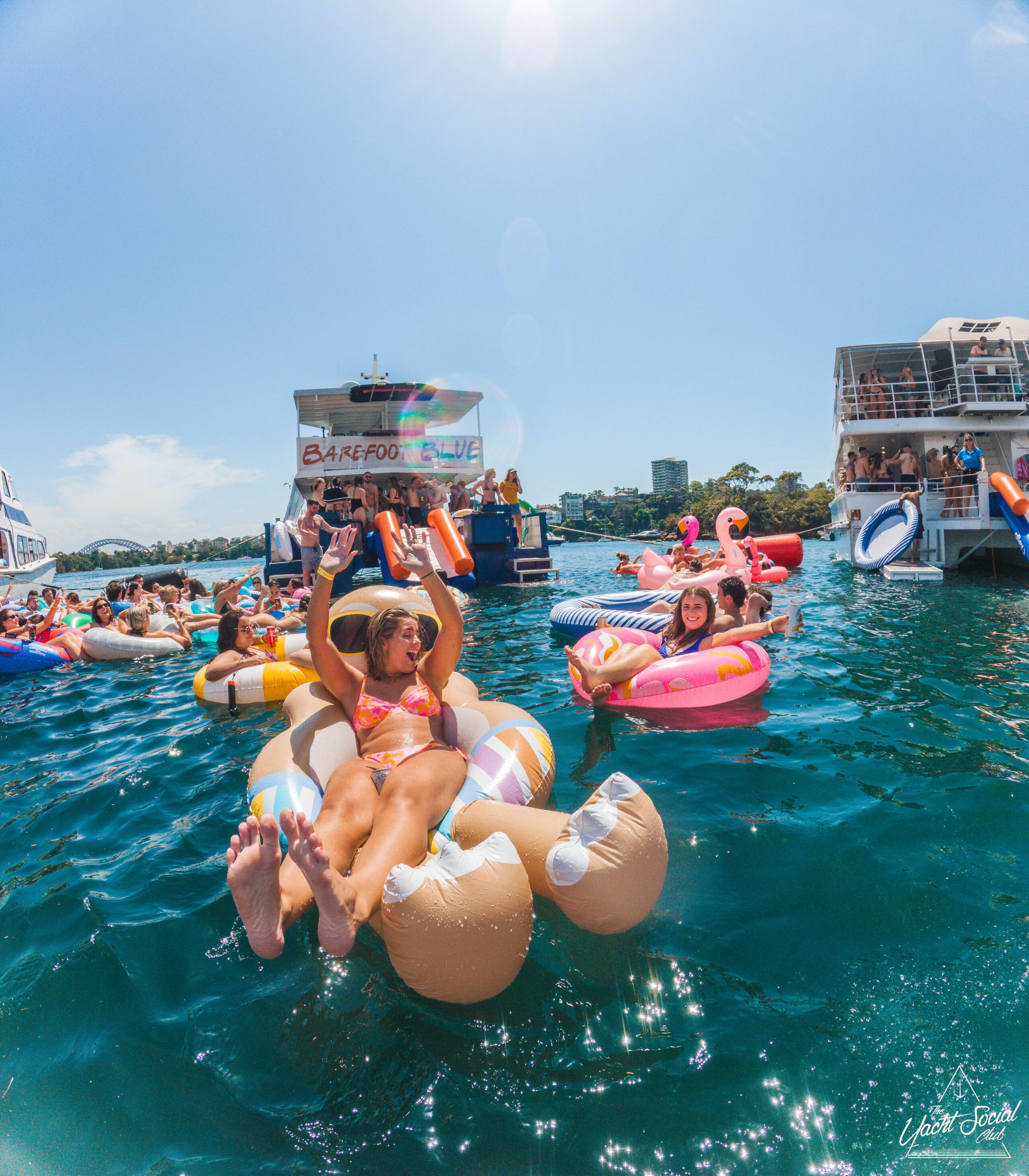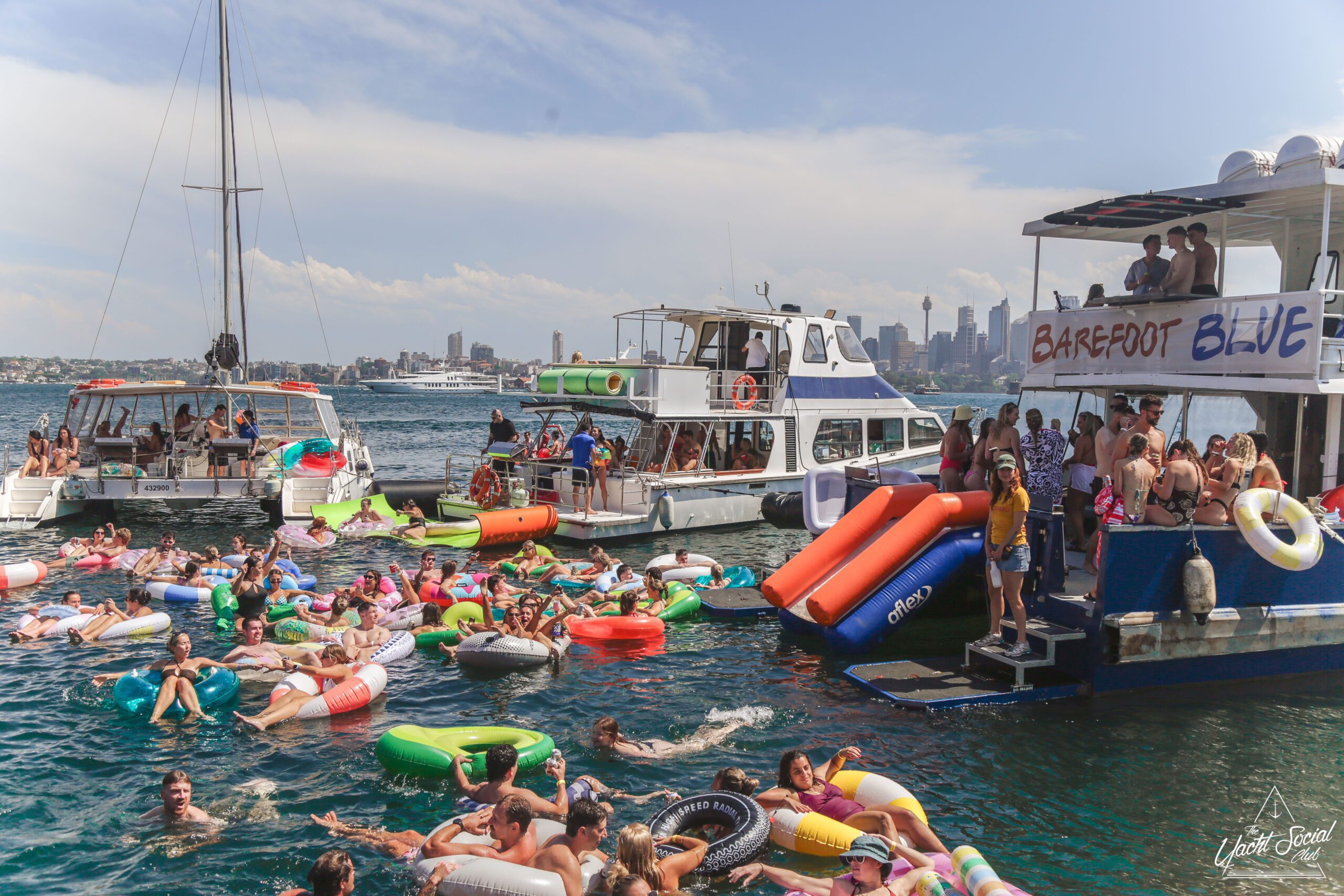 People relax on colorful inflatable tubes in the ocean near anchored boats under a sunny sky, enjoying drinks and socializing. The atmosphere is lively and festive, with clear blue water and city skyline in the background.