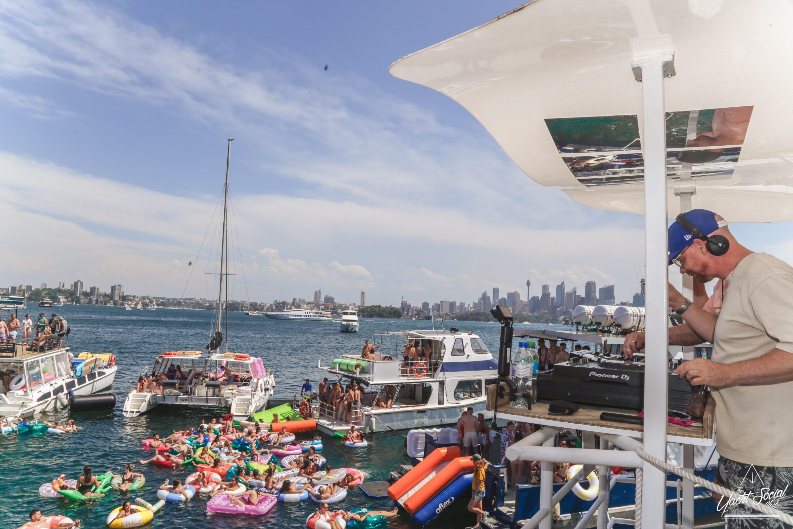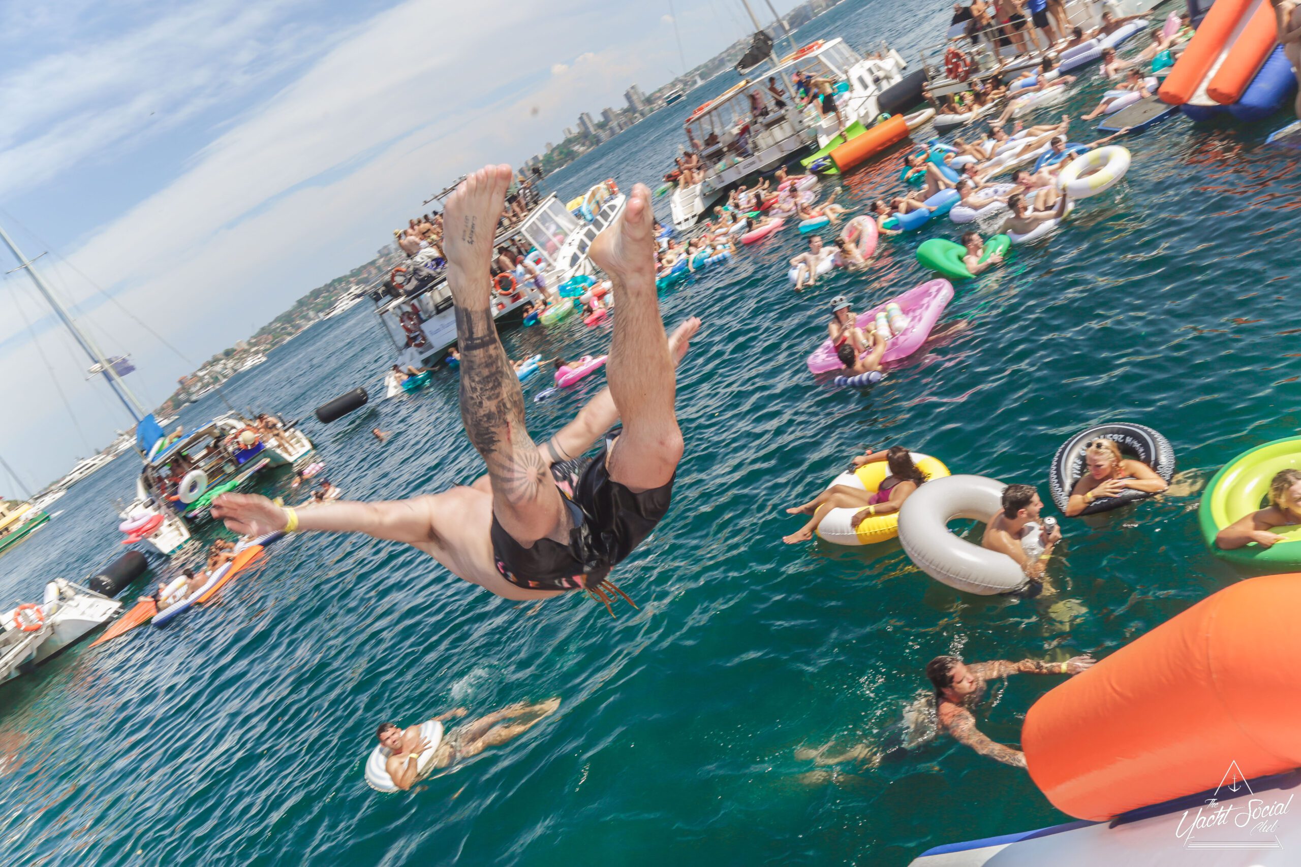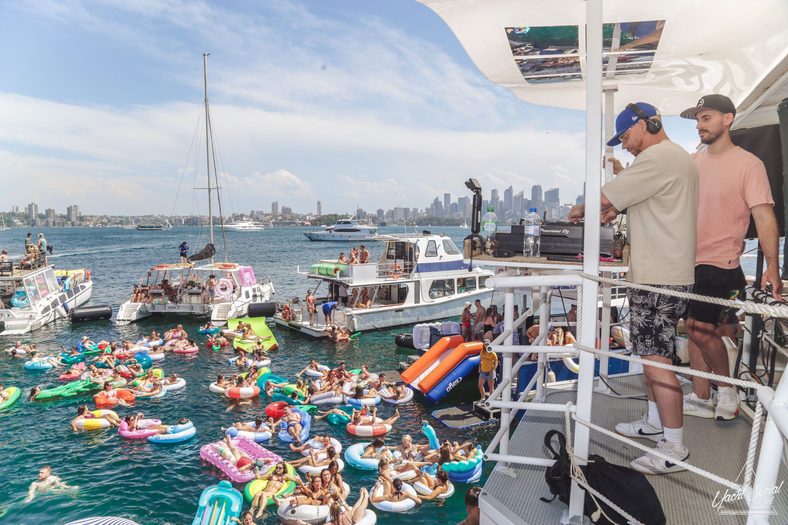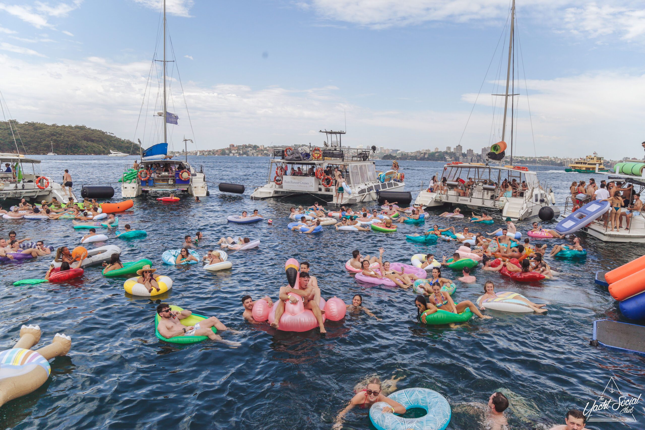 People relax on colorful inflatable tubes in the ocean near anchored boats under a sunny sky, enjoying drinks and socializing. The atmosphere is lively and festive, with clear blue water and city skyline in the background.