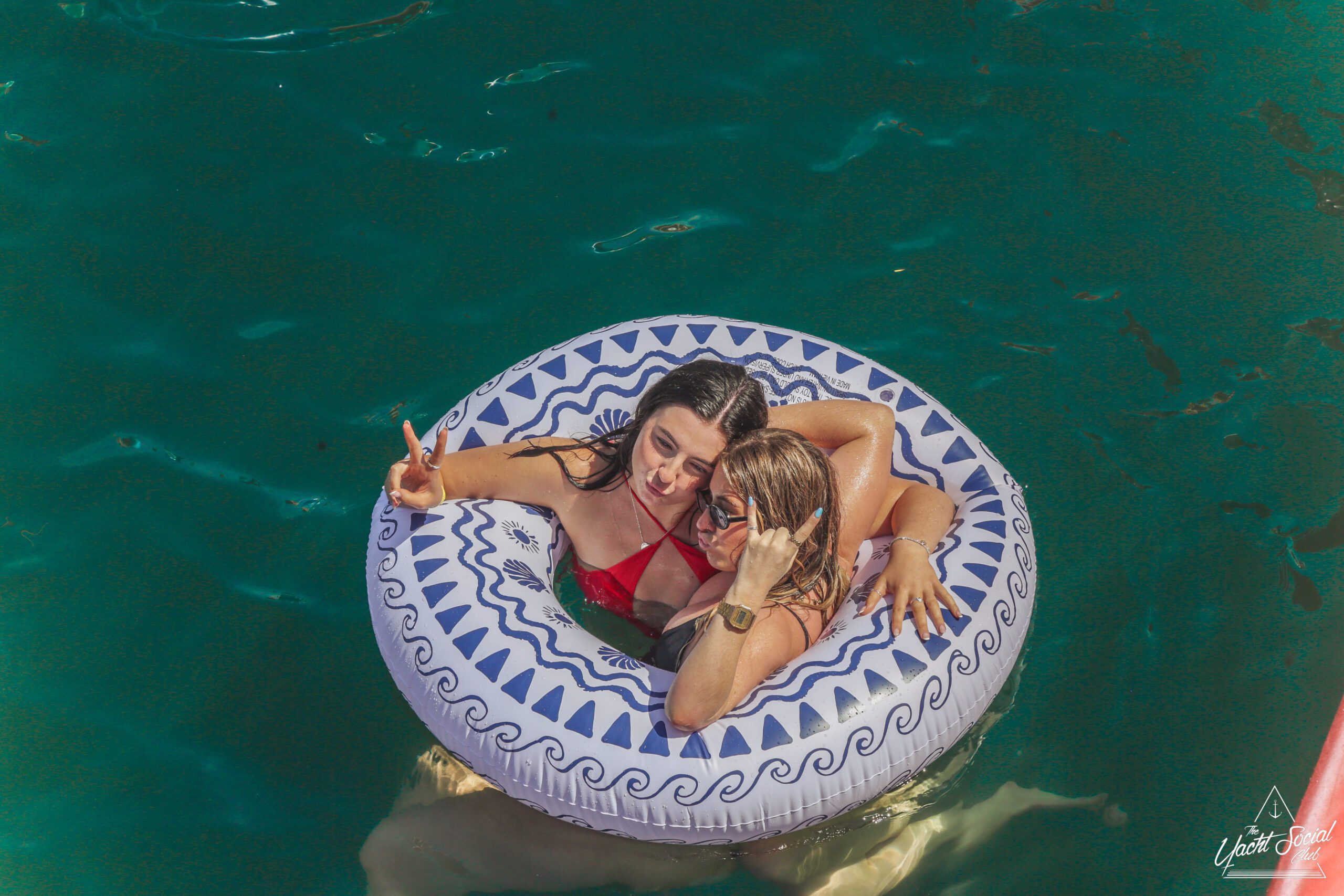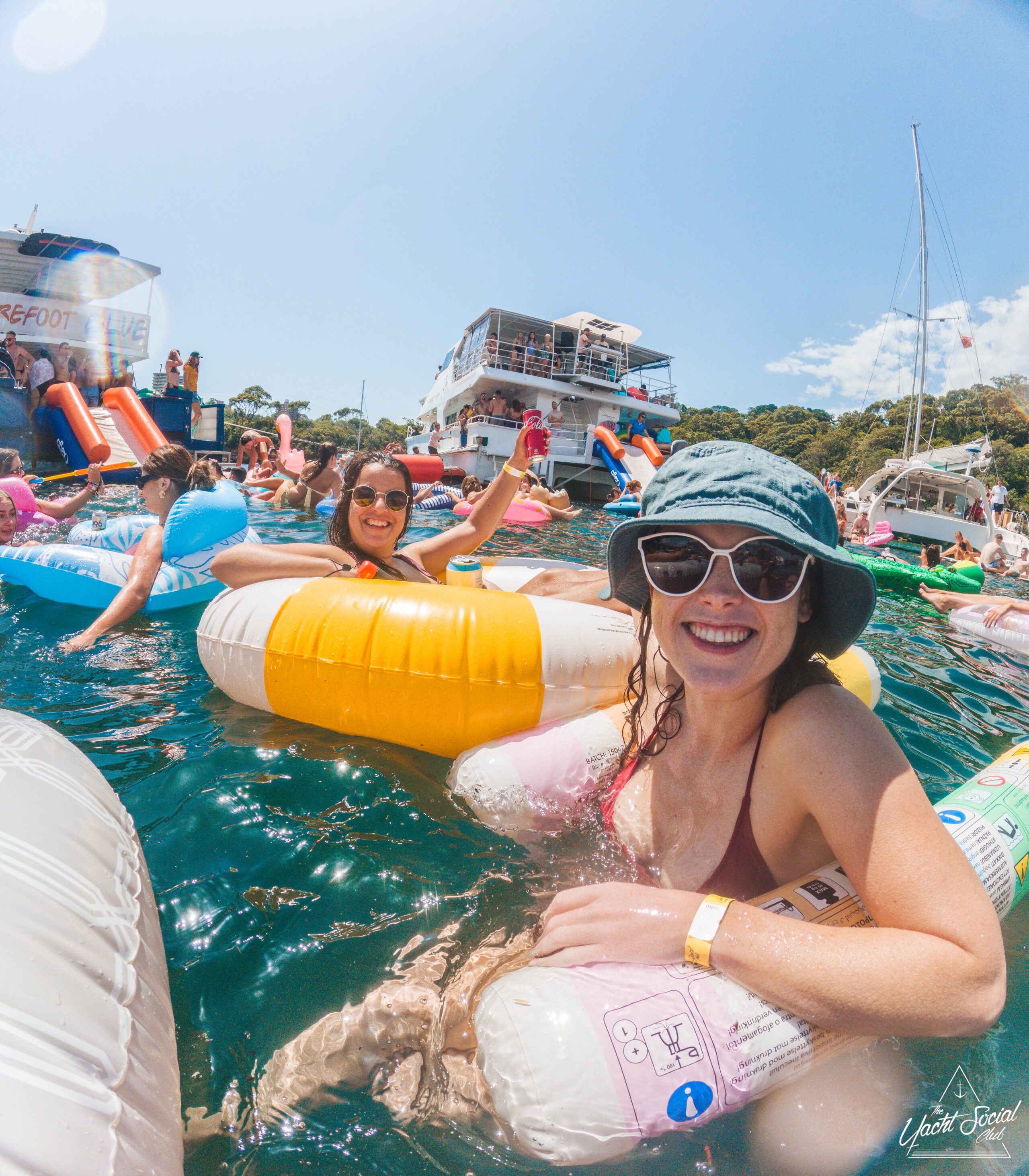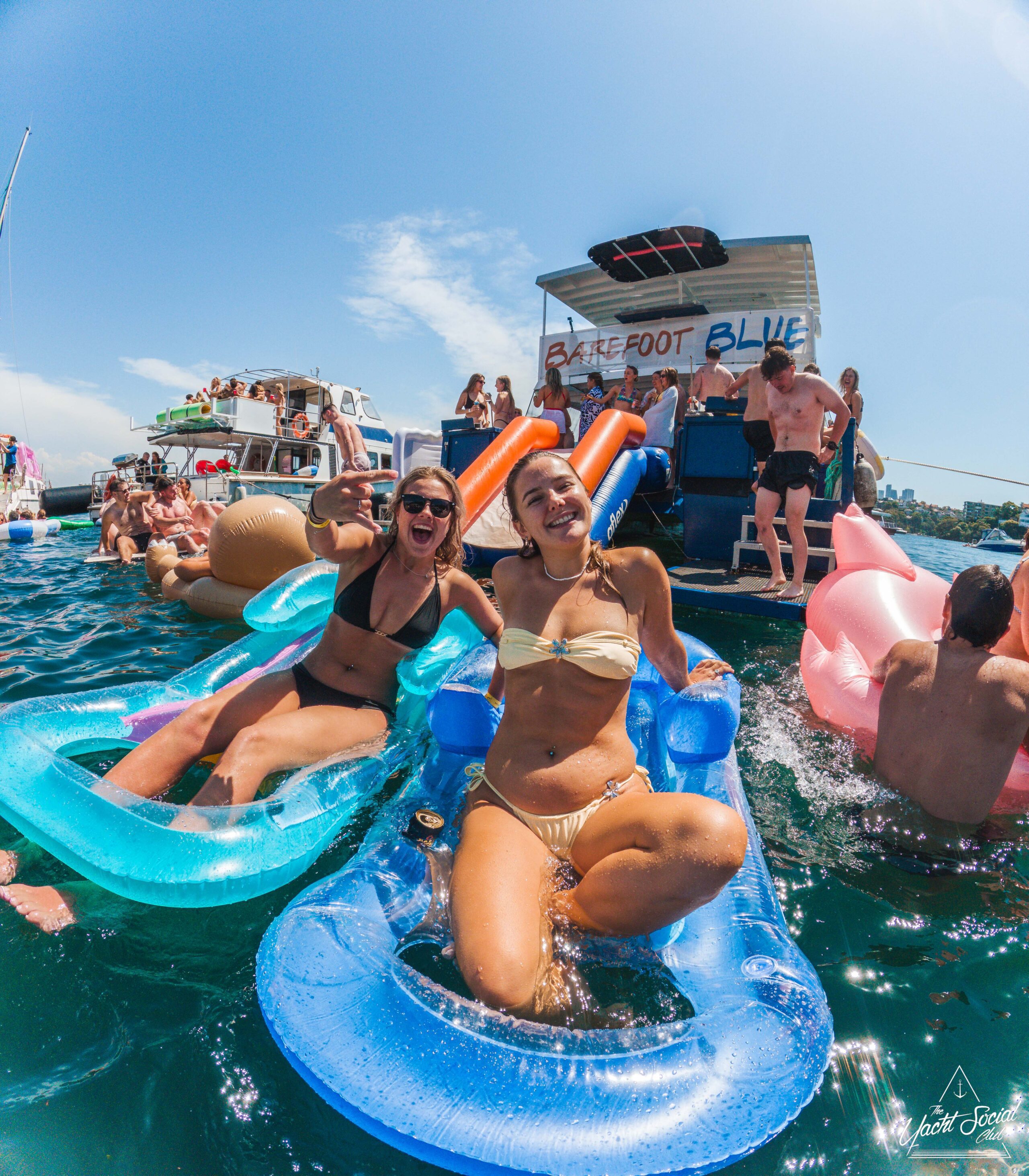 Two women in swimsuits smile and pose on blue inflatable loungers in the water at a lively boat party, with people socializing and relaxing on floats and a houseboat in the background under a sunny sky.