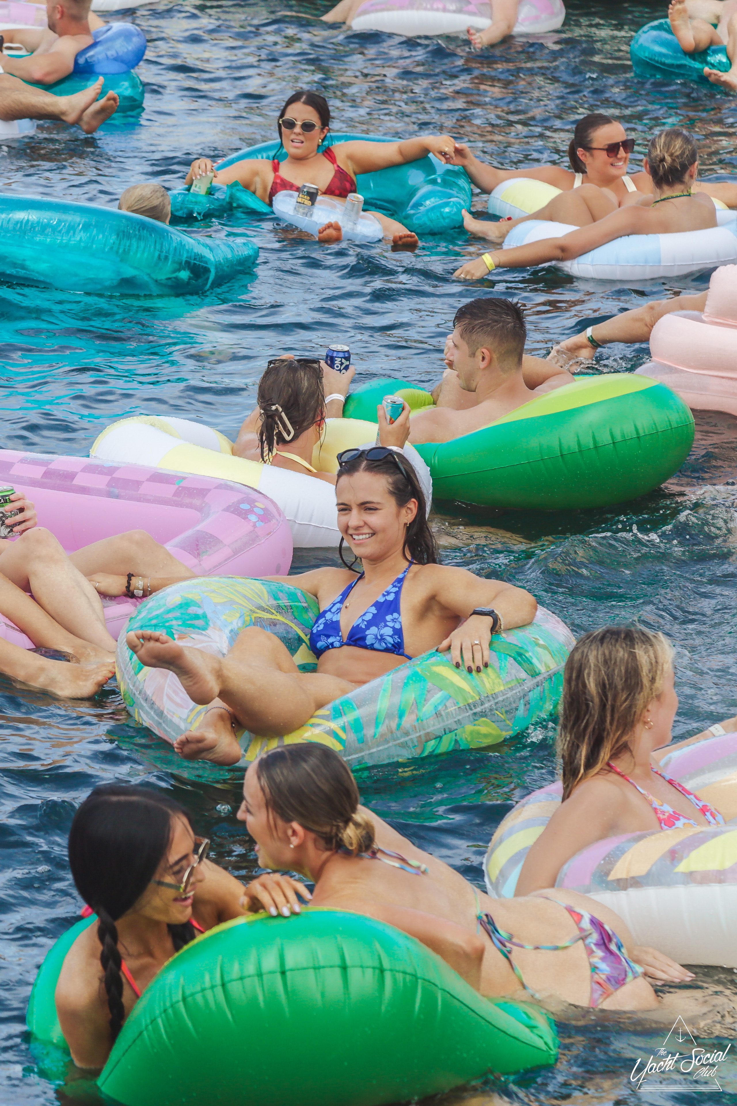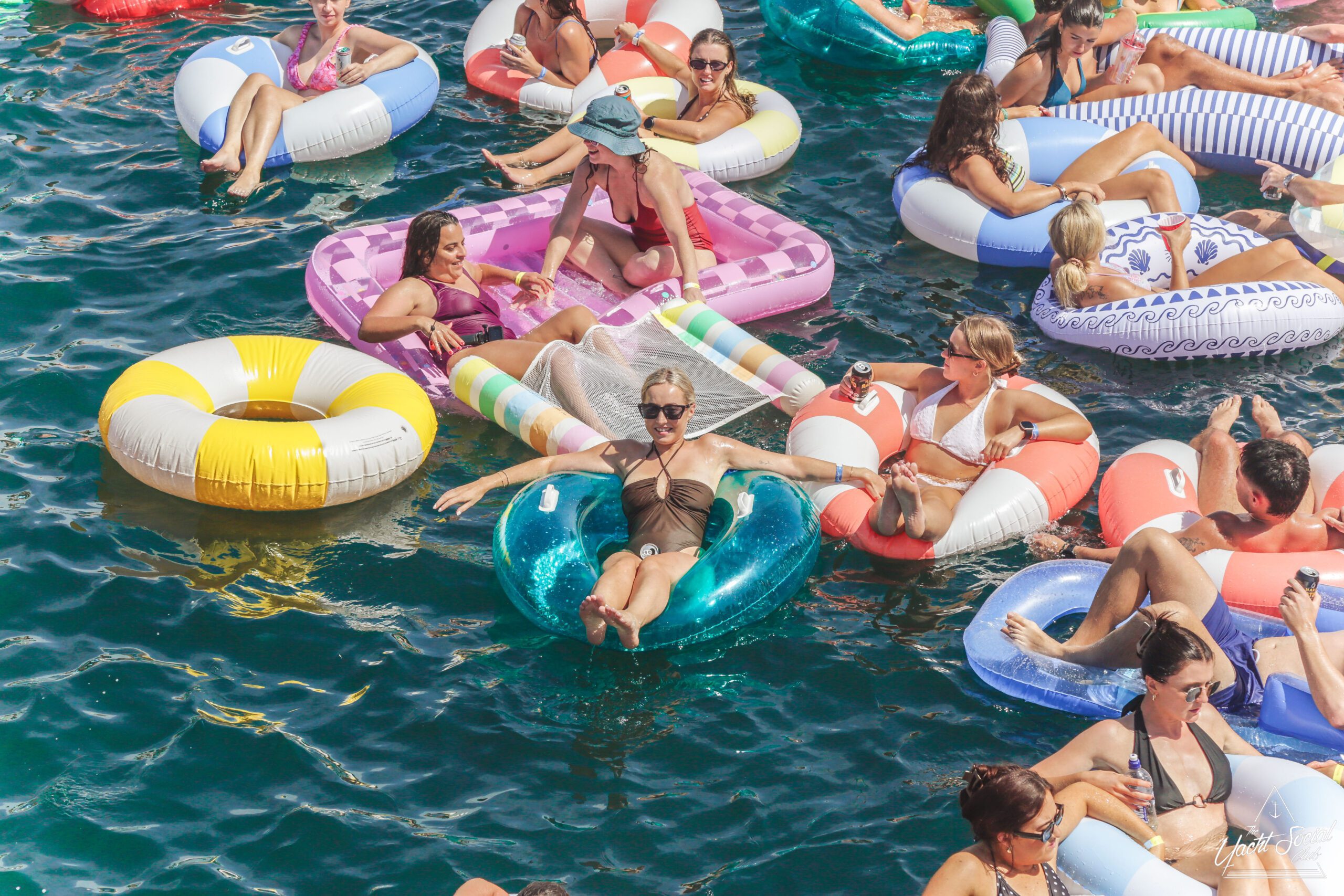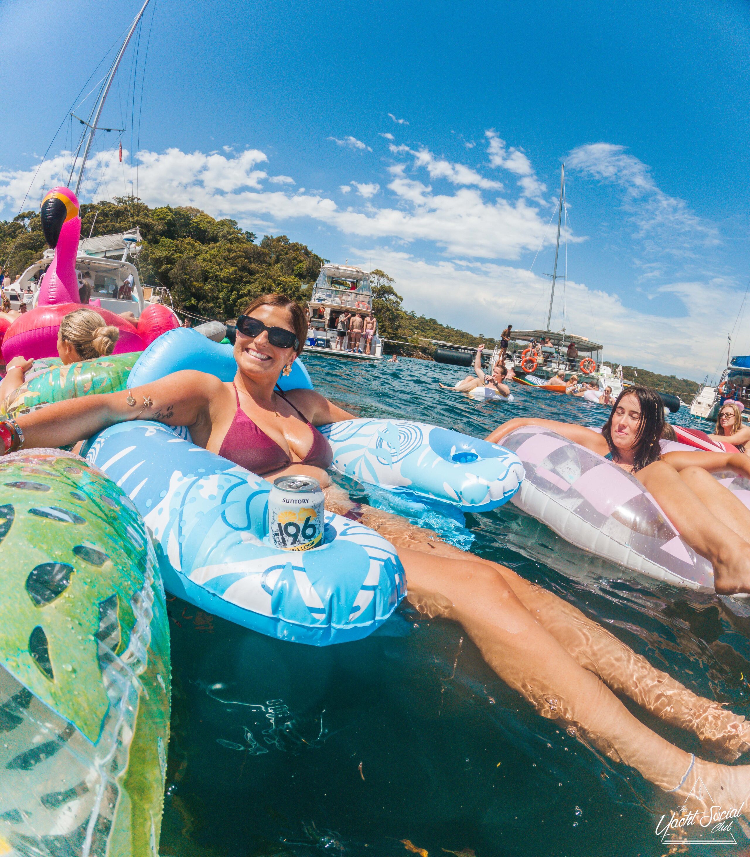 People relaxing on colorful inflatables in the water, with a woman in sunglasses and a bikini smiling at the camera and holding a drink. Boats and more people are in the background under a sunny, blue sky.