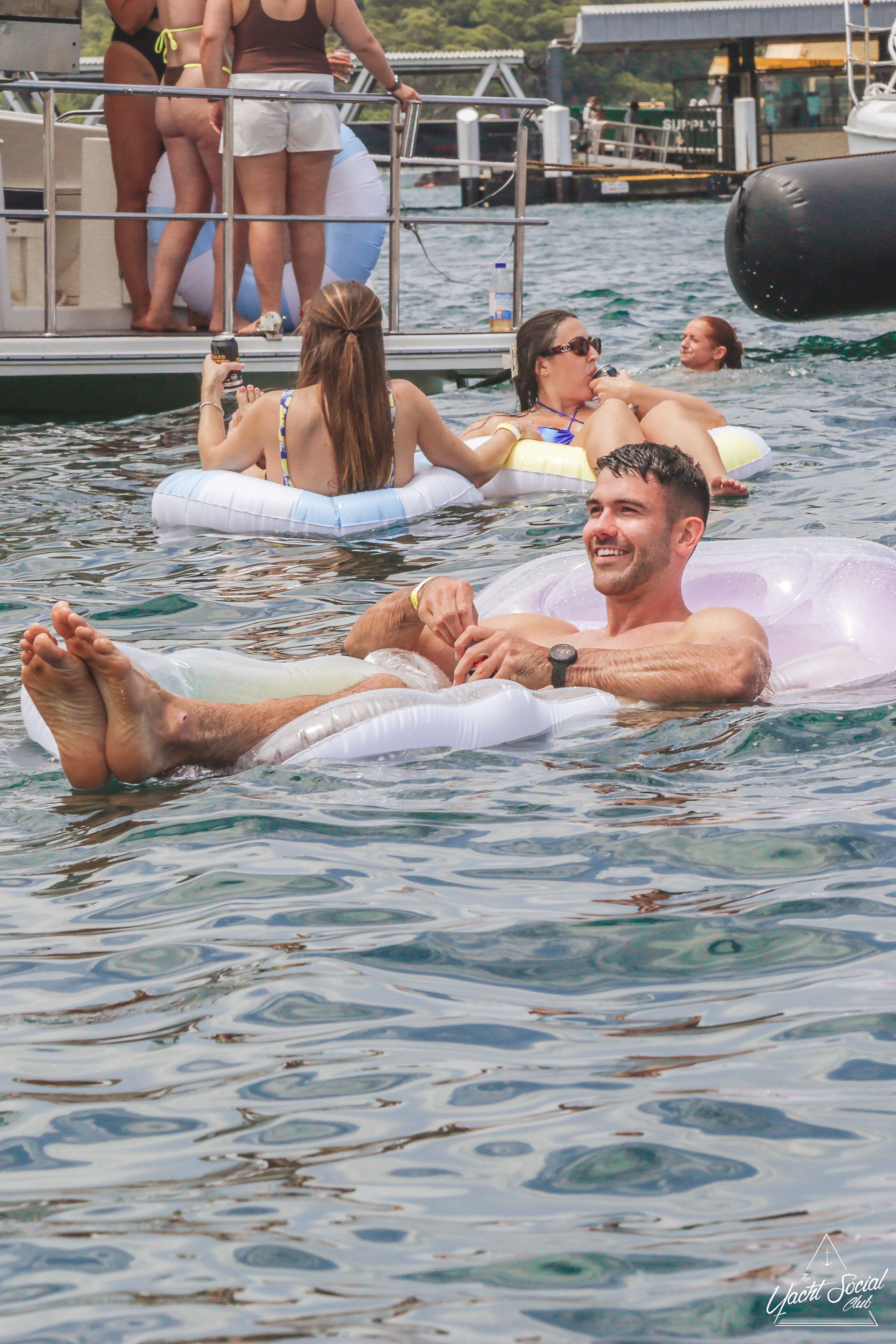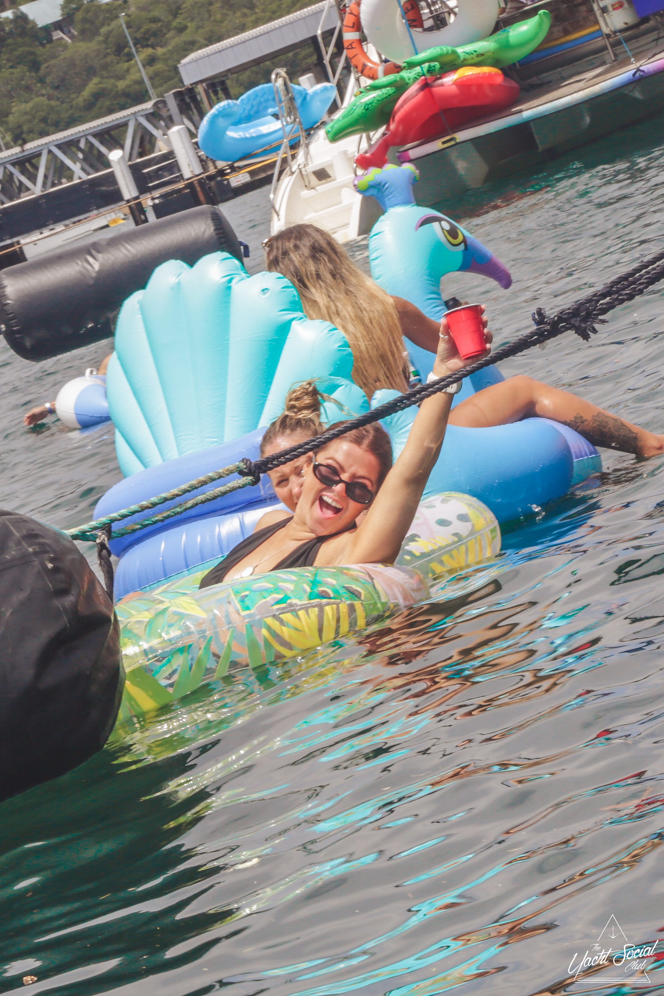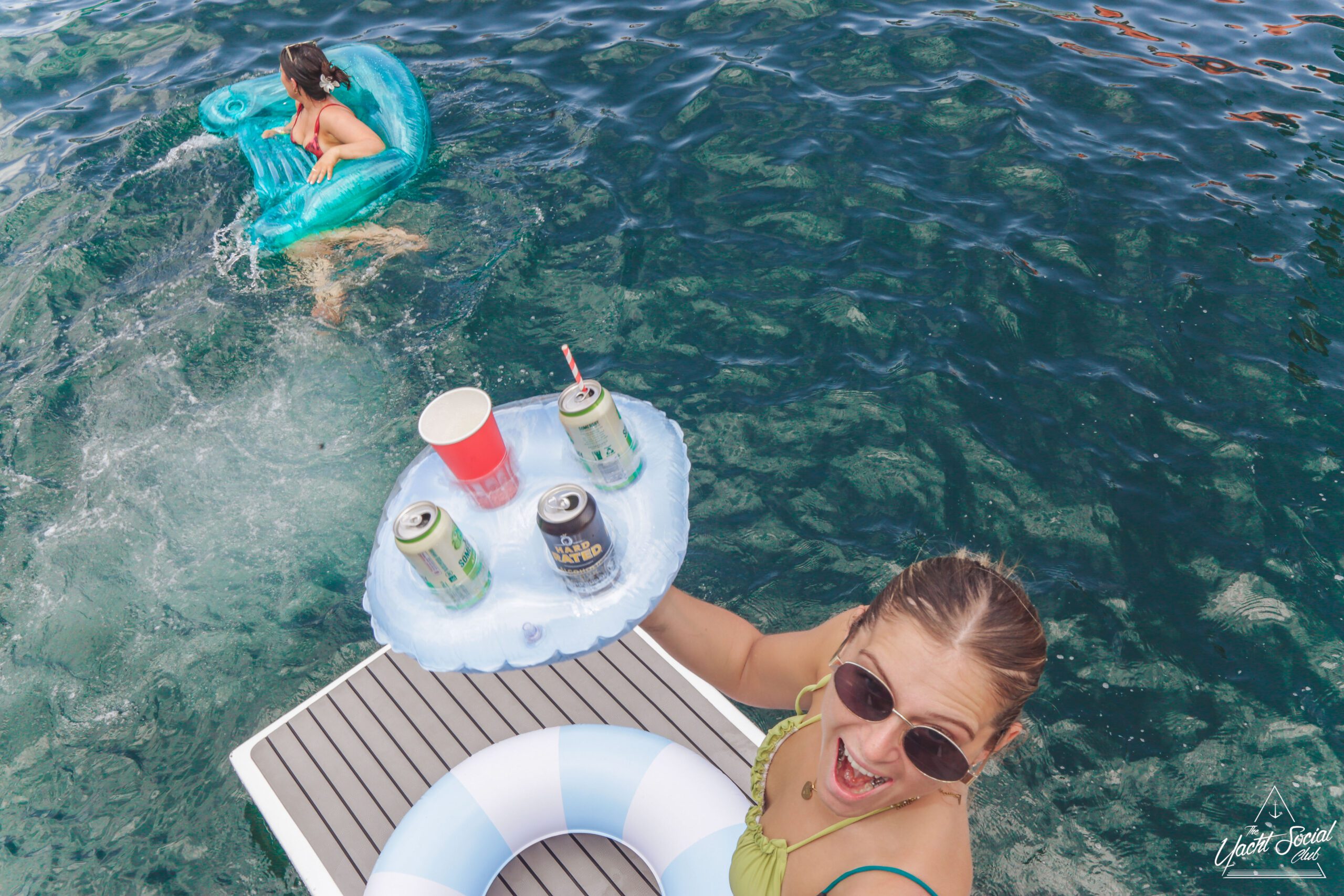 People relaxing on colorful inflatables in the water, with a woman in sunglasses and a bikini smiling at the camera and holding a drink. Boats and more people are in the background under a sunny, blue sky.