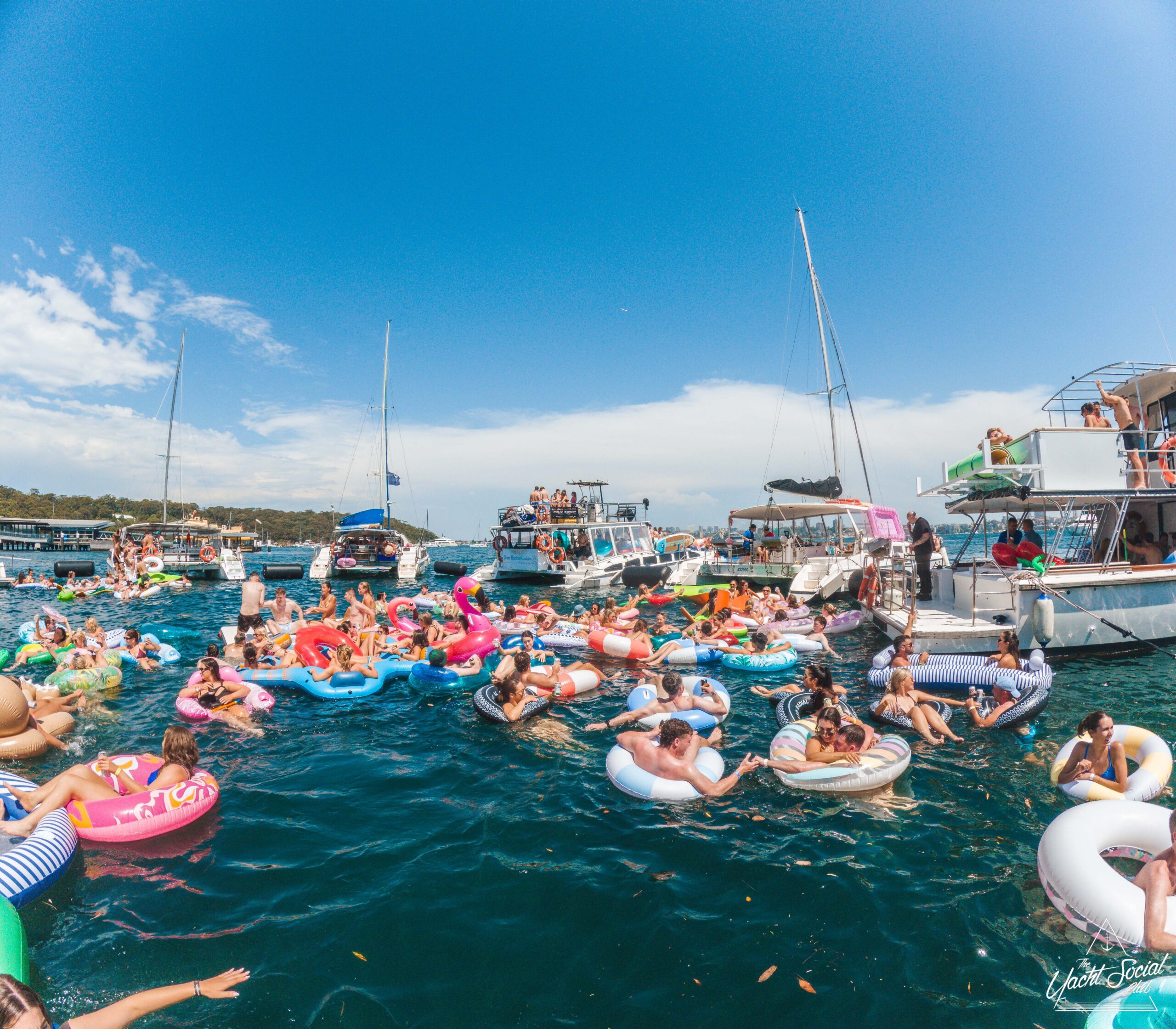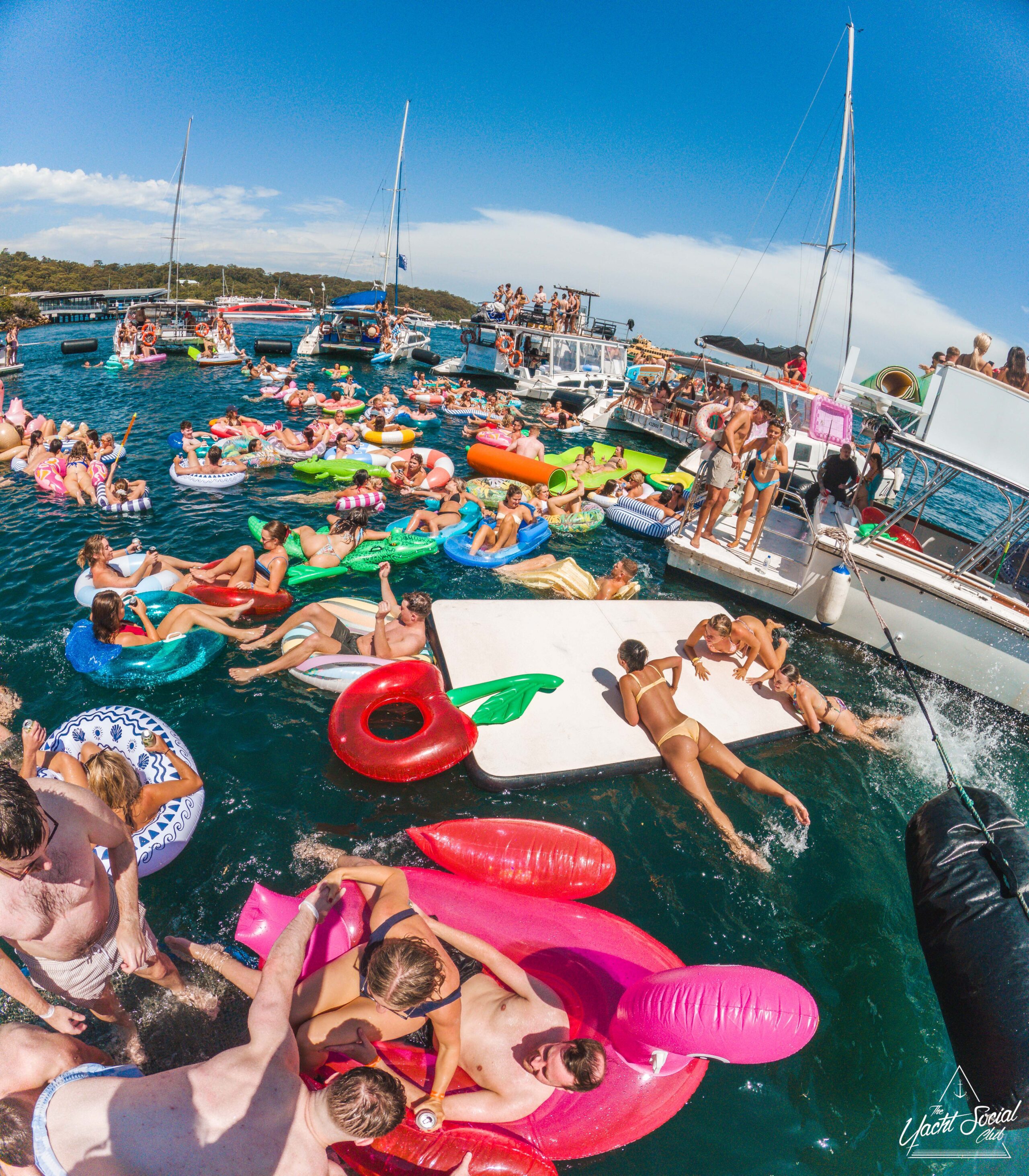A large group of people relax on colorful inflatable floats in the water near several anchored boats on a sunny day, enjoying a lively outdoor pool party under a clear blue sky.