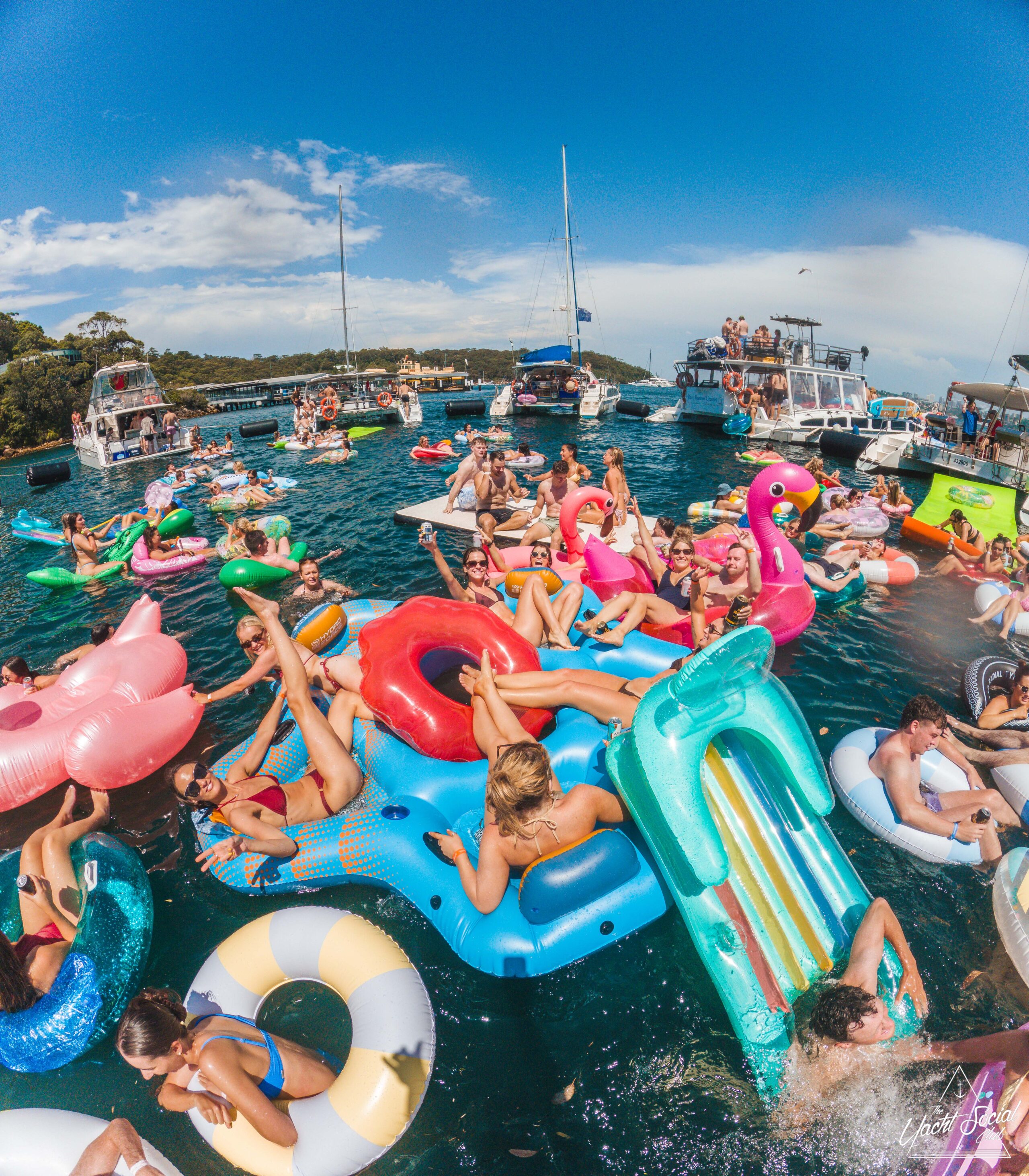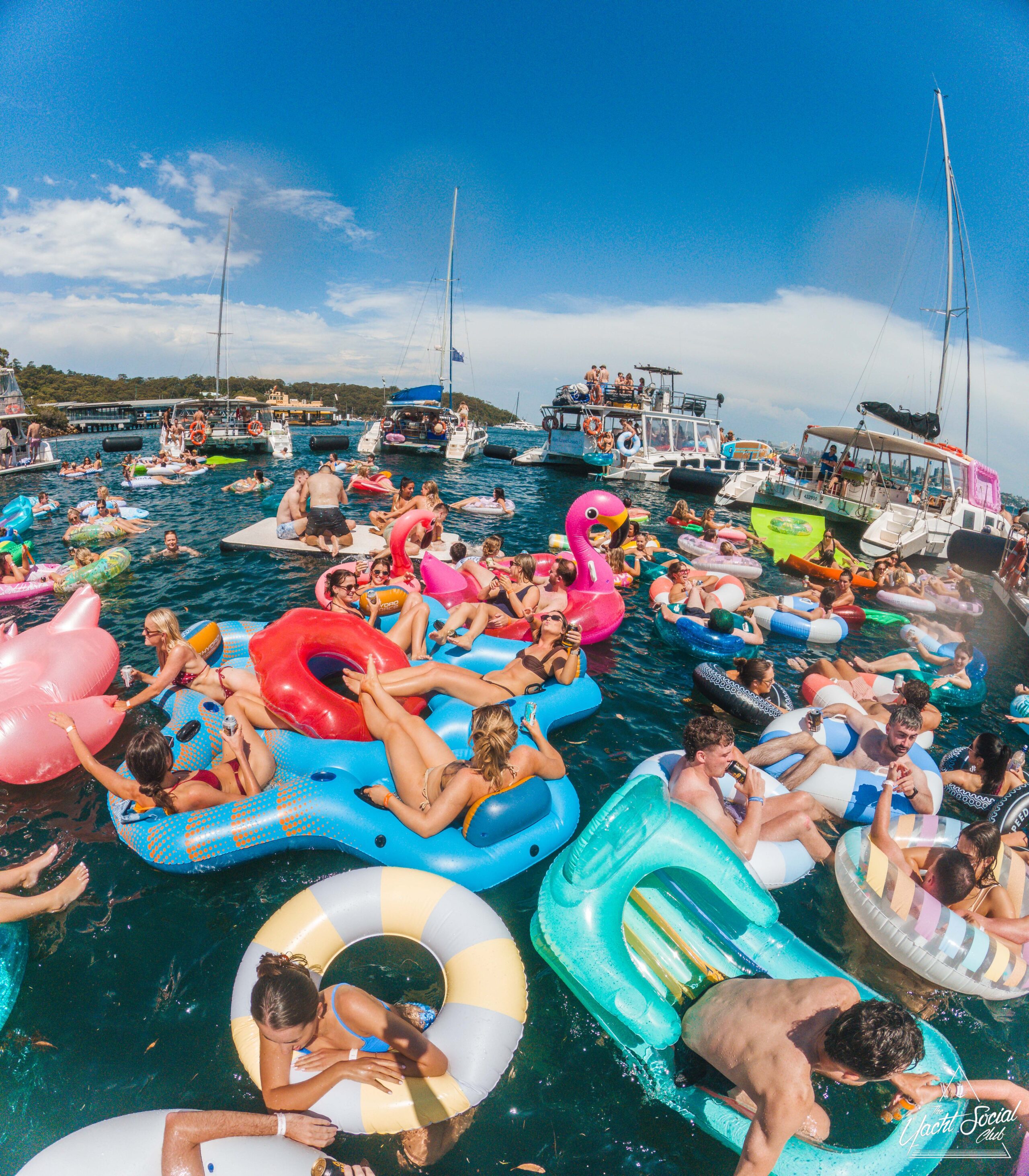 A lively group of people on colorful inflatables and rafts enjoy a sunny day on the water, surrounded by boats and others relaxing or partying on floaties. The atmosphere is festive and vibrant under a blue sky.