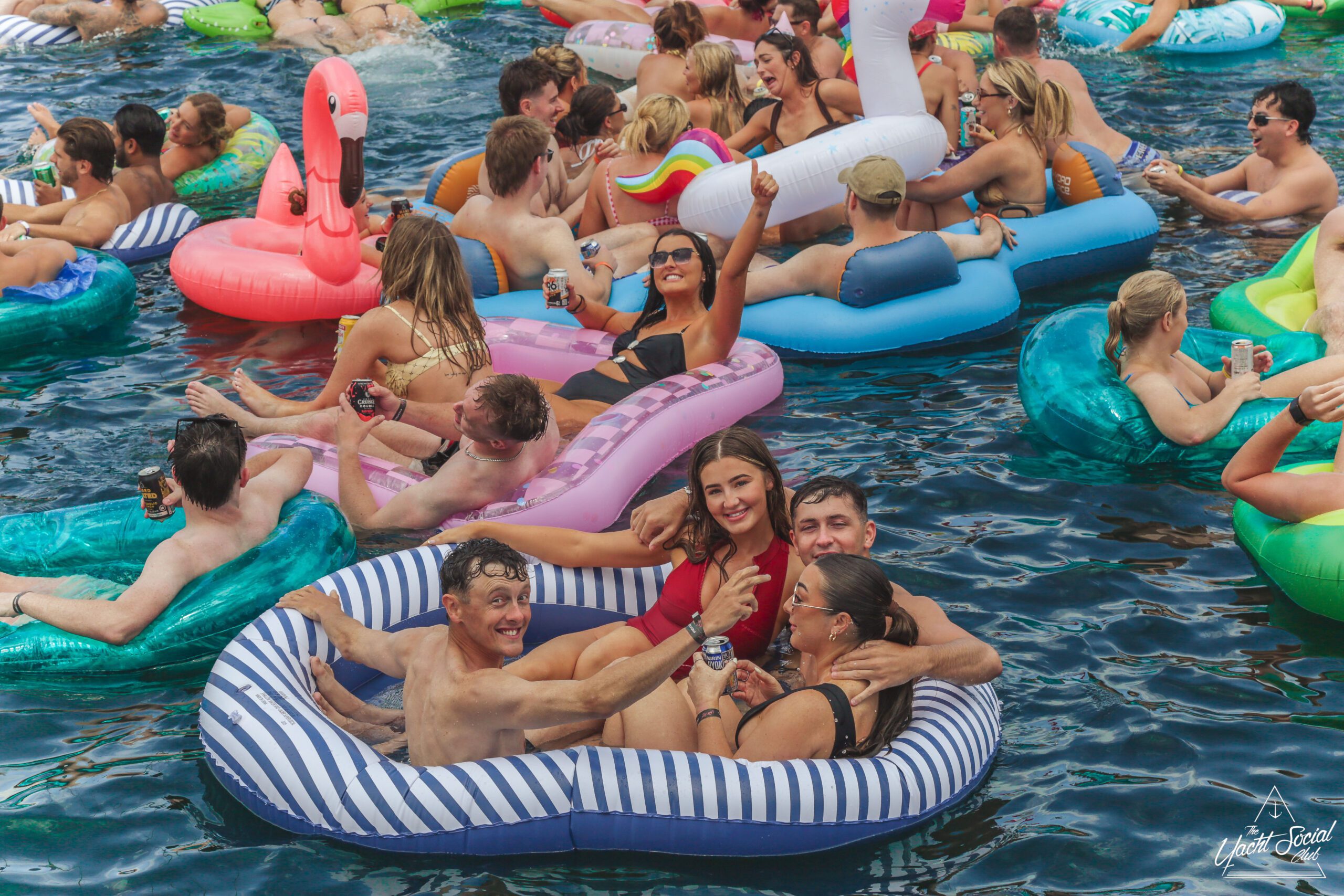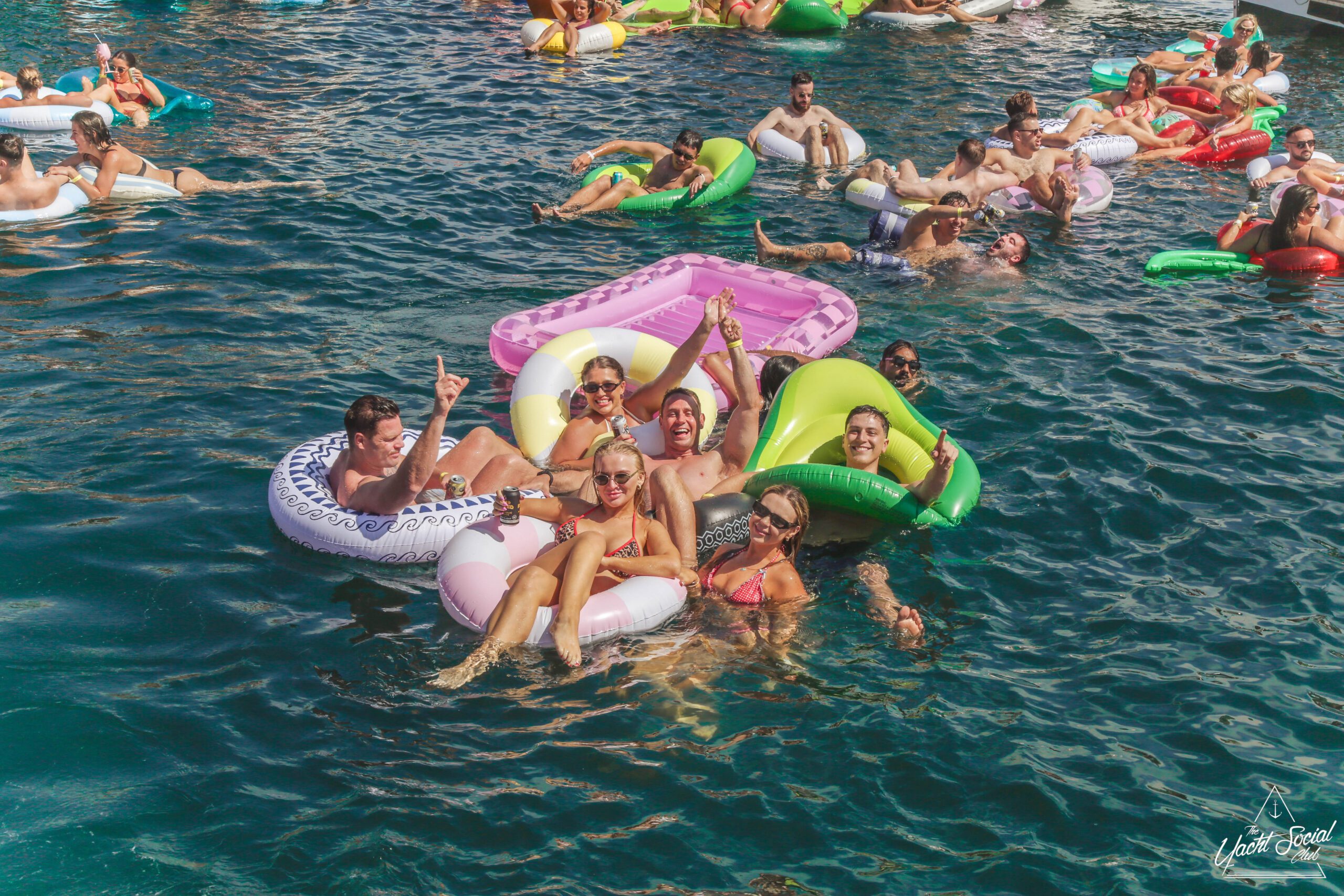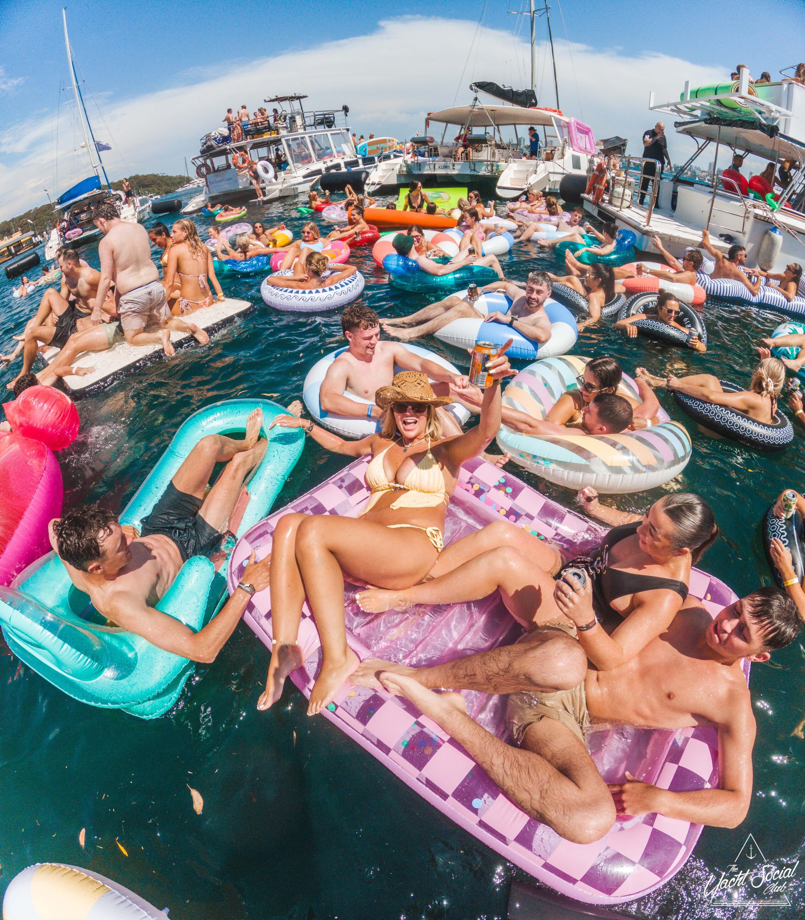 A large group of people are lounging on colorful inflatables and floating in the water near boats, enjoying a sunny day. Many are smiling, raising drinks, and appear to be having a lively, festive time together.