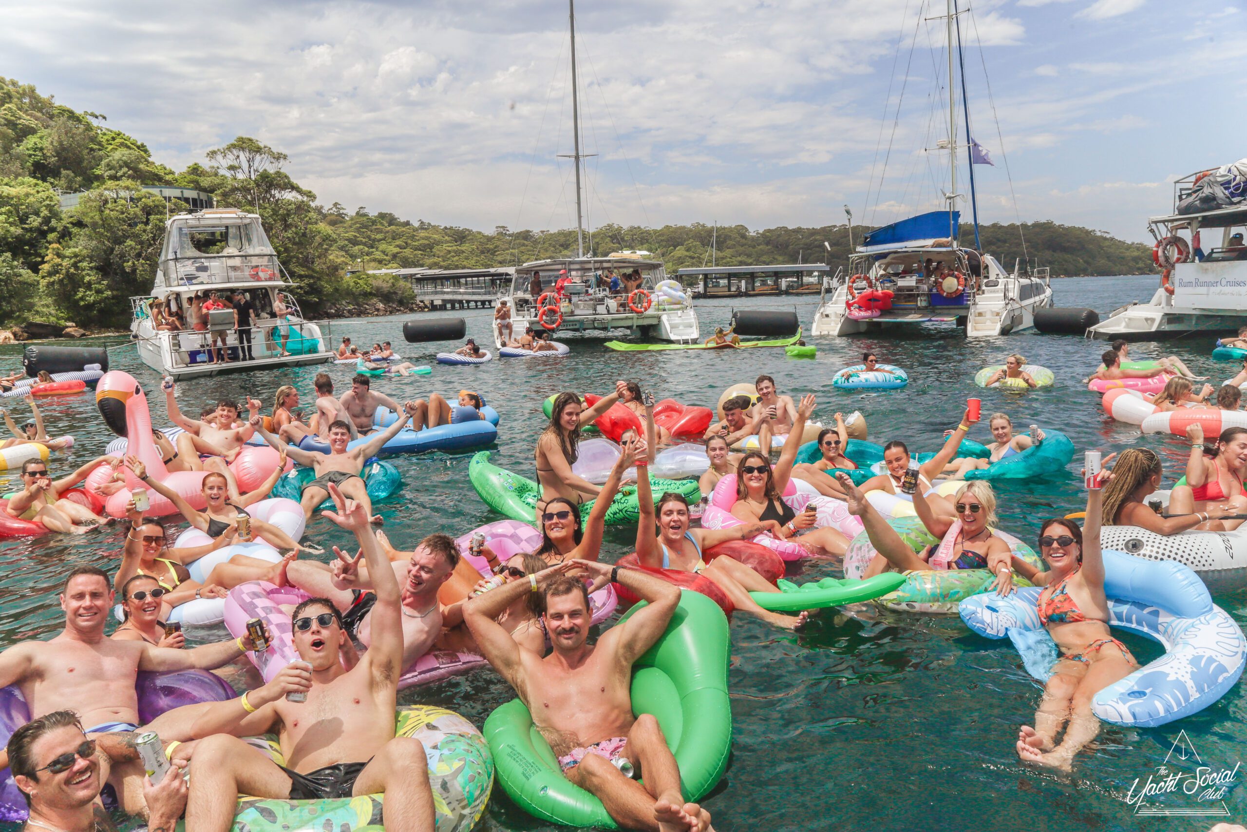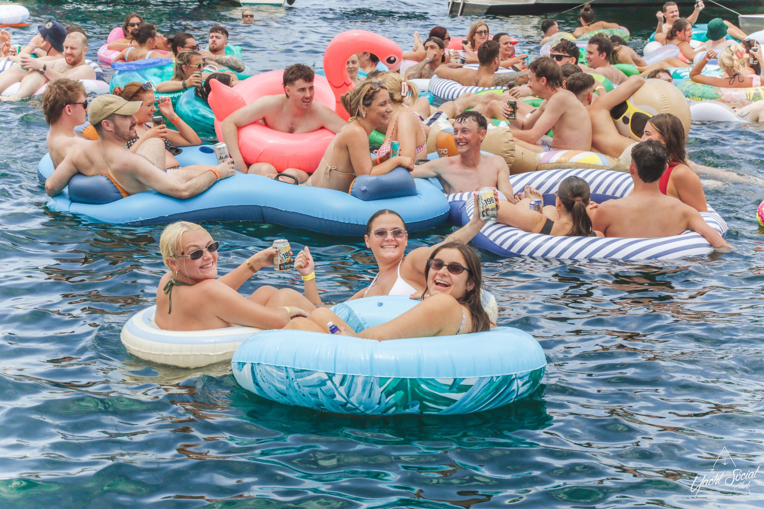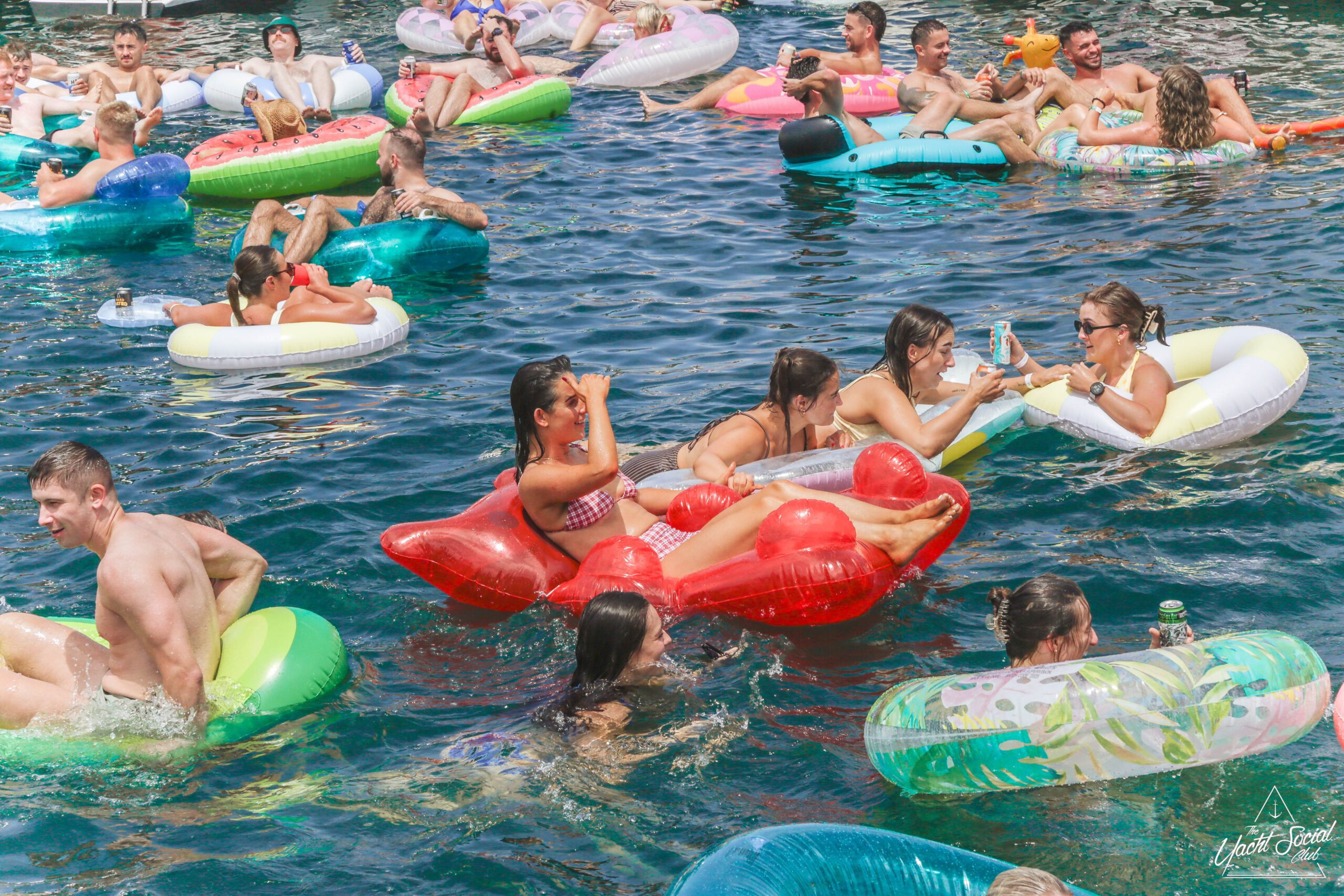 A large group of people are lounging on colorful inflatables and floating in the water near boats, enjoying a sunny day. Many are smiling, raising drinks, and appear to be having a lively, festive time together.