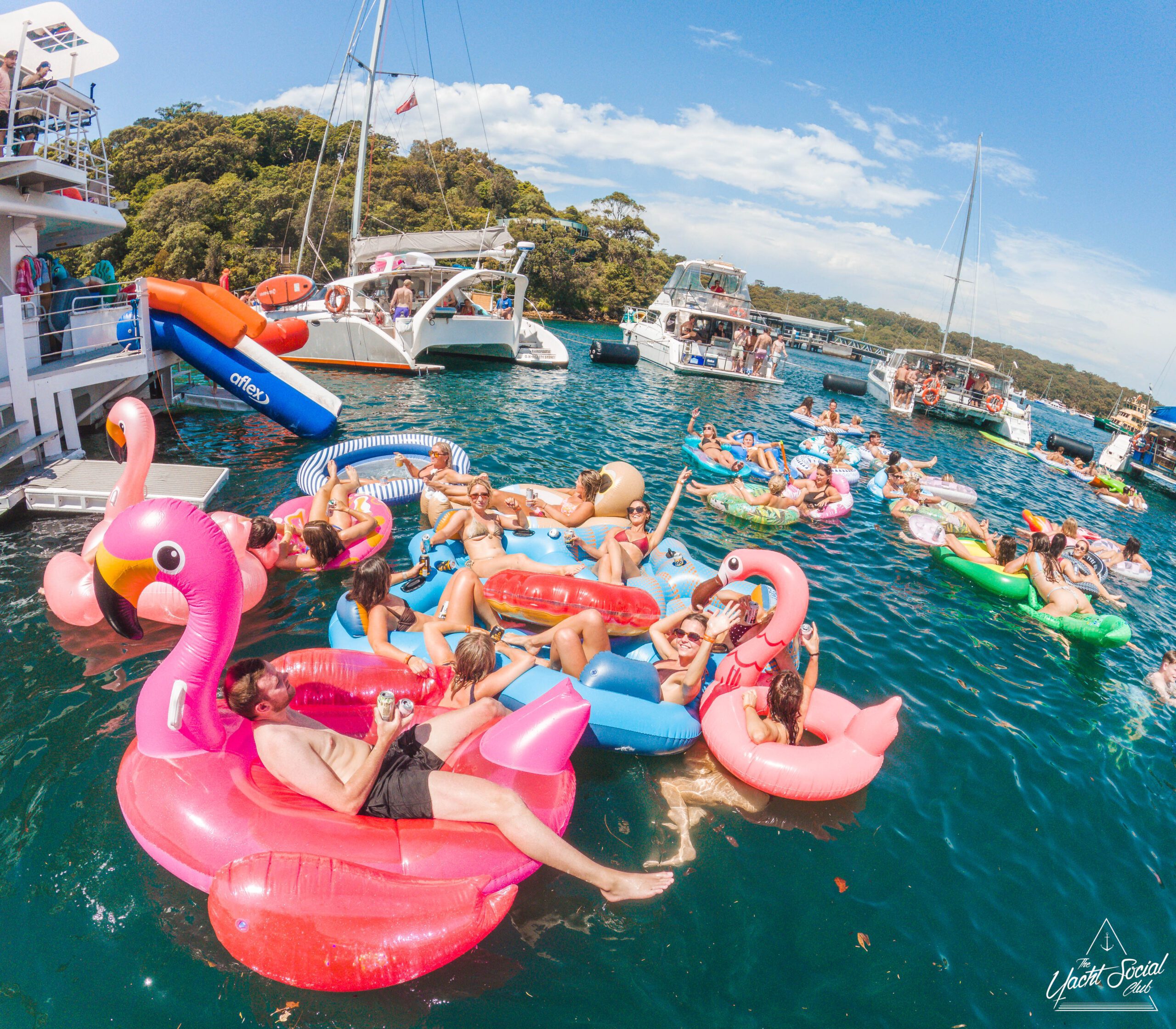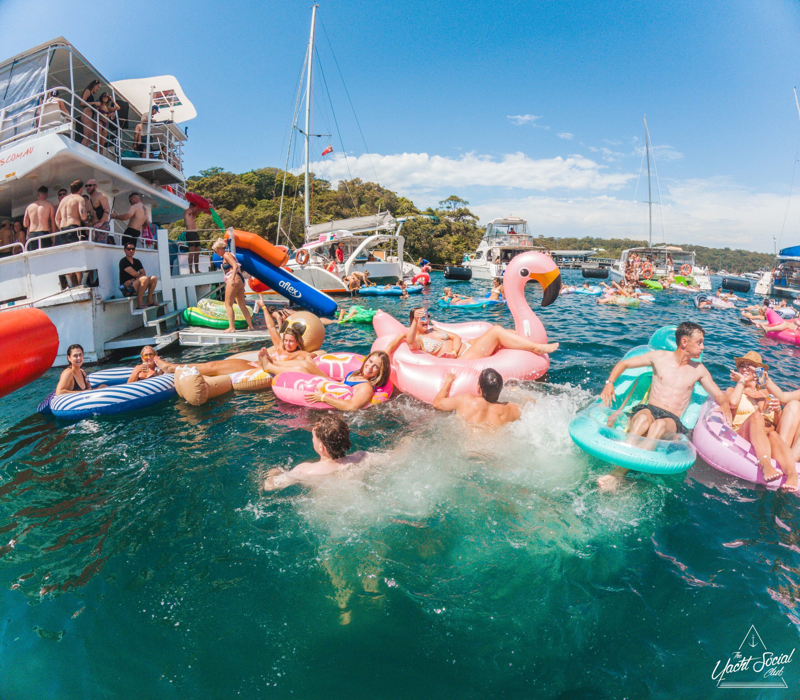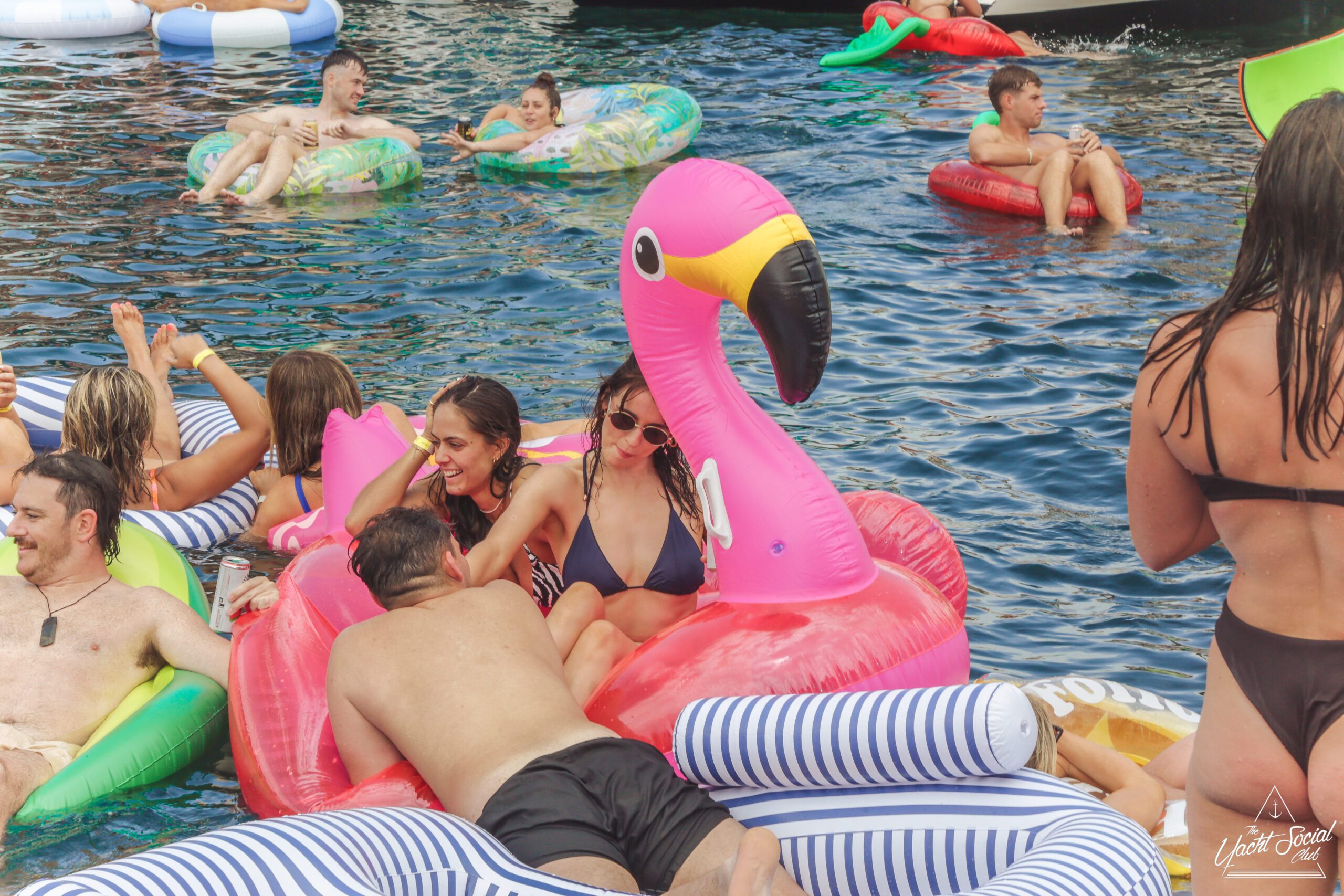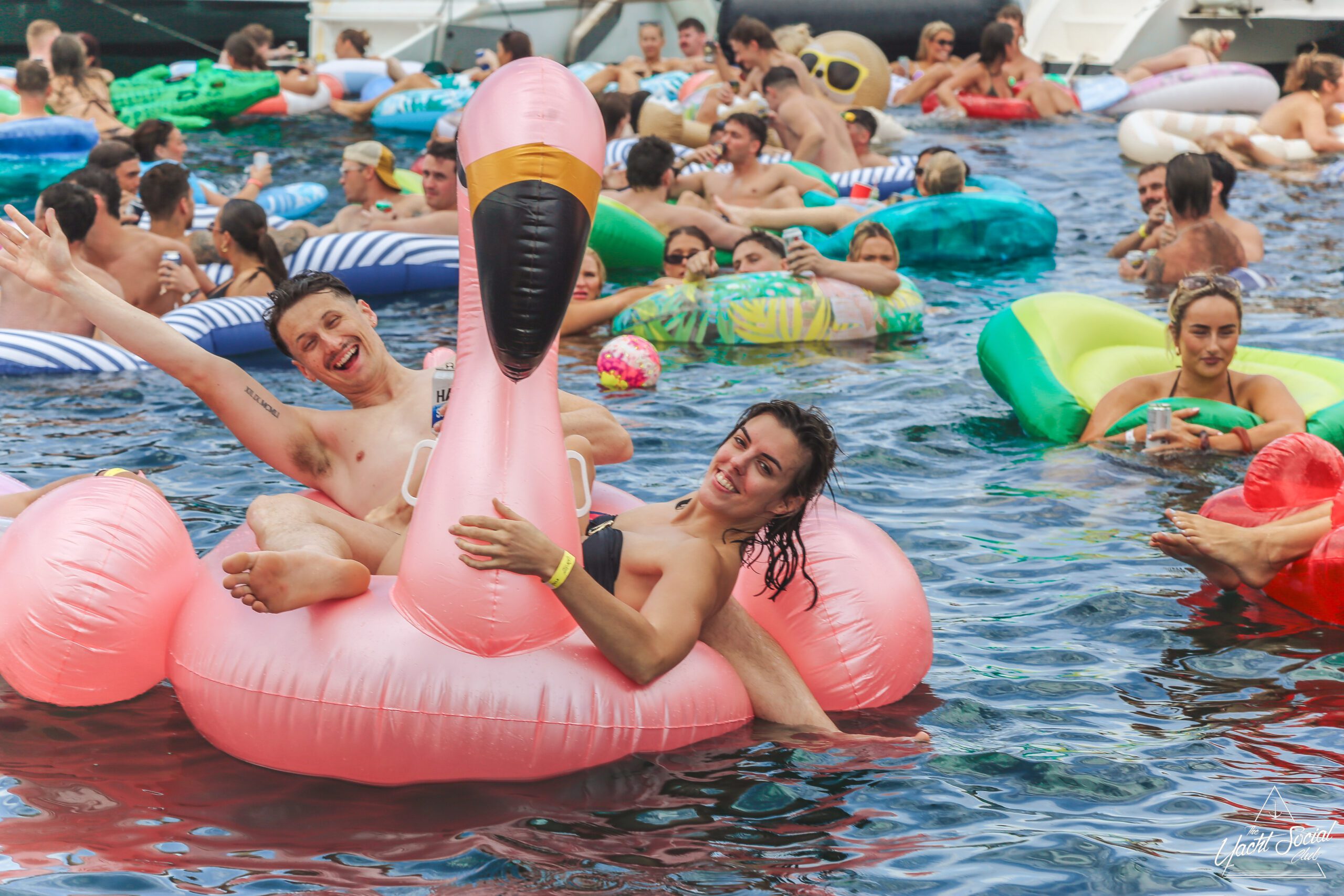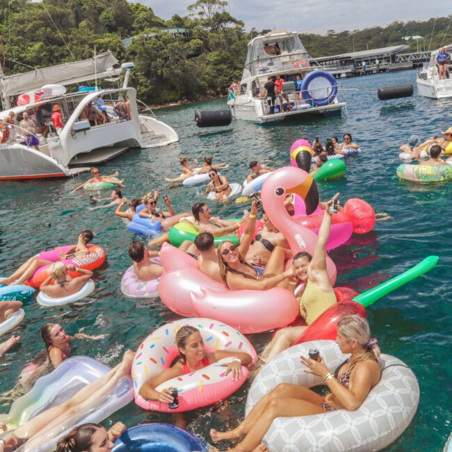 People relaxing on colorful pool floats, including a large pink flamingo, near a white party boat with others onboard. It’s a sunny day and everyone appears to be enjoying the water and festivities.