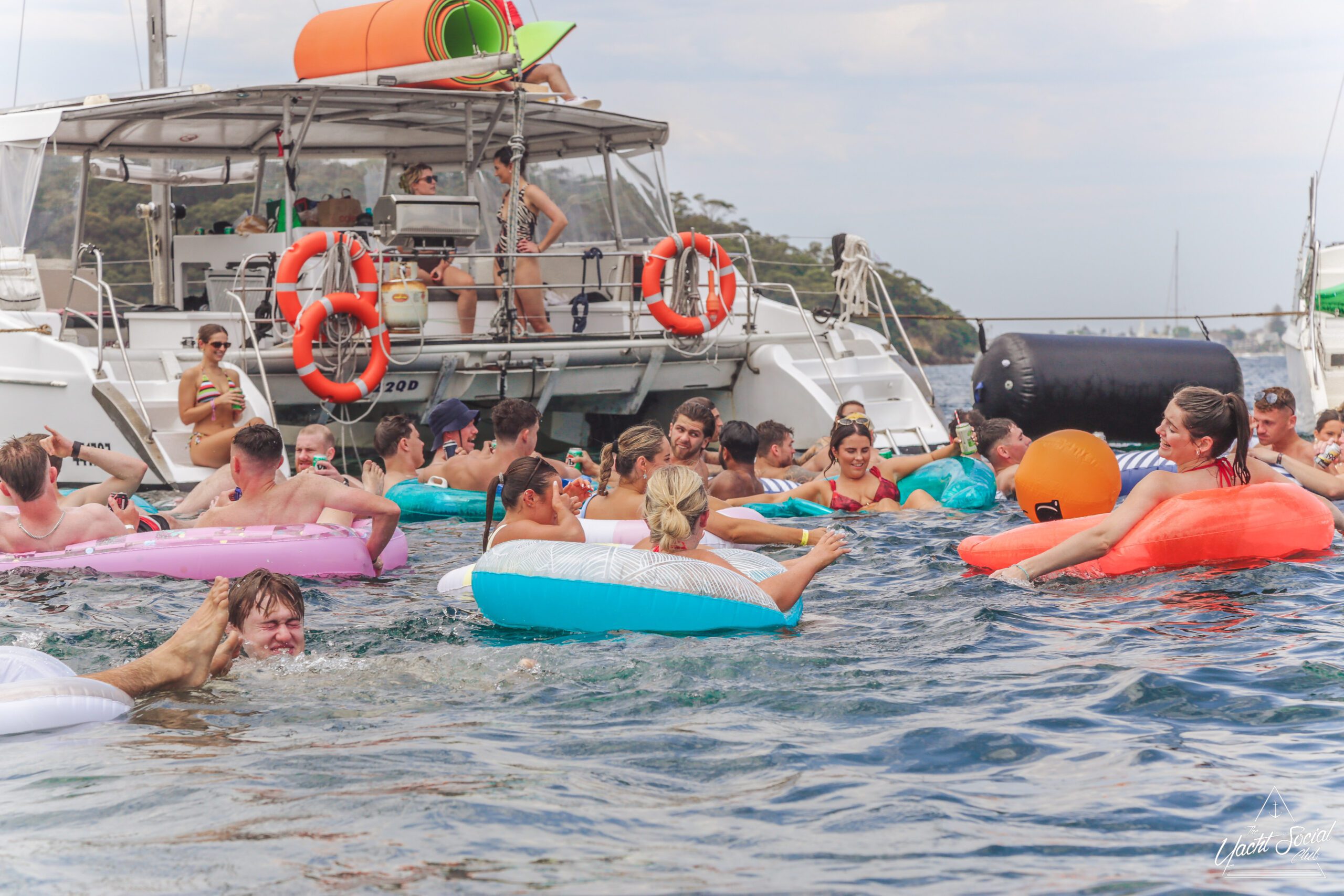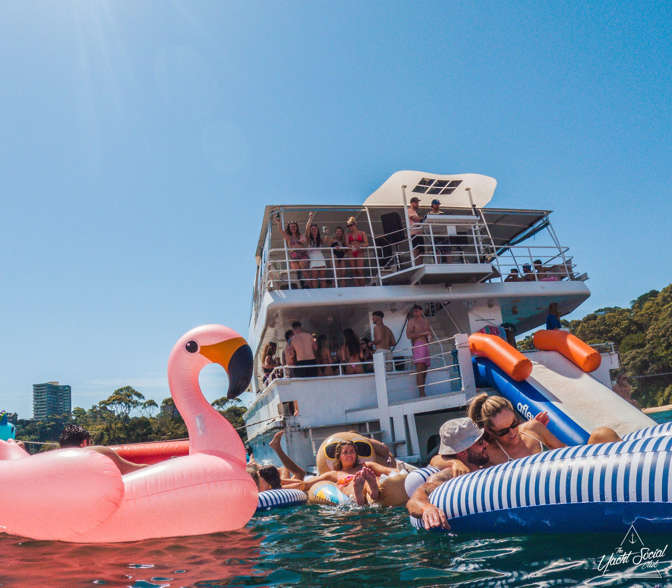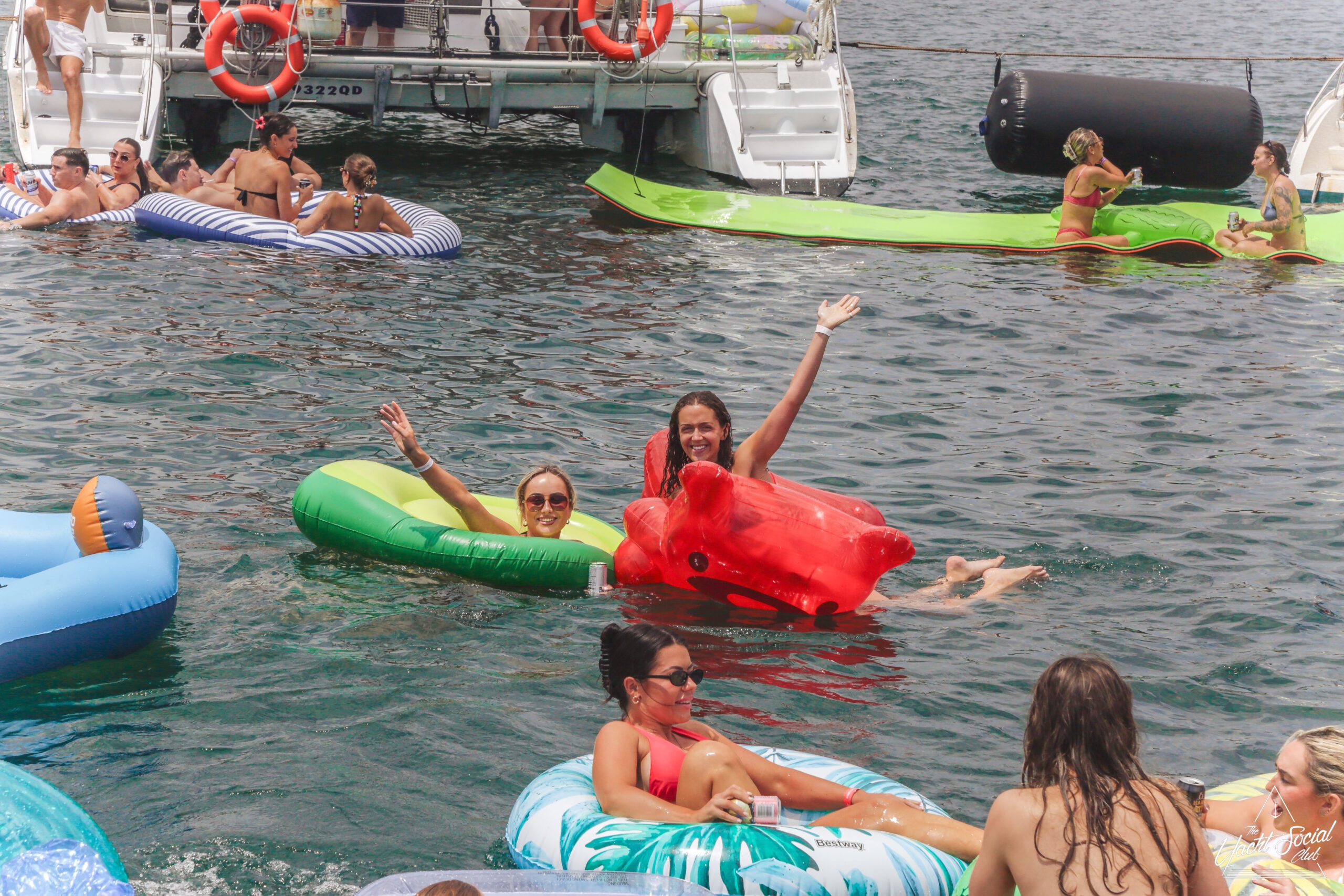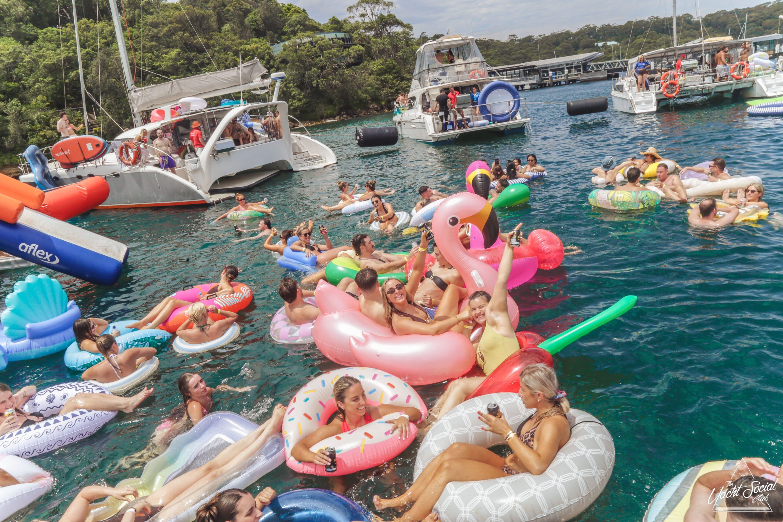 People relaxing on colorful pool floats, including a large pink flamingo, near a white party boat with others onboard. It’s a sunny day and everyone appears to be enjoying the water and festivities.