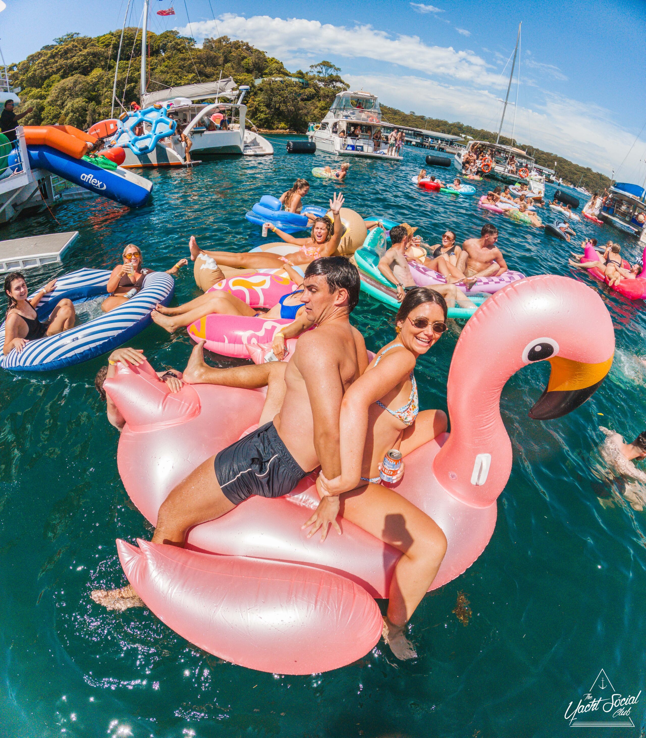 A group of people float on colorful inflatables in a sunlit bay. In the foreground, two people smile while sitting on a large pink flamingo float. Boats and others on floats are visible in the background under a blue sky.