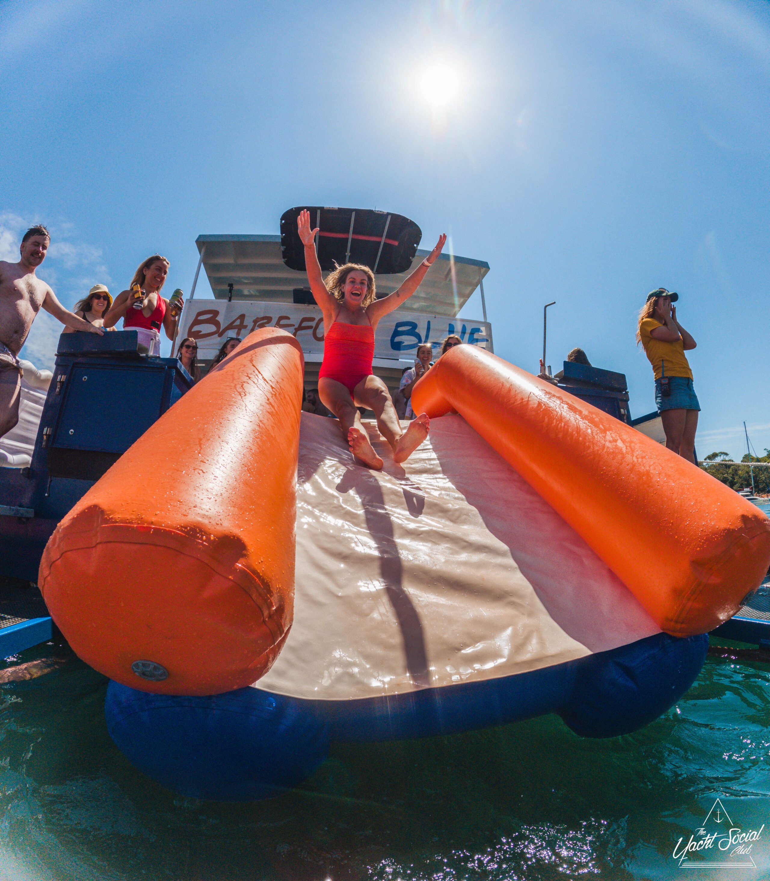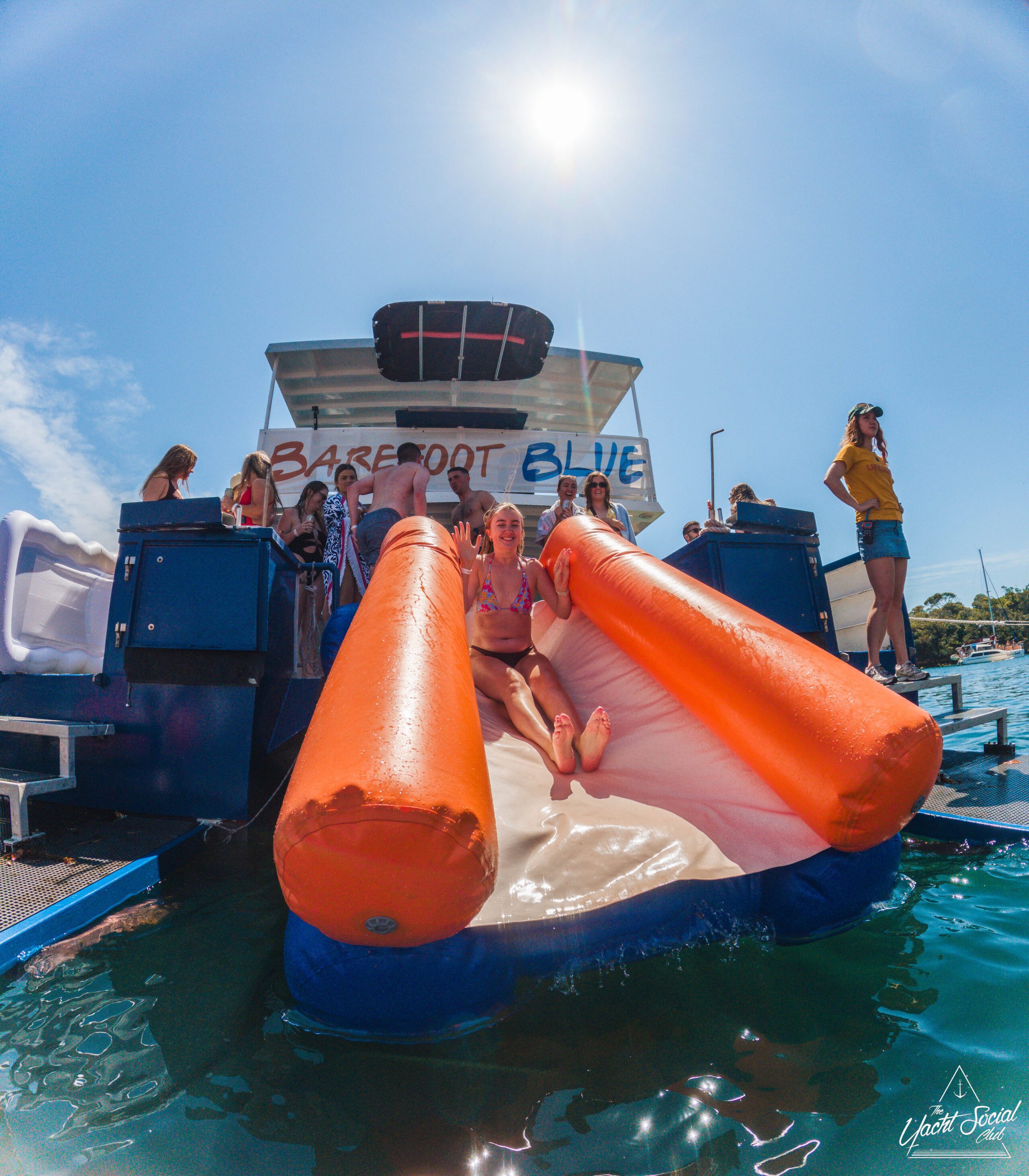 A woman slides down an inflatable orange and white water slide attached to a boat named "Barefoot Blue," surrounded by people enjoying a sunny day on the water.