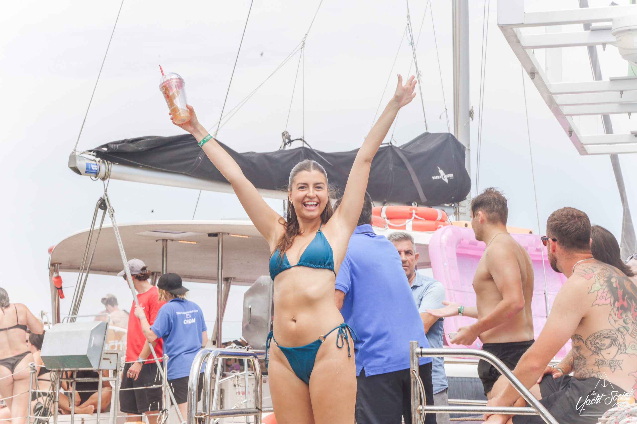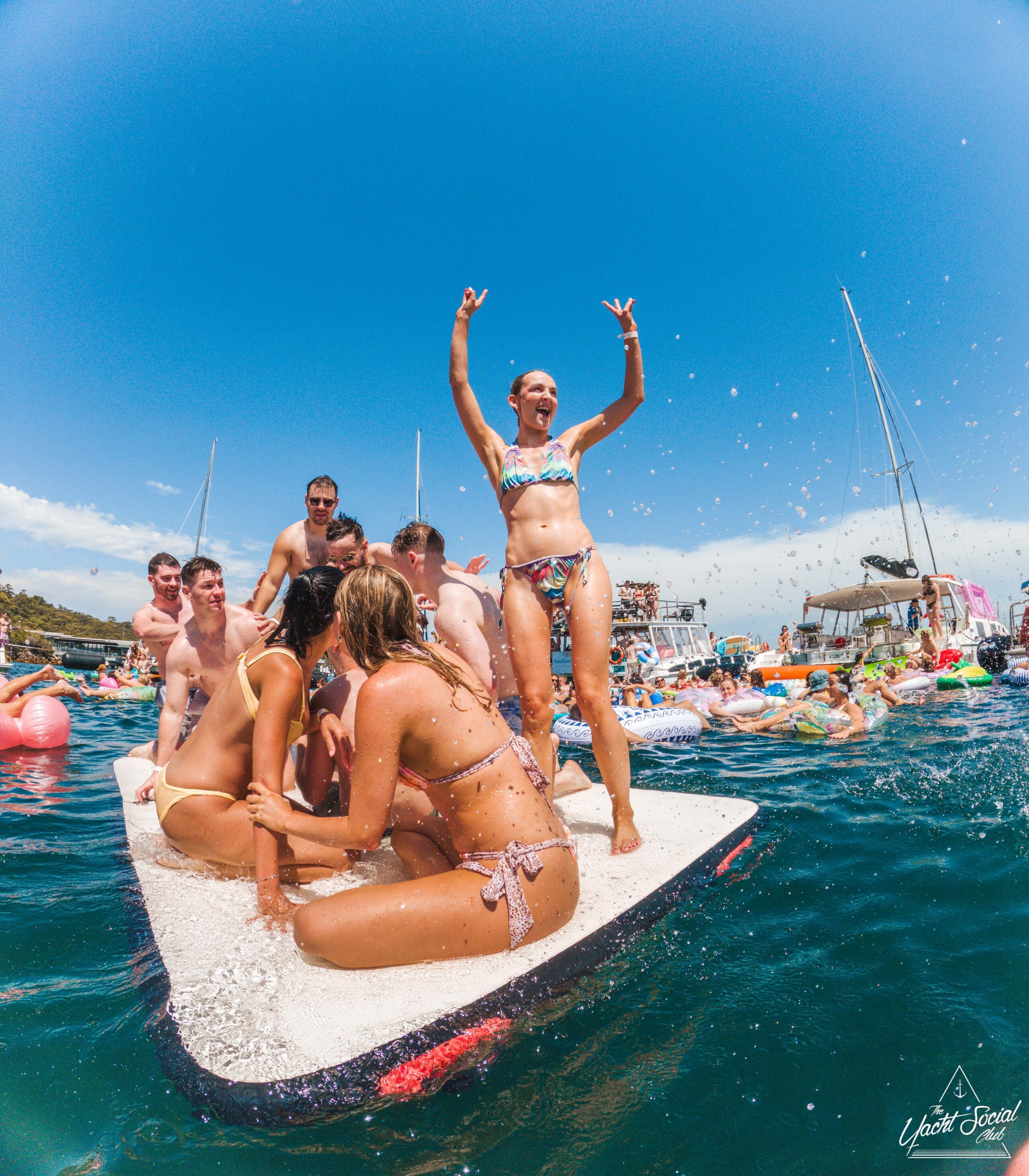 A woman in a yellow bikini poses and smiles on a boat, raising one arm. Behind her, people enjoy a lively party on multiple boats, with floats in the water under a sunny sky.