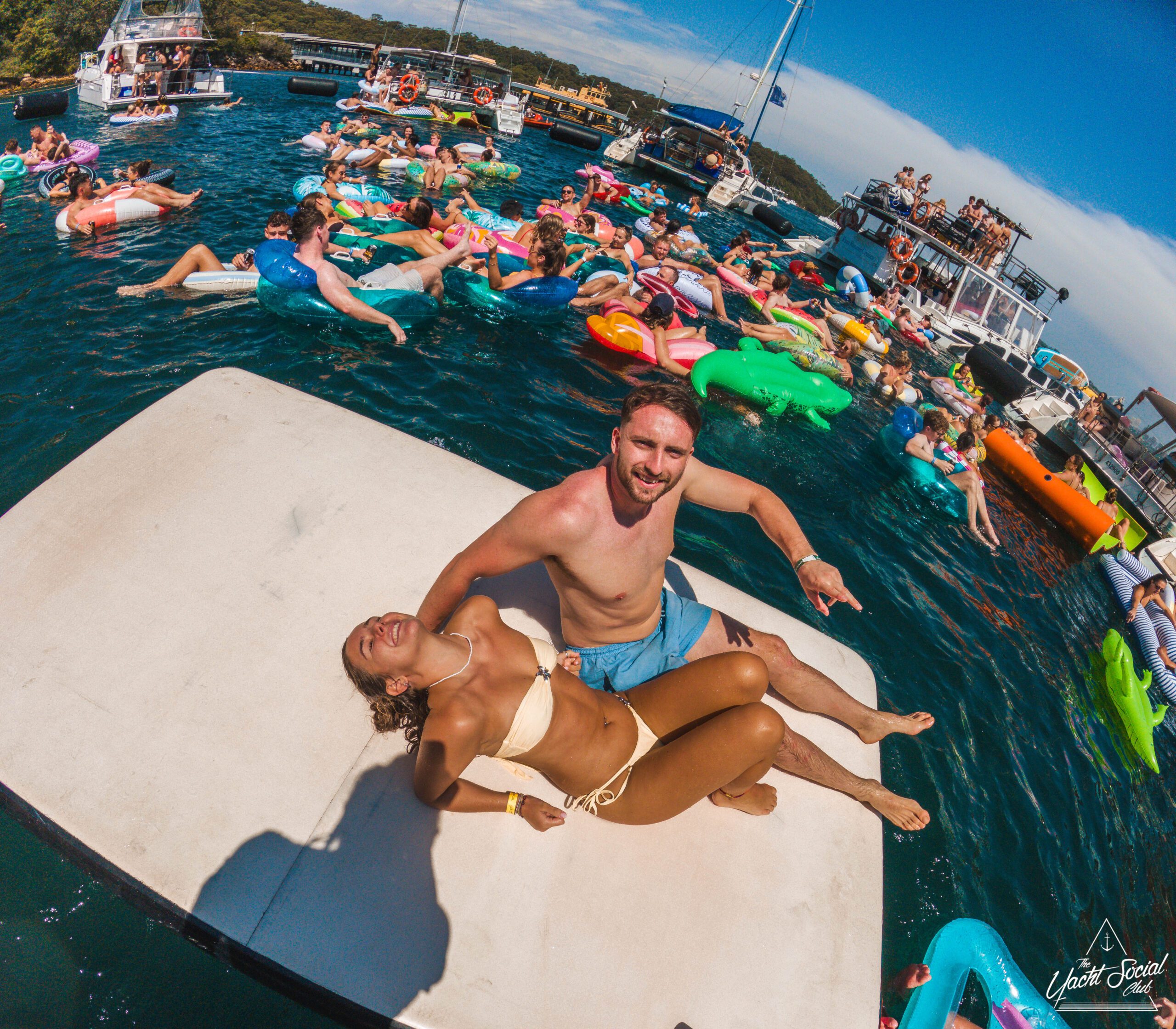 A smiling man and woman in swimsuits pose on a floating mat in the water, surrounded by people on floaties and boats under a bright blue sky. The scene is lively and joyful, with a summer party atmosphere.