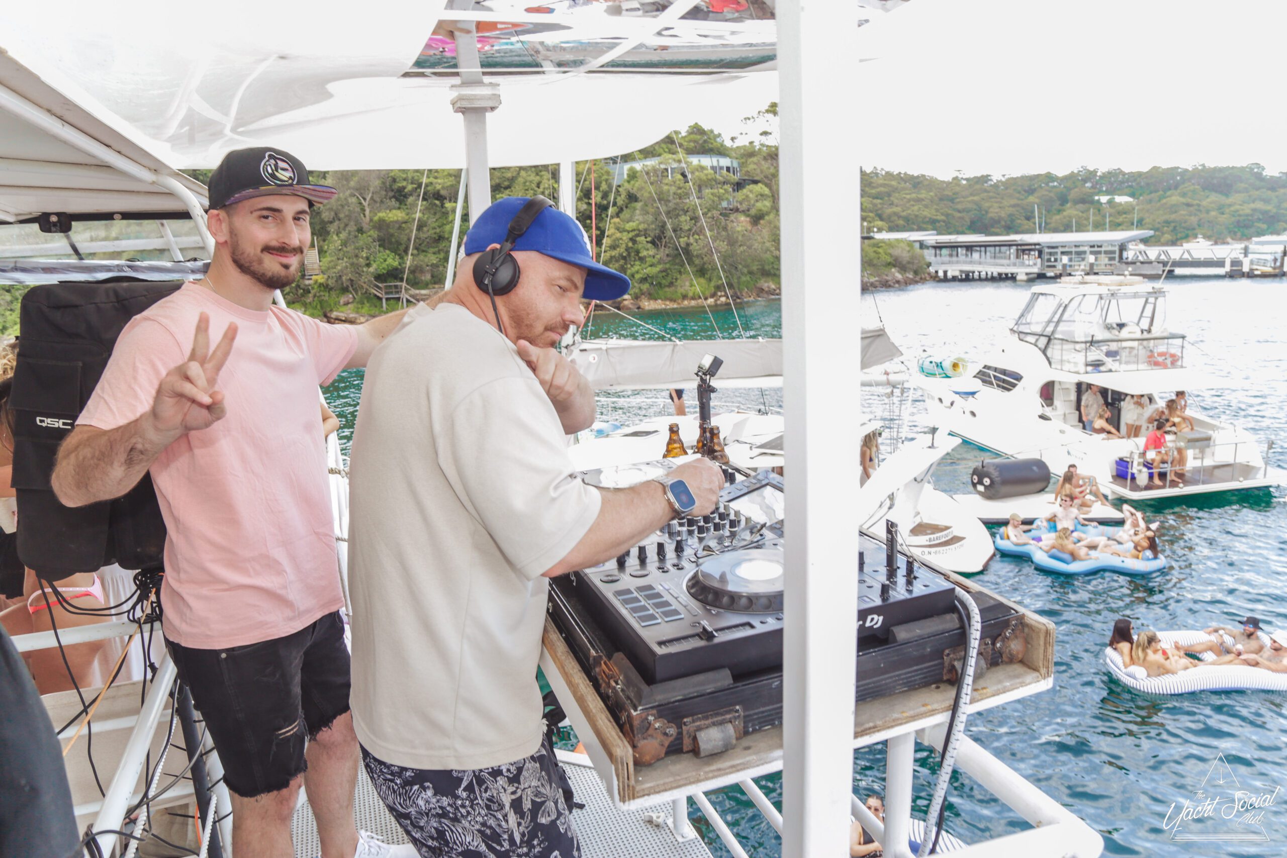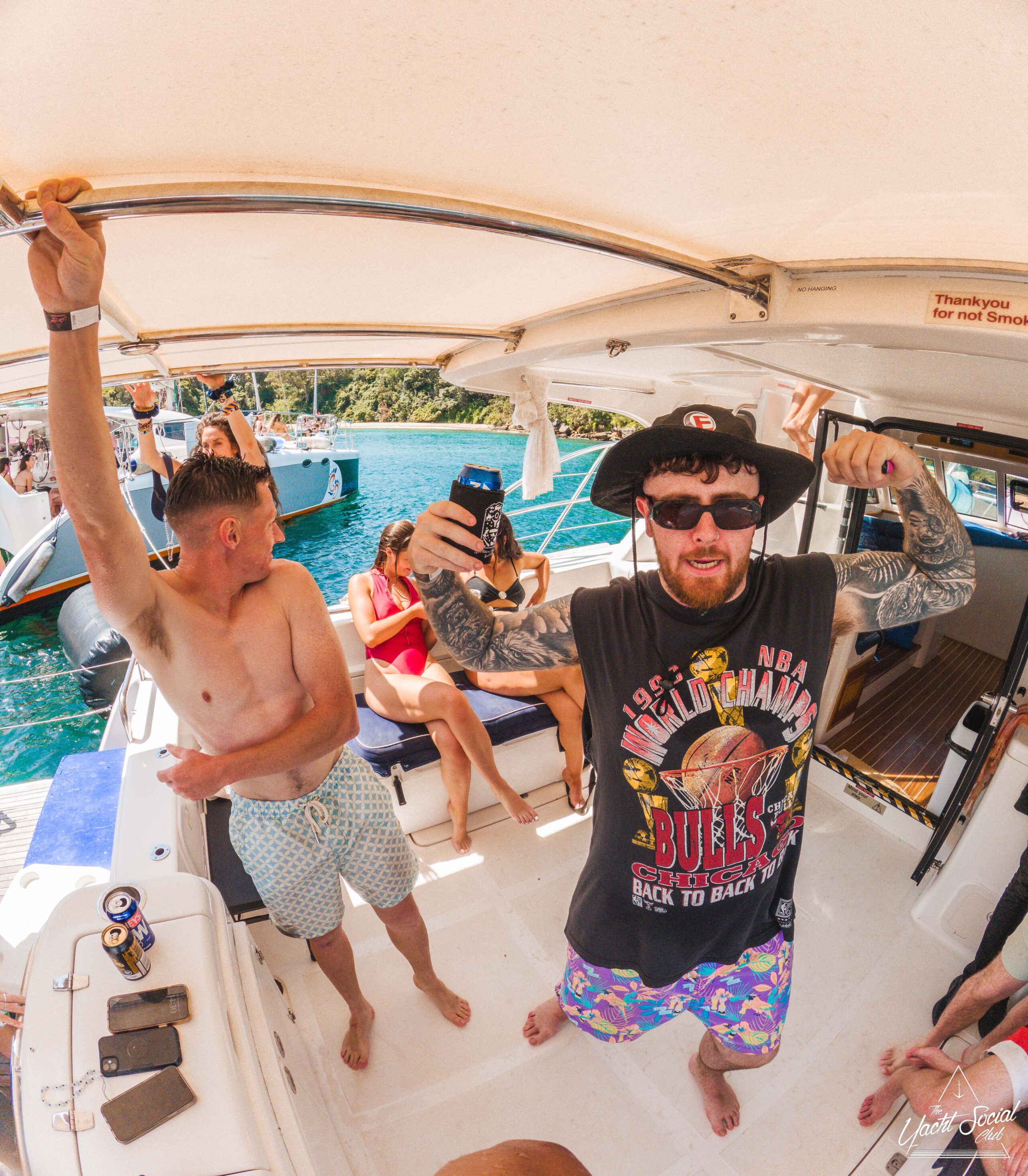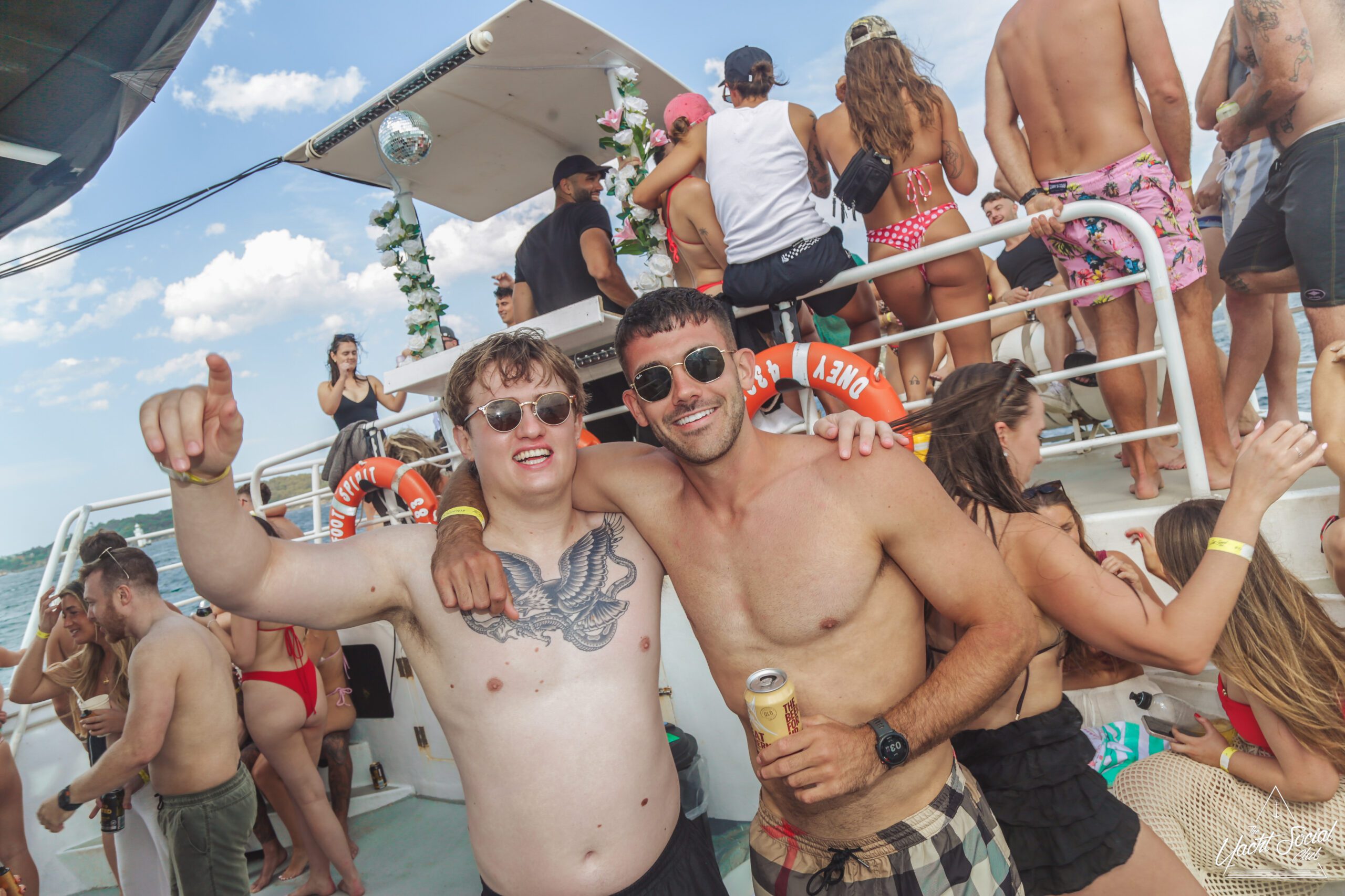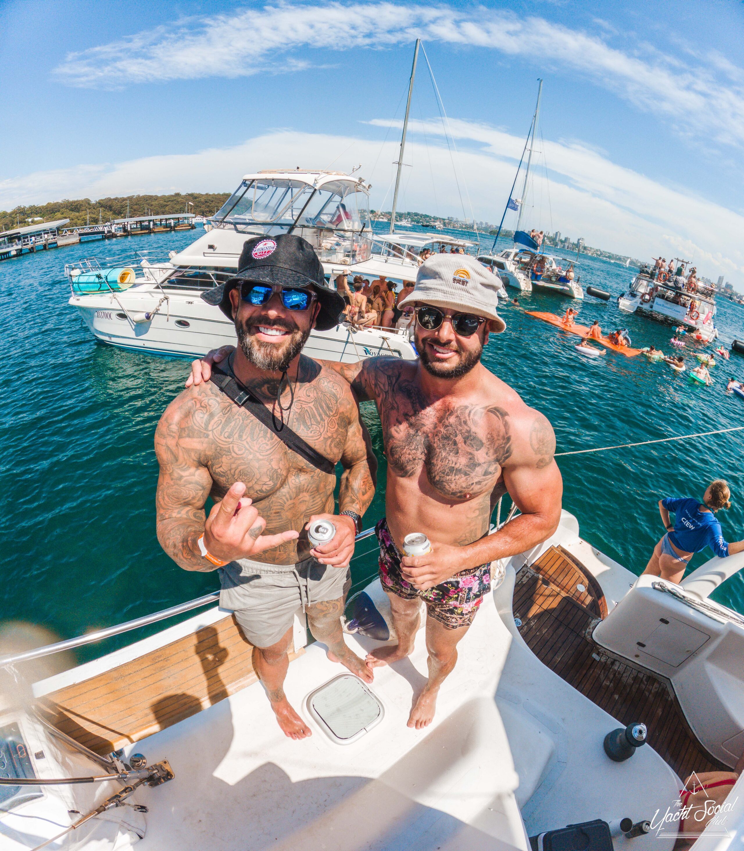 Two tattooed men in swim shorts and hats stand smiling on a boat, holding drinks. Behind them, people relax on other boats and inflatables on the water under a blue sky. It appears to be a lively summer gathering.