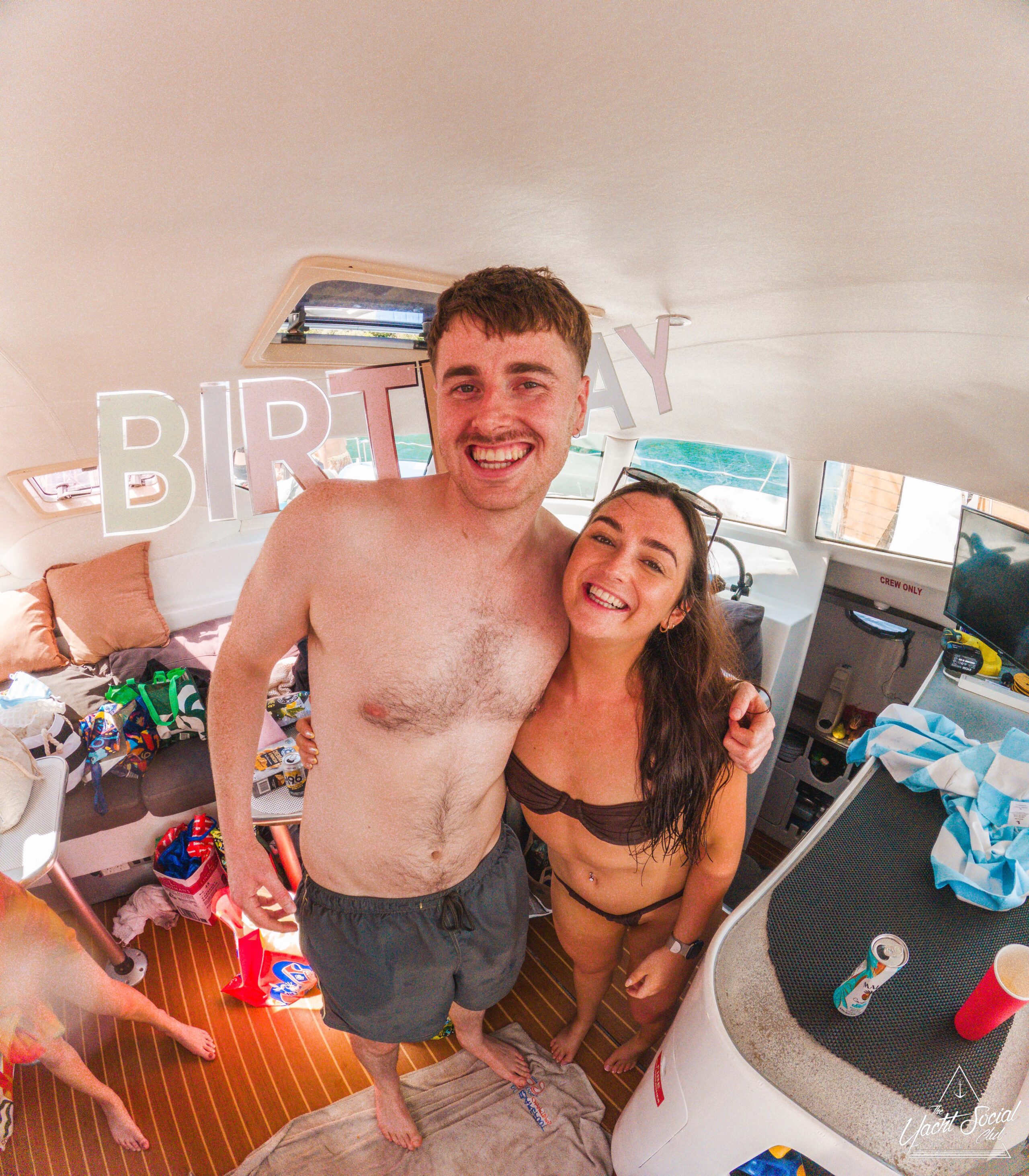 A smiling man and woman in swimsuits stand close together on a boat decorated with "BIRTHDAY" letters. The boat interior appears festive, with drinks and swim gear scattered around.