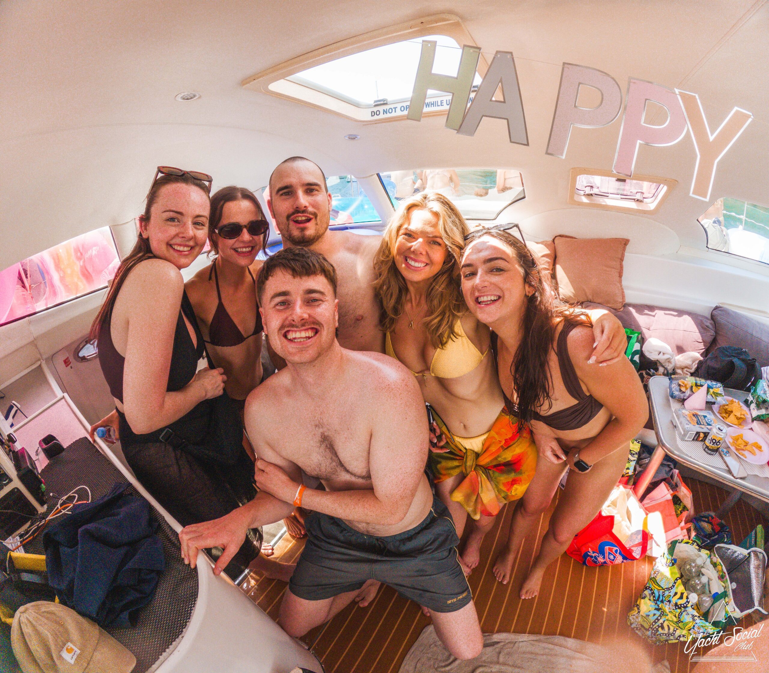 A group of six young adults in swimsuits smile and pose together inside a boat. Festive "HAPPY" letters hang above them, and sunlight shines through the windows, giving a cheerful, vacation vibe.