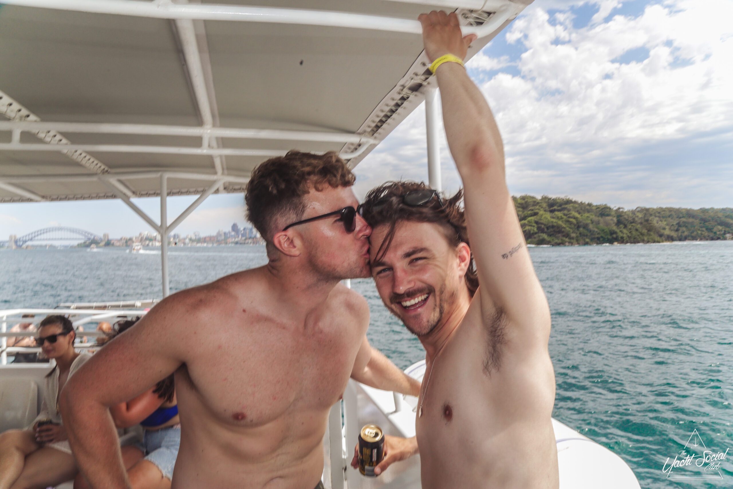 Two shirtless men smile on a boat; one kisses the other on the cheek. They're surrounded by water with trees and buildings in the background. Other people relax nearby. It’s a sunny day with scattered clouds in the sky.
