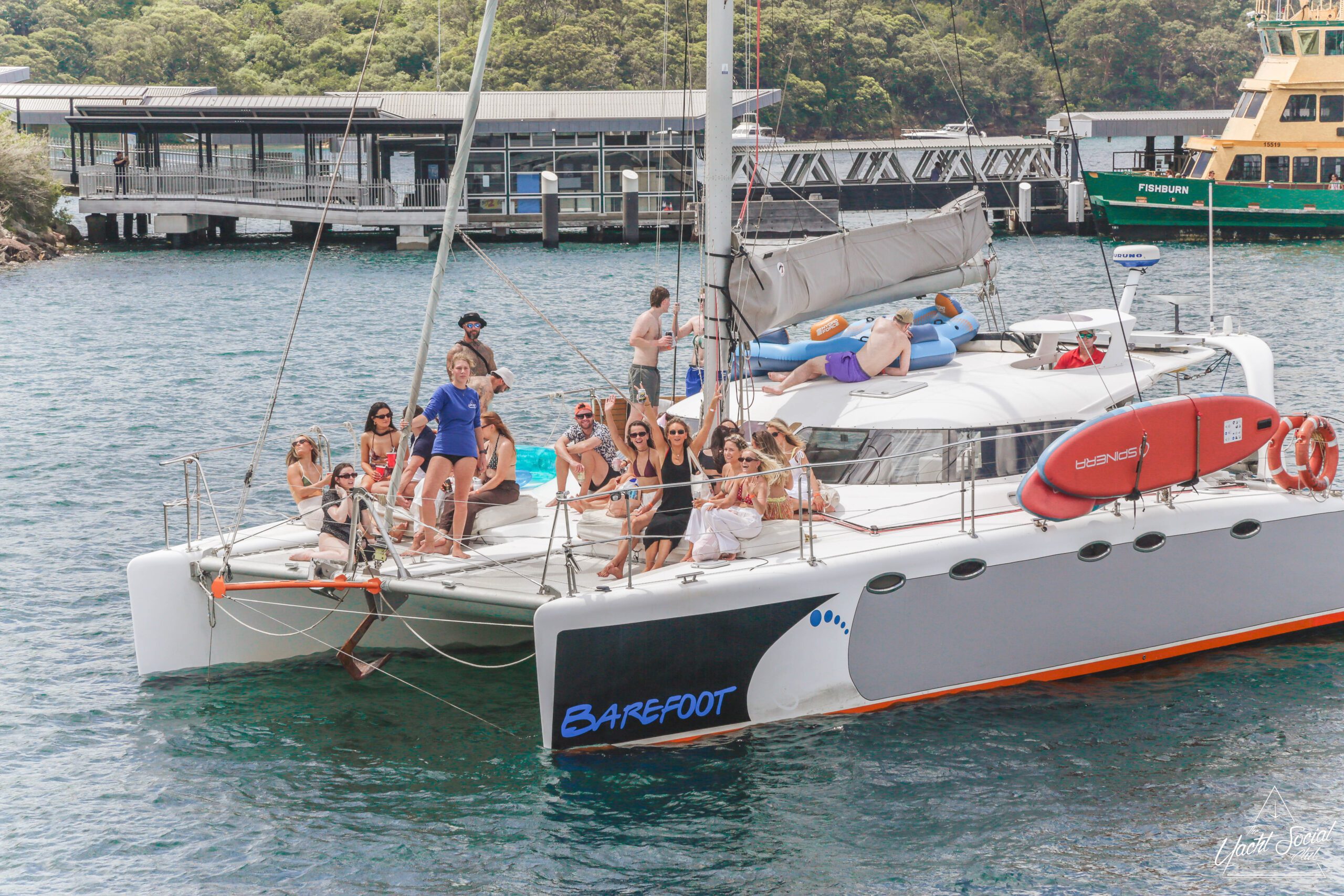 A group of people are relaxing and posing for photos on a white catamaran named "Barefoot" anchored near a dock, with trees and buildings in the background. Some are sitting, while others stand on the deck and netting.