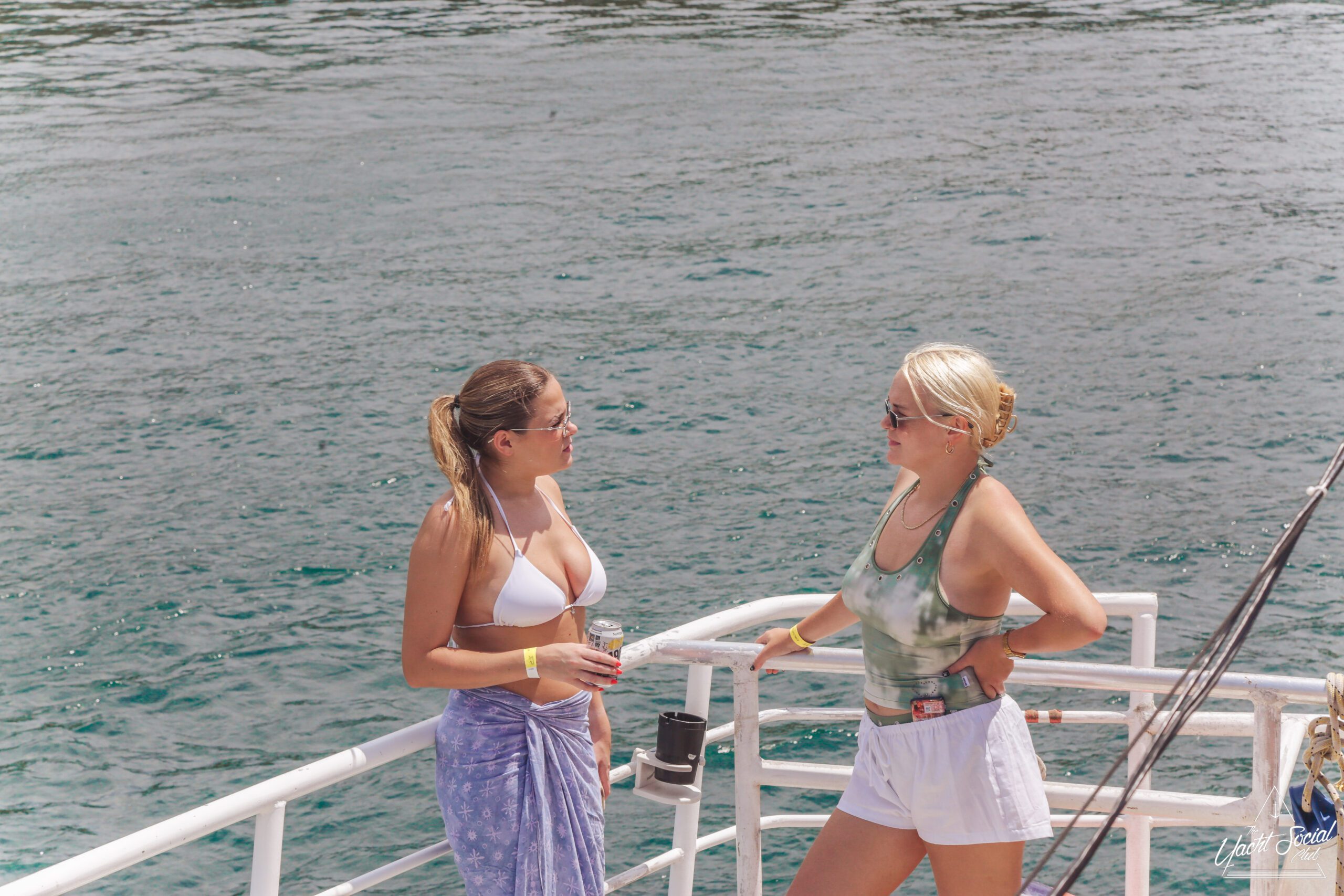 Two women stand on a boat, talking and smiling. One wears a white bikini top and wrap skirt, the other a green tank top and white shorts. The ocean is in the background. Both wear sunglasses and wristbands.