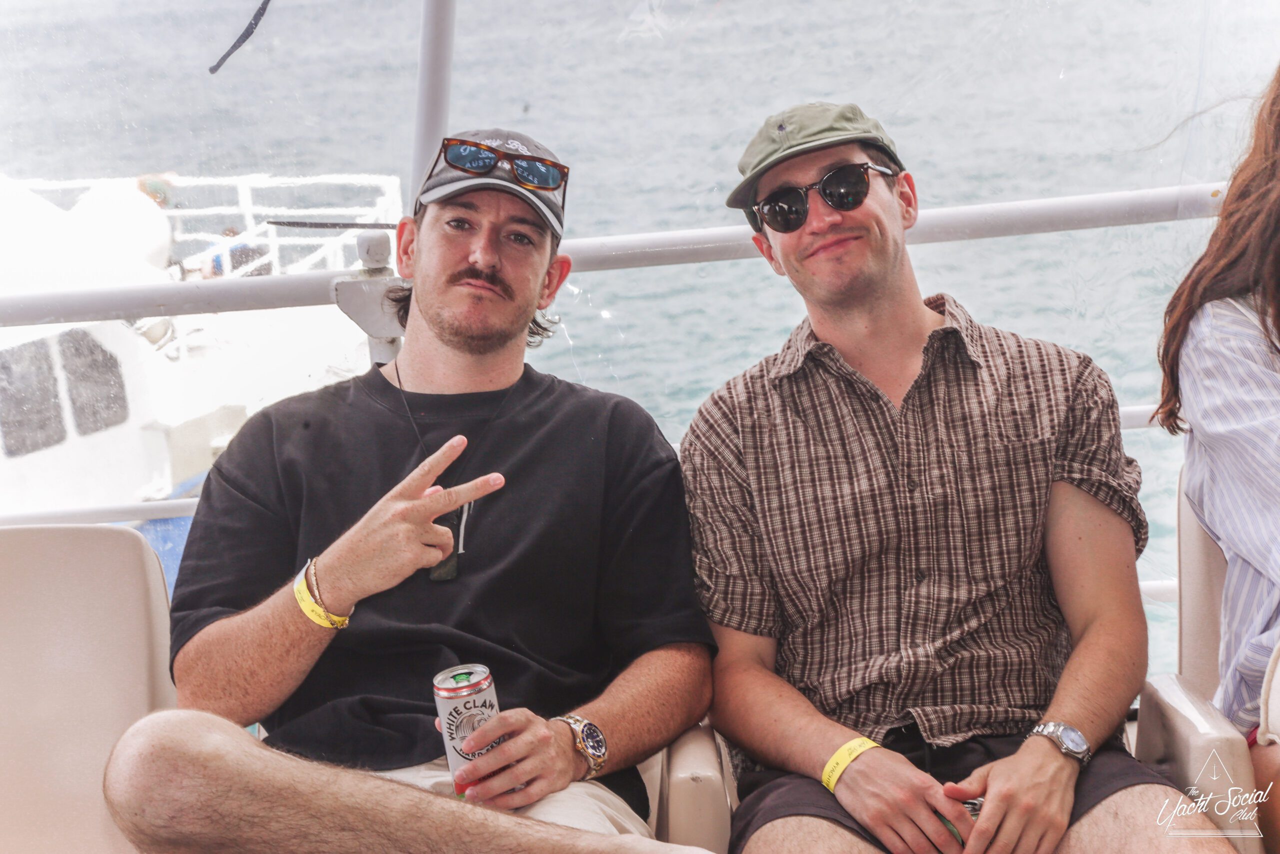 Two men sit side by side on a boat. One makes a peace sign and holds a can, both wear sunglasses, hats, and wristbands. The ocean and part of the boat are visible in the background.